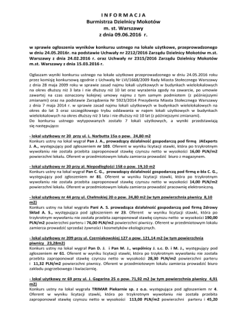 INFORMACJA Burmistrza Dzielnicy Mokotów m. st. Warszawy z dnia 09.06.2016 r. w sprawie ogłoszenia wyników konkursu ustnego na lokale użytkowe, przeprowadzonego w dniu 24.05.2016r. na podstawie Uchwały nr 2212/2016 Zarządu Dzielnicy Mokotów m.st. Warszawy z dnia 24.02.2016 r. oraz Uchwały nr 2315/2016 Zarządu Dzielnicy Mokotów m.st. Warszawy z dnia 15.03.2016 r. Ogłaszam wyniki konkursu ustnego na lokale użytkowe przeprowadzonego w dniu 24.05.2016 roku przez komisję konkursową zgodnie z Uchwałą Nr LVI/1668/2009 Rady Miasta Stołecznego Warszawy z dnia 28 maja 2009 roku w sprawie zasad najmu lokali użytkowych w budynkach wielolokalowych na okres dłuższy niż 3 lata i nie dłuższy niż 10 lat oraz wyrażenia zgody na zawarcie, po umowie zawartej na czas oznaczony kolejnej umowy najmu z tym samym podmiotem (z późniejszymi zmianami) oraz na podstawie Zarządzenia Nr 5923/2014 Prezydenta Miasta Stołecznego Warszawy z dnia 7 maja 2014 r. w sprawie zasad najmu lokali użytkowych w budynkach wielolokalowych na okres do lat 3 oraz szczegółowego trybu oddawania w najem lokali użytkowych w budynkach wielolokalowych na okres dłuższy niż 3 lata i nie dłuższy niż 10 lat (z późniejszymi zmianami). Do konkursu ustnego wytypowanych zostało 7 lokali użytkowych, a wyniki przedstawiają się następująco: - lokal użytkowy nr 20 przy ul. L. Narbutta 15a o pow. 24,80 m2 Konkurs ustny na lokal wygrał Pan J. A., prowadzący działalność gospodarczą pod firmą JAExperts J. A., występujący pod zgłoszeniem nr 103. Oferent w wyniku licytacji stawki, która po trzykrotnym wywołaniu nie została przebita zaproponował stawkę czynszu netto w wysokości 16,00 PLN/m2 powierzchni lokalu. Oferent w przedmiotowym lokalu zamierza prowadzić biuro z magazynem. - lokal użytkowy nr 20 przy al. Niepodległości 158 o pow. 19,10 m2 Konkurs ustny na lokal wygrał Pan C. G., prowadzący działalność gospodarczą pod firmą e-bla C. G., występujący pod zgłoszeniem nr 81. Oferent w wyniku licytacji stawki, która po trzykrotnym wywołaniu nie została przebita zaproponował stawkę czynszu netto w wysokości 14,00 PLN/m2 powierzchni lokalu. Oferent w przedmiotowym lokalu zamierza prowadzić pracownię elektroniczną. - lokal użytkowy nr 44 przy ul. Chełmskiej 20 o pow. 24,80 m2 (w tym powierzchnia piwnicy 8,10 m2) Konkurs ustny na lokal wygrała Pani A. S. prowadząca działalność gospodarczą pod firmą Zdrowy Skład A. S., występująca pod zgłoszeniem nr 23. Oferent w wyniku licytacji stawki, która po trzykrotnym wywołaniu nie została przebita zaproponował stawkę czynszu netto w wysokości 190,00 PLN/m2 powierzchni parteru i 76,00 PLN/m2 powierzchni piwnicy. Oferent w przedmiotowym lokalu zamierza prowadzić sprzedaż żywności i kosmetyków ekologicznych. - lokal użytkowy nr 209 przy ul. Czerniakowskiej 127 o pow. 121,14 m2 (w tym powierzchnia piwnicy 23,28m2) Konkurs ustny na lokal wygrał Pan D. J. i Pan M. J., wspólnicy J. s.c. D. i M. J., występujący pod zgłoszeniem nr 61. Oferent w wyniku licytacji stawki, która po trzykrotnym wywołaniu nie została przebita zaproponował stawkę czynszu netto w wysokości 28,30 PLN/m2 powierzchni parteru i 11,32 PLN/m2 powierzchni piwnicy. Oferent w przedmiotowym lokalu zamierza prowadzić biuro zakładu pogrzebowego i kwiaciarnię. - lokal użytkowy nr 69 przy ul. J. Gagarina 25 o pow. 71,92 m2 (w tym powierzchnia piwnicy 4,91 m2) Konkurs ustny na lokal wygrała TRIMAR Piekarnie sp. z o.o. występująca pod zgłoszeniem nr 4. Oferent w wyniku licytacji stawki, która po trzykrotnym wywołaniu nie została przebita zaproponował stawkę czynszu netto w wysokości 113,00 PLN/m2 powierzchni parteru i 45,20 PLN/m2 powierzchni piwnicy. Oferent w przedmiotowym lokalu zamierza prowadzić sprzedaż pieczywa, wyrobów ciastkarskich, mięsa, wędliny, soków, napojów. - lokal użytkowy nr U-1 przy ul. Ligockiej 8 o pow. 24,10 m2 Konkurs ustny na lokal wygrał Pan R. W., występujący pod zgłoszeniem nr 42. Oferent w wyniku licytacji stawki, która po trzykrotnym wywołaniu nie została przebita zaproponował stawkę czynszu netto w wysokości 84,00 PLN/m2 powierzchni lokalu. Oferent w przedmiotowym lokalu zamierza prowadzić salon pedicure i manicure. - lokal użytkowy nr LU-2 przy ul. Puławskiej 5 o pow. 120,06 m2 (w tym powierzchnia piwnicy 23,89 m2) Na w/w lokal nikt nie złożył zgłoszenia. Lokal zostanie przeznaczony do najmu w ponownym konkursie. BURMISTRZ DZIELNICY MOKOTÓW M.ST. WARSZAWY /-/ Bogdan Olesiński