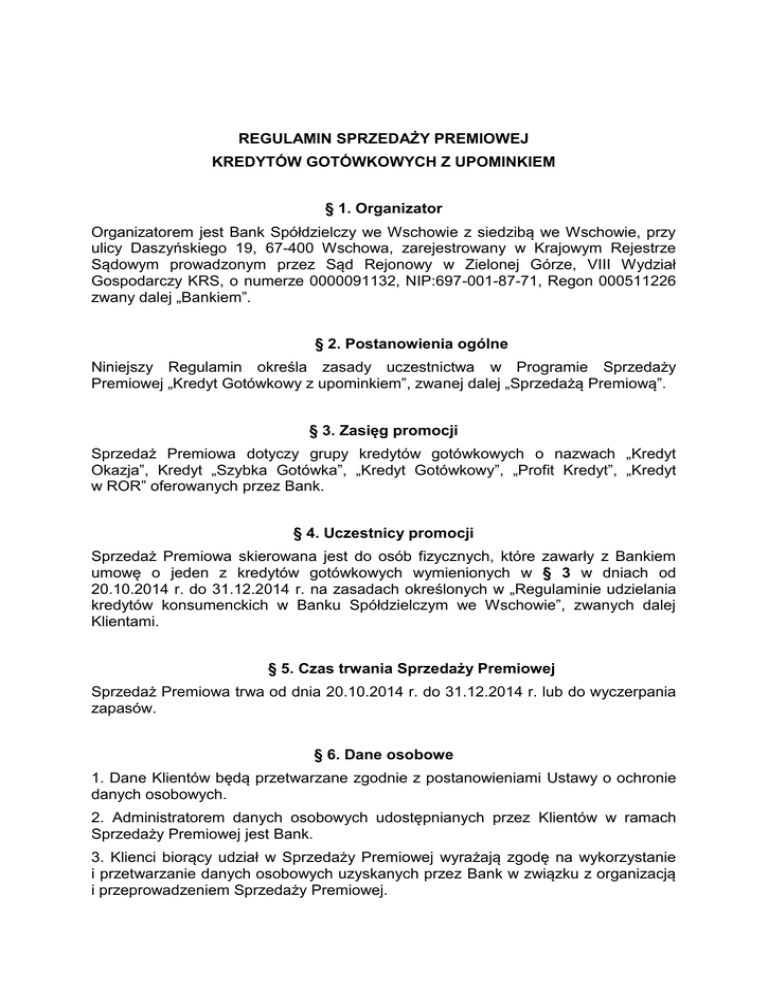 REGULAMIN SPRZEDAŻY PREMIOWEJ KREDYTÓW GOTÓWKOWYCH Z UPOMINKIEM § 1. Organizator Organizatorem jest Bank Spółdzielczy we Wschowie z siedzibą we Wschowie, przy ulicy Daszyńskiego 19, 67-400 Wschowa, zarejestrowany w Krajowym Rejestrze Sądowym prowadzonym przez Sąd Rejonowy w Zielonej Górze, VIII Wydział Gospodarczy KRS, o numerze 0000091132, NIP:697-001-87-71, Regon 000511226 zwany dalej „Bankiem”. § 2. Postanowienia ogólne Niniejszy Regulamin określa zasady uczestnictwa w Programie Sprzedaży Premiowej „Kredyt Gotówkowy z upominkiem”, zwanej dalej „Sprzedażą Premiową”. § 3. Zasięg promocji Sprzedaż Premiowa dotyczy grupy kredytów gotówkowych o nazwach „Kredyt Okazja”, Kredyt „Szybka Gotówka”, „Kredyt Gotówkowy”, „Profit Kredyt”, „Kredyt w ROR” oferowanych przez Bank. § 4. Uczestnicy promocji Sprzedaż Premiowa skierowana jest do osób fizycznych, które zawarły z Bankiem umowę o jeden z kredytów gotówkowych wymienionych w § 3 w dniach od 20.10.2014 r. do 31.12.2014 r. na zasadach określonych w „Regulaminie udzielania kredytów konsumenckich w Banku Spółdzielczym we Wschowie”, zwanych dalej Klientami. § 5. Czas trwania Sprzedaży Premiowej Sprzedaż Premiowa trwa od dnia 20.10.2014 r. do 31.12.2014 r. lub do wyczerpania zapasów. § 6. Dane osobowe 1. Dane Klientów będą przetwarzane zgodnie z postanowieniami Ustawy o ochronie danych osobowych. 2. Administratorem danych osobowych udostępnianych przez Klientów w ramach Sprzedaży Premiowej jest Bank. 3. Klienci biorący udział w Sprzedaży Premiowej wyrażają zgodę na wykorzystanie i przetwarzanie danych osobowych uzyskanych przez Bank w związku z organizacją i przeprowadzeniem Sprzedaży Premiowej. § 7. Warunki uczestnictwa Warunki uczestnictwa: - złożenie przez Klienta wniosku o jeden z wymienionych w § 3 kredytów gotówkowych na kwotę 10 000 zł lub wyższą. Wniosek o kredyt gotówkowy zostanie pozytywnie rozpatrzony przez Bank i kwota kredytu zostanie wypłacona lub przekazana na rachunek Klienta, - terminowa spłata zobowiązań z tytułu innych kredytów udzielonych przez Bank, - Klient może skorzystać ze Sprzedaży Premiowej tylko jeden raz. § 8. Nagrody 1. Po spełnieniu warunków określonych w § 4 niniejszego Regulaminu, Klientowi przysługuje nagroda. 2. Nagrodą w Sprzedaży Premiowej jest kubek termiczny o wartości 23,99 zł brutto każdy. Pula nagród obejmuje 500 sztuk kubków. 3. Klient otrzyma nagrodę po spełnieniu warunków uczestnictwa określonych w § 7 niniejszego Regulaminu. 4. Wzór przekazania upominku w postaci kubka termicznego stanowi załącznik nr 1 do Regulaminu Sprzedaży Premiowej Kredytów Gotówkowych z upominkiem. § 9. Podatek od nagród Zgodnie z art.21 ust.1 pkt. 68 ustawy z dnia 26 lipca 1991 r. o podatku dochodowym od osób fizycznych wolna od podatku jest wartość nagrody otrzymanej w związku ze Sprzedażą Premiową, jeżeli jednorazowa wartość nagrody nie przekracza 760,00 złotych. § 10. Reklamacje Tryb oraz zasady składania i rozpatrywania reklamacji określone są w „Regulaminie udzielania kredytów konsumenckich w Banku Spółdzielczym we Wschowie”. § 11. Przepisy końcowe 1. Niniejszy Regulamin jest jedynym dokumentem określającym szczegółowe zasady Sprzedaży Premiowej. 2. W sprawach nieuregulowanych niniejszym Regulaminem zastosowanie mają postanowienia zawarte w „Regulaminie udzielania kredytów konsumenckich w Banku Spółdzielczym we Wschowie” i odpowiednich umowach produktowych oraz przepisy powszechnie obowiązujące. 3. Bank ma prawo do wydłużenia lub skrócenia czasu trwania Sprzedaży Premiowej oraz do wprowadzenia zmian w niniejszym Regulaminie w przypadku: a) zmian w funkcjonowania oferowanych produktów i usług, b) zmian systemów informatycznych wykorzystywanych do obsługi oferowanych produktów i usług, c) zmian przepisów prawa regulujących funkcjonowanie produktów bankowych, d) zmiany poziomu inflacji, e) wyczerpania nagród. Regulamin Sprzedaży Premiowej jest dostępny w placówkach Banku oraz na stronie internetowej www.bswschowa.pl.