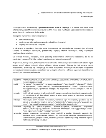 „… cierpienie może być przetworzone nie tylko w sztukę ale i w życie.” Francie Shapiro 23 lutego został ustanowiony Ogólnopolski Dzień Walki z Depresją – W Polsce ten dzień został ustanowiony przez Ministerstwo Zdrowia w 2001 roku. Ideą święta jest upowszechnienie wiedzy na temat depresji i zachęcenie do leczenia. Najczęściej wymieniane objawy depresji to: obniżenie nastroju, zmniejszenie albo zanik odczuwania radości i przyjemności, częściej odczuwany lęk i niepokój. W skrajnych przypadkach depresja może doprowadzić do samobójstwa. Depresja jest chorobą. Czasem, w trudnych sytuacjach, przeżywamy kryzysy, którym towarzyszą stany depresyjne i zachowania samobójcze. Czy istnieje metoda, narzędzie, które pozwolą przeciętnemu człowiekowi rozpoznać, że ma do czynienia z kryzysem? W kilku krokach przedstawimy, jak można to robić? Po pierwsze, należy uznać, że funkcjonowanie człowieka odbywa się w pięciu obszarach: obszar myśli, obszar uczuć, obszar intencji, obszar działań, obszar wrażeń. Obszary te, jak system naczyń połączonych, przenikają się i wpływają na siebie wzajemnie. Pierwszym skutecznym narzędziem, pozwalającym rozpoznać, jaki proces toczy się w drugim człowieku i jaki stan wywołuje (radość versus smutek) jest obserwacja obszarów. OBSZARY PRZYKŁADOWE REAKCJE, CHARAKTERYZUJĄCE CZŁOWIEKA W TRUDNEJ SYTUACJI, które możemy zaobserwować myśli "to koniec", "beznadzieja", "to niesprawiedliwość", "o co chodzi?", "dlaczego?", "dłużej nie wytrzymam", "chyba zwariuję", "musi być jakieś wyjście", "chaos", "co jeszcze może mi się przydarzyć?", "jestem do niczego", "to moja wina", "co inni pomyślą?", "nie ma wyjścia” uczucia złość, żal, lęk, smutek, strach, wściekłość, rozpacz, zwątpienie, bezsilność, osamotnienie, poczucie izolacji, ból, bezradność, poczucie winy, wstyd, poczucie zagrożenia, nadzieja, zwątpienie, apatia, tęsknota intencje "skończyć z tym", "uciec", "zawalczyć", "schować się", "rozwiązać", "postarać się nie pławić w emocjach", "znaleźć pomoc", "zobojętnieć", "zaakceptować", "pogodzić się z tym", "nie zawieść pomimo wszystko", "zrobić coś by się skończyło” działania "wycofuję się", "proszę o pomoc", "podejmuję ryzyko", "rozmawiam", "organizuję pomoc", "tłumaczę się", "czekam", "zdobywam informacje", "nie daję poznać po sobie", "uczę się nowych rzeczy", "walczę", "uciekam” wrażenia spięcie, zmęczenie, bezsenność, płacz, suchość w gardle, dławienie, pocenie się, kołatanie serca, rozkojarzenie, drżenia, tiki, zaburzenia łaknienia, mimowolne ruchy, ucisk w żołądku, gorąco - zimno, duszność, poczucie ciężaru rąk i nóg, wrażenie ciężaru na klatce piersiowej, ból głowy Opracowano w Zespole Służby Medycyny Pracy i BHP TYDZIEŃ WALKI Z DEPRESJĄ W Służbie Więziennej 23-29-2015 r. 1 Obserwacja, poznanie opisanych obszarów funkcjonowania człowieka, pozwala wyrobić sobie subiektywny pogląd, na temat stanu, w jakim znajduje się dana osoba i spróbować ocenić, czy osoba ta osoba zagraża sobie i innym. Poniżej przedstawiono zestaw zachowań, wskazanych versus zakazanych do zastosowania wobec osoby zagrożonej samobójstwem. WSKAZANIA W KONTAKCIE Z OSOBĄ ZAGROŻONĄ SAMOBÓJSTWEM prowokować i zachęcać do „wygadania się”, tworzyć atmosferę pełnej akceptacji (osoby zagrożonej samobójstwem), otwarcie podejmować temat, zadawać pytania, ocenić zagrożenie – myśli, plany, fantazje, kontrolować sytuację, wydobywać, podkreślać „mocne strony” i zasoby wewnętrzne osoby, odwoływać się do wcześniej przeżytych trudnych sytuacji, z którymi osoba sobie poradziła skutecznie, zorganizować system wsparcia, pokazywać tymczasowość sytuacji, otwierać perspektywy, możliwości, kierować do specjalisty – konkretnej osoby (uprzedzonej o sytuacji), wezwać pomoc lekarską. PRZECIWWSKAZANIA W KONTAKCIE Z OSOBĄ ZAGROŻONĄ SAMOBÓJSTWEM zbyt szybkie oceniane – tzw. etykietowanie, powoływanie się na własny system wartości, lekceważenie problemów osoby zagrożonej samobójstwem, zbyt szybkie kończenie kontaktu – ze względu na brak czasu, ograniczanie czasu spotkania, rozmowy, zadawanie pytań w formie „przesłuchania”, wymuszanie zobowiązań, podejmowania decyzji, dokonywania wyborów, używanie sloganów w stylu „wszystko będzie dobrze”, „to nie jest aż taki problem”, „weź się w garść” itp., dawać „dobrych rad”, wzbudzanie poczucia winy, ujawnianie własnych negatywnych stanów emocjonalnych – np.: zniecierpliwienia, zniechęcenia, złości itp., zostawianie osoby bez opieki, pomocy, obiecywanie podjęcia nierealnych działań na rzecz osoby zagrożonej samobójstwem. W dalszej części przedstawiono praktyczne zastosowanie narzędzia, jakim jest „koło świadomości” opisane przez N. Newfielda, szefa Centrum Terapii Rodzin Wydziału Medycyny Behawioralnej Uniwersytetu Zachodniej Virginii1. Jest to proste, ale bardzo efektywne narzędzie do identyfikacji 1 Richard K. James, Burl E. Gilliland „Strategie interwencji krzyzsowej”, Wyd. PARPAMEDIA, Warszawa, 2010 Opracowano w Zespole Służby Medycyny Pracy i BHP TYDZIEŃ WALKI Z DEPRESJĄ W Służbie Więziennej 23-29-2015 r. 2 i różnicowania treści psychicznych pojawiających się w związku z doświadczaniem jakiejś sytuacji problemowej w pięciu obszarach funkcjonowania: myśli, uczuć, intencji, działań i wrażeń. Codziennie kontaktujemy się z ludźmi – bliskim, współpracownikami i tymi, spotkanymi przypadkiem, w sklepie, urzędzie, w komunikacji miejskiej. Każdy jest inny, każdy ma swoją historię. Każdy do czegoś dąży, albo właśnie zagubił się na swojej drodze. Jedni okazują radość, inni smutek, u innych możemy zobaczyć pasję, jest też stres, zniecierpliwienie. Takie emocje pojawiają się jako rezultat myśli – jak myślisz, tak się czujesz i tak 