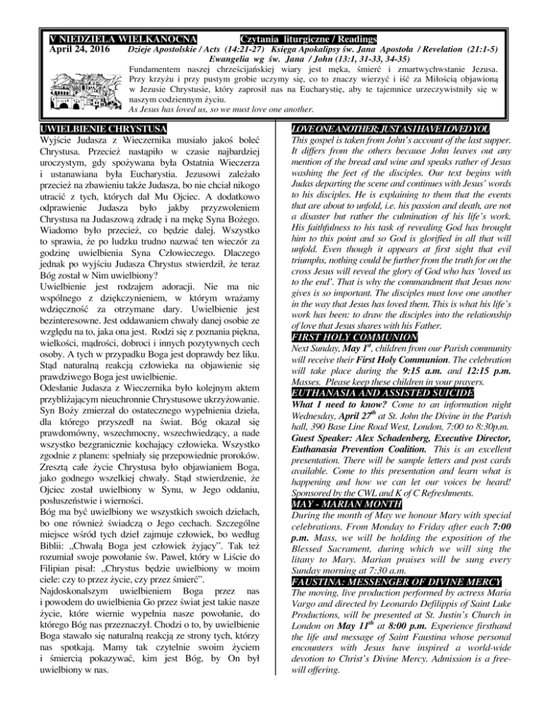 V NIEDZIELA WIELKANOCNA Czytania liturgiczne / Readings April 24, 2016 Dzieje Apostolskie / Acts (14:21-27) Księga Apokalipsy św. Jana Apostoła / Revelation (21:1-5) Ewangelia wg św. Jana / John (13:1, 31-33, 34-35) Fundamentem naszej chrześcijańskiej wiary jest męka, śmierć i zmartwychwstanie Jezusa. Przy krzyżu i przy pustym grobie uczymy się, co to znaczy wierzyć i iść za Miłością objawioną w Jezusie Chrystusie, który zaprosił nas na Eucharystię, aby te tajemnice urzeczywistniły się w naszym codziennym życiu. As Jesus has loved us, so we must love one another. UWIELBIENIE CHRYSTUSA Wyjście Judasza z Wieczernika musiało jakoś boleć Chrystusa. Przecież nastąpiło w czasie najbardziej uroczystym, gdy spożywana była Ostatnia Wieczerza i ustanawiana była Eucharystia. Jezusowi zależało przecież na zbawieniu także Judasza, bo nie chciał nikogo utracić z tych, których dał Mu Ojciec. A dodatkowo odprawienie Judasza było jakby przyzwoleniem Chrystusa na Judaszową zdradę i na mękę Syna Bożego. Wiadomo było przecież, co będzie dalej. Wszystko to sprawia, że po ludzku trudno nazwać ten wieczór za godzinę uwielbienia Syna Człowieczego. Dlaczego jednak po wyjściu Judasza Chrystus stwierdził, że teraz Bóg został w Nim uwielbiony? Uwielbienie jest rodzajem adoracji. Nie ma nic wspólnego z dziękczynieniem, w którym wrażamy wdzięczność za otrzymane dary. Uwielbienie jest bezinteresowne. Jest oddawaniem chwały danej osobie ze względu na to, jaka ona jest. Rodzi się z poznania piękna, wielkości, mądrości, dobroci i innych pozytywnych cech osoby. A tych w przypadku Boga jest doprawdy bez liku. Stąd naturalną reakcją człowieka na objawienie się prawdziwego Boga jest uwielbienie. Odesłanie Judasza z Wieczernika było kolejnym aktem przybliżającym nieuchronnie Chrystusowe ukrzyżowanie. Syn Boży zmierzał do ostatecznego wypełnienia dzieła, dla którego przyszedł na świat. Bóg okazał się prawdomówny, wszechmocny, wszechwiedzący, a nade wszystko bezgranicznie kochający człowieka. Wszystko zgodnie z planem: spełniały się przepowiednie proroków. Zresztą całe życie Chrystusa było objawianiem Boga, jako godnego wszelkiej chwały. Stąd stwierdzenie, że Ojciec został uwielbiony w Synu, w Jego oddaniu, posłuszeństwie i wierności. Bóg ma być uwielbiony we wszystkich swoich dziełach, bo one również świadczą o Jego cechach. Szczególne miejsce wśród tych dzieł zajmuje człowiek, bo według Biblii: „Chwałą Boga jest człowiek żyjący”. Tak też rozumiał swoje powołanie św. Paweł, który w Liście do Filipian pisał: „Chrystus będzie uwielbiony w moim ciele: czy to przez życie, czy przez śmierć”. Najdoskonalszym uwielbieniem Boga przez nas i powodem do uwielbienia Go przez świat jest takie nasze życie, które wiernie wypełnia nasze powołanie, do którego Bóg nas przeznaczył. Chodzi o to, by uwielbienie Boga stawało się naturalną reakcją ze strony tych, którzy nas spotkają. Mamy tak czytelnie swoim życiem i śmiercią pokazywać, kim jest Bóg, by On był uwielbiony w nas. LOVE ONE ANOTHER; JUST AS I HAVE LOVEDYOU This gospel is taken from John’s account of the last supper. It differs from the others because John leaves out any mention of the bread and wine and speaks rather of Jesus washing the feet of the disciples. Our text begins with Judas departing the scene and continues with Jesus’ words to his disciples. He is explaining to them that the events that are about to unfold, i.e. his passion and death, are not a disaster but rather the culmination of his life’s work. His faithfulness to his task of revealing God has brought him to this point and so God is glorified in all that will unfold. Even though it appears at first sight that evil triumphs, nothing could be further from the truth for on the cross Jesus will reveal the glory of God who has ‘loved us to the end’. That is why the commandment that Jesus now gives is so important. The disciples must love one another in the way that Jesus has loved them. This is what his life’s work has been: to draw the disciples into the relationship of love that Jesus shares with his Father. FIRST HOLY COMMUNION Next Sunday, May 1st, children from our Parish community will receive their First Holy Communion. The celebration will take place during the 9:15 a.m. and 12:15 p.m. Masses. Please keep these children in your prayers. EUTHANASIA AND ASSISTED SUICIDE What I need to know? Come to an information night Wednesday, April 27th at St. John the Divine in the Parish hall, 390 Base Line Road West, London, 7:00 to 8:30p.m. Guest Speaker: Alex Schadenberg, Executive Director, Euthanasia Prevention Coalition. This is an excellent presentation. There will be sample letters and post cards available. Come to this presentation and learn what is happening and how we can let our voices be heard! Sponsored by the CWL and K of C Refreshments. MAY - MARIAN MONTH During the month of May we honour Mary with special celebrations. From Monday to Friday after each 7:00 p.m. Mass, we will be holding the exposition of the Blessed Sacrament, during which we will sing the litany to Mary. Marian praises will be sung every Sunday morning at 7:30 a.m. FAUSTINA: MESSENGER OF DIVINE MERCY The moving, live production performed by actress Maria Vargo and directed by Leonardo Defilippis of Saint Luke Productions, will be presented at St. Justin’s Church in London on May 11th at 8:00 p.m. Experience firsthand the life and message of Saint Faustina whose personal encounters with Jesus have inspired a world-wide devotion to Christ’s Divine Mercy. Admission is a freewill offering.