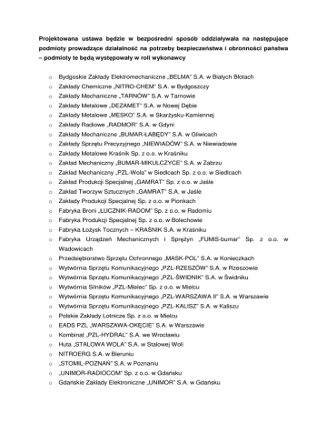 Projektowana ustawa będzie w bezpośredni sposób oddziaływała na następujące podmioty prowadzące działalność na potrzeby bezpieczeństwa i obronności państwa – podmioty te będą występowały w roli wykonawcy o Bydgoskie Zakłady Elektromechaniczne „BELMA” S.A. w Białych Błotach o Zakłady Chemiczne „NITRO-CHEM” S.A. w Bydgoszczy o Zakłady Mechaniczne „TARNÓW” S.A. w Tarnowie o Zakłady Metalowe „DEZAMET” S.A. w Nowej Dębie o Zakłady Metalowe „MESKO” S.A. w Skarżysku-Kamiennej o Zakłady Radiowe „RADMOR” S.A. w Gdyni o Zakłady Mechaniczne „BUMAR-ŁABĘDY” S.A. w Gliwicach o Zakłady Sprzętu Precyzyjnego „NIEWIADÓW” S.A. w Niewiadowie o Zakłady Metalowe Kraśnik Sp. z o.o. w Kraśniku o Zakład Mechaniczny „BUMAR-MIKULCZYCE” S.A. w Zabrzu o Zakład Mechaniczny „PZL-Wola” w Siedlcach Sp. z o.o. w Siedlcach o Zakład Produkcji Specjalnej „GAMRAT” Sp. z o.o. w Jaśle o Zakład Tworzyw Sztucznych „GAMRAT” S.A. w Jaśle o Zakłady Produkcji Specjalnej Sp. z o.o. w Pionkach o Fabryka Broni „ŁUCZNIK-RADOM” Sp. z o.o. w Radomiu o Fabryka Produkcji Specjalnej Sp. z o.o. w Bolechowie o Fabryka Łożysk Tocznych – KRAŚNIK S.A. w Kraśniku o Fabryka Urządzeń Mechanicznych i Sprężyn „FUMiS-bumar” Sp. z o.o. w Wadowicach o Przedsiębiorstwo Sprzętu Ochronnego „MASK-POL” S.A. w Konieczkach o Wytwórnia Sprzętu Komunikacyjnego „PZL-RZESZÓW” S.A. w Rzeszowie o Wytwórnia Sprzętu Komunikacyjnego „PZL-ŚWIDNIK” S.A. w Świdniku o Wytwórnia Silników „PZL-Mielec” Sp. z o.o. w Mielcu o Wytwórnia Sprzętu Komunikacyjnego „PZL-WARSZAWA II” S.A. w Warszawie o Wytwórnia Sprzętu Komunikacyjnego „PZL-KALISZ” S.A. w Kaliszu o Polskie Zakłady Lotnicze Sp. z o.o. w Mielcu o EADS PZL „WARSZAWA-OKĘCIE” S.A. w Warszawie o Kombinat „PZL-HYDRAL” S.A. we Wrocławiu o Huta „STALOWA WOLA” S.A. w Stalowej Woli o NITROERG S.A. w Bieruniu o „STOMIL-POZNAŃ” S.A. w Poznaniu o „UNIMOR-RADIOCOM” Sp. z o.o. w Gdańsku o Gdańskie Zakłady Elektroniczne „UNIMOR” S.A. w Gdańsku o Centrum Naukowo-Produkcyjne Elektroniki Profesjonalnej „RADWAR” S.A. w Warszawie o Przemysłowe Centrum Optyki S.A. w Warszawie o Stocznia Remontowa „NAUTA” S.A. w Gdyni o Morska Stocznia Remontowa S.A. w Świnoujściu o Szczecińska Stocznia Remontowa „GRYFIA” S.A. o Wojskowe Zakłady Motoryzacyjne S.A. w Poznaniu o Wojskowe Zakłady Mechaniczne S.A. w Siemianowicach Śląskich o Wojskowe Zakłady Inżynieryjne S.A. w Dęblinie o Wojskowe Zakłady Lotnicze Nr 1 S.A. w Łodzi o Wojskowe Zakłady Lotnicze Nr 2 S.A. w Bydgoszczy o Wojskowe Zakłady Lotnicze Nr 4 S.A. w Warszawie o Wojskowe Zakłady Uzbrojenia S.A. w Grudziądzu o Wojskowe Zakłady Elektroniczne S.A. w Zielonce o Wojskowe Zakłady Łączności Nr 1 S.A. w Zegrzu o Wojskowe Zakłady Łączności Nr 2 S.A. w Czernicy o Wojskowe Centralne Biuro Konstrukcyjno-Technologiczne S.A. w Warszawie o Stocznia Marynarki Wojennej S.A. w Gdyni w upadłości a także na następujące spółki realizujące obrót z zagranicą towarami, technologiami i usługami o znaczeniu strategicznym dla bezpieczeństwa państwa oraz dla utrzymania międzynarodowego pokoju i bezpieczeństwa: o Przedsiębiorstwo Handlowo-Usługowe „CENREX” Sp. z o.o. w Warszawie o Przedsiębiorstwo Handlu Zagranicznego „CENZIN” Sp. z o.o. w Warszawie o Bumar Sp. z o.o. w Warszawie Projektowana ustawa będzie także w sposób bezpośredni oddziaływała na instytucje naukowe prowadzące działalność na potrzeby bezpieczeństwa i obronności państwa, takie jak: o Ośrodek Badawczo-Rozwojowy Centrum Techniki Morskiej S.A. w Gdyni o Ośrodek Badawczo-Rozwojowy Sprzętu Mechanicznego Sp. z o.o. w Tarnowie o Ośrodek Badawczo-Rozwojowy Urządzeń Mechanicznych „OBRUM” Sp. z o.o. w Gliwicach o Instytut Lotnictwa w Warszawie o Instytut Przemysłu Organicznego w Warszawie o Przemysłowy Instytut Telekomunikacji S.A. w Warszawie o Instytut Techniczny Wyrobów Włókienniczych „MORATEX” w Łodzi o Instytut Techniczny Wojsk Lotniczych w Warszawie o Wojskowy Instytut Techniczny Uzbrojenia w Zielonce o Wojskowy Instytut Techniki Pancernej i Samochodowej w Sulejówku o Wojskowy Instytut Techniki Inżynieryjnej we Wrocławiu o Wojskowy Instytut Łączności w Zegrzu o Wojskowy Instytut Chemii i Radiometrii w Warszawie Projektowana ustawa będzie także oddziaływała, w zakresie części prowadzonej działalności gospodarczej, dotyczącej wykonywania zadań z zakresu obronności na: o Polskie Sieci Elektroenergetyczne Operator S.A. w Konstancinie – Jeziornie o Południowy Koncern Energetyczny S.A. w Katowicach o PGE Elektrownia Bełchatów S.A. w Rogowcu o PGE Zespół Elektrowni Dolna Odra S.A. w Nowym Czarnowie o PGE Elektrownia Turów S.A. w Bogatyni o PGE Elektrownia Opole S.A. w Brzeziu o PGE Zespół Elektrowni Wodnych Dychów S.A. w Dychowie o PGE Kopalnia Węgla Brunatnego Bełchatów S.A. w Rogowcu o PGE Kopalnia Węgla Brunatnego Turów S.A. w Bogatyni o ENERGA Elektrownie Ostrołęka S.A. w Ostrołęce o Elektrownia „Kozienice” S.A. w Świerżach Górnych o Elektrownia Połaniec S.A. - Grupa GDF SUEZ Energia Polska w Zawadzie o Elektrownia „Stalowa Wola” S.A. w Stalowej Woli o Elektrownia „Rybnik” S.A. w Rybniku o Elektrownia Skawina S.A. w Skawinie o Elektrownia Wodna „Żarnowiec” S.A. w Czymanowie o Zespół Elektrowni Pątnów-Adamów-Konin S.A. w Koninie o Zespół Elektrowni Wodnych Porąbka-Żar S.A. w Międzybrodziu Bialskim o Zespół Elektrowni Wodnych Solina-Myczkowce S.A. w Solinie o Bydgoskie Zakłady Elektromechaniczne „BELMA” S.A. w Białych Błotach o Przemysłowe Centrum Optyki S.A. w Warszawie o Fabryka Broni „Łucznik” – Radom Sp. z o.o. w Radomiu o Fabryka Produkcji Specjalnej Sp. z o.o. w Bolechowie o Fabryka Urządzeń Mechanicznych i Sprężyn „FUMIS – Bumar” Sp. z o.o. w Wadowicach o Huta Stalowa Wola S.A. w Stalow