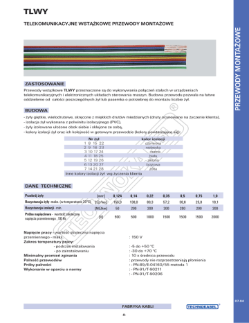 TLWY PRZEWODY MONTA¯OWE TELEKOMUNIKACYJNE WST¥¯KOWE PRZEWODY MONTA¯OWE ZASTOSOWANIE ® Przewody wst¹¿kowe TLWY przeznaczone s¹ do wykonywania po³¹czeñ sta³ych w urz¹dzeniach telekomunikacyjnych i elektronicznych uk³adach sterowania maszyn. Budowa przewodu pozwala na ³atwe oddzielenie od ca³oœci poszczególnych ¿y³ lub pasemka o potrzebnej do monta¿u liczbie ¿y³. BUDOWA - ¿y³y giêtkie, wielodrutowe, skrêcone z miêkkich drutów miedzianych (druty ocynowane na ¿yczenie klienta), - izolacja ¿y³ wykonana z polwinitu izolacyjnego (PVC), - ¿y³y izolowane u³o¿one obok siebie i sklejone ze sob¹, - kolory izolacji ¿y³ oraz ich kolejnoœæ w gotowym przewodzie (kolory powtarzaj¹ce siê): Nr ¿y³ kolor izolacji 1 8 15 22 czerwona 2 9 16 23 niebieska 3 10 17 24 czarna 4 11 18 25 bia³a 5 12 19 26 zielona 6 13 20 27 br¹zowa 7 14 21 28 ¿ó³ta Inne kolory izolacji ¿y³ wg ¿yczenia klienta DANE TECHNICZNE Przekrój ¿y³y [mm ] 0,124 0,14 0,22 0,35 0,5 0,75 1,0 Rezystancja ¿y³y -maks. (w temperaturze 20°C) [W/km] 155,0 138,0 89,3 57,2 38,8 25,8 19,1 Rezystancja izolacji - min. [MWkm] 50 200 200 200 200 200 200 [V] 500 500 1000 1500 1500 1500 2000 Próba napiêciowa - wartoœæ skuteczna napiêcia przemiennego , 50 Hz Napiêcie pracy - wartoœæ skuteczna napiêcia przemiennego - maks. Zakres temperatury pracy: - podczas instalowania - po zainstalowaniu Minimalny promieñ zginania Palnoœæ przewodów Próby palnoœci Wykonanie w oparciu o normy : 150 V : -5 do +50 °C : -30 do +70 °C : 10 x œrednica przewodu : przewody nie rozprzestrzeniaj¹ p³omienia : - PN-89/E-04160/55 metoda 1 : - PN-91/T-90211 : - PN-91/T-90206 07-04 FABRYKA KABLI -9- ® TLWY 5.2.101 5.2.102 5.2.103 5.2.104 5.2.105 5.2.106 5.2.107 5.2.108 5.2.109 5.2.110 5.2.111 [szt. x mm2] 2 x 0,124 3 x 0,124 4 x 0,124 5 x 0,124 6 x 0,124 7 x 0,124 8 x 0,124 9 x 0,124 10 x 0,124 11 x 0,124 12 x 0,124 Wymiary zewnêtrzne przewodu, wartoœci orientacyjne [mm] 1,0 x 2,0 1,0 x 3,0 1,0 x 4,0 1,0 x 5,0 1,0 x 6,0 1,0 x 7,0 1,0 x 8,0 1,0 x 9,0 1,0 x 10,0 1,0 x 11,0 1,0 x 12,0 5.2.118 5.2.119 5.2.120 5.2.121 7 x 0,14 8 x 0,14 10 x 0,14 12 x 0,14 1,05 x 7,35 1,05 x 8,4 1,05 x 10,5 1,05 x 12,6 9,7 11,1 13,9 16,7 5.2.126 5.2.127 5.2.128 5.2.129 5.2.130 5.2.131 5,2,132 5.2.133 5.2.134 5.2.136 5.2.138 5.2.140 5.2.141 2 x 0,22 3 x 0,22 4 x 0,22 5 x 0,22 6 x 0,22 7 x 0,22 8 x 0,22 9 x 0,22 10 x 0,22 12 x 0,22 15 x 0,22 20 x 0,22 24 x 0,22 1,05 x 2,1 1,05 x 3,15 1,05 x 4,2 1,05 x 5,15 1,05 x 6,3 1,05 x 7,35 1,05 x 8,4 1,05 x 9,45 1,05 x 10,5 1,05 x 12,6 1,05 x 15,75 1,05 x 21,0 1,05 x 25,2 4,1 6,2 8,2 10,2 12,3 14,3 16,4 18,5 20,5 25,1 30,8 41,0 49,3 5,7 8,6 11,4 14,3 17,1 20,0 22,9 25,7 28,6 34,3 42,9 57,2 68,6 5.2.144 5.2.145 5.2.146 5.2.147 5.2.148 5.2.149 5.2.150 5.2.151 5.2.152 5.2.153 5.2.154 5.2.157 5.2.158 2 x 0,35 3 x 0,35 4 x 0,35 5 x 0,35 6 x 0,35 7 x 0,35 8 x 0,35 9 x 0,35 10 x 0,35 11 x 0,35 12 x 0,35 20 x 0,35 24 x 0,35 1,4 x 2,8 1,4 x 4,2 1,4 x 5,6 1,4 x 7,0 1,4 x 8,4 1,4 x 9,8 1,4 x 11,2 1,4 x 12,6 1,4 x 14,0 1,4 x 15,4 1,4 x 16,8 1,4 x 28,0 1,4 x 37,9 6,9 10,3 13,7 17,2 20,7 24,1 27,5 28,8 34,4 37,9 41,2 68,6 82,4 9,2 13,8 18,7 23,0 27,7 32,3 37,4 41,5 46,2 50,8 56,1 93,6 112,3 5.2.161 5.2.177 5.2.163 5.2.164 5.2.170 4 x 0,50 6 x 0,50 8 x 0,50 10 x 0,50 12 x 0,50 1,94 x 7,76 1,94 x 11,64 1,94 x 15,52 1,94 x 19,40 1,94 x 23,28 20,2 30,1 40,1 50,2 60,2 32,2 47,4 63,2 79,3 95,2 5.2.176 5.2.173 5.2.178 5.2.174 4 x 0,75 6 x 0,75 8 x 0,75 12 x 0,75 2,2 x 8,8 2,2 x 13,2 2,2 x 17,6 2,2 x 26,4 30,1 45,2 60,2 90,4 43,4 65,1 86,8 130,1 5.2.179 5.2.178 2 x 1,0 12 x 1,0 2,3 x 9,2 2,3 x 27,6 40,0 120,5 53,6 161,0 Nr wyrobu Liczba ¿y³ i ich przekrój Indeks miedziowy Masa przewodu, wartoœæ orientacyjna [kg/km] 2,4 3,6 4,8 6,1 7,3 8,5 9,7 10,9 12,1 13,3 14,5 [kg/km] 4,4 6,5 8,7 10,9 13,1 15,2 17,4 19,6 21,8 23,9 26,1 16,7 19,1 23,8 28,6 ® PRZEWODY MONTA¯OWE WYMIARY I MASA Na zamówienie klienta wykonujemy przewody o innych przekrojach i innej liczbie ¿y³. 07-04 ® FABRYKA KABLI -10-