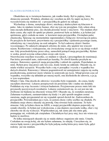 KLAUDIA KONDRACIUK Obudziłam się w świetnym humorze, jak rzadko kiedy. Był to piękny, letni, słoneczny poranek. Wstałam, ubrałam się i zeszłam na dół, by napić się kawy. Po wyszykowaniu się miałam iść z przyjaciółką do galerii na zakupy. Wychodząc z domu, zamykając drzwi, niechcący skaleczyłam się kluczem w palec. Jako że miałam świetny humor, zbyt się tym nie przejęłam. Gdy szłam ulicą rana zaczęła delikatnie piec, nie chciała przestać lecieć z niej krew. Nie miałam zbyt dużo czasu, aby zajść do apteki po plaster, ponieważ była za daleko, a ja byłam już spóźniona, gdyż czekała na mnie w kawiarni moja przyjaciółka. Owinęłam palec chusteczką. Śpiesząc się momentalnie zapomniałam o bolącym i krwawiącym palcu. Po przyjściu do kawiarni, przywitaniu się z przyjaciółką i zjedzeniu pysznego ciasta, zebrałyśmy się i ruszyłyśmy na szał zakupów. To był cudowny dzień i bardzo wyczerpujący. Po udanych zakupach szłyśmy do mnie, aby spędzić ten wieczór razem. Rozbawione i rozkojarzone, nie zwracałyśmy uwagi na to co się dzieje wokół nas. Gdy przechodziłyśmy przez ulicę, samochód potrącił moją przyjaciółkę. Byłam w szoku, przed oczyma zobaczyłam swoje całe życie. Niezwłocznie rzuciłam wszystko, co miałam w rękach, i przystąpiłam do reanimacji. Pan który prowadził auto, zadzwonił po karetkę. Po chwili karetka przybyła na miejsce. Ratownicy opatrzyli moją przyjaciółkę i zabrali do szpitala. Pojechałam za nimi. Byłam przy niej przez cały ten czas, kiedy leżała na oddziale. Okazało się, że miała wielkie szczęście. Wszystko było z nią w porządku i wyszła z wypadku bez dużych obrażeń. Ratownicy i lekarze pogratulowali mi umiejętności zajęcia się osobą poszkodowaną, ponieważ może właśnie to uratowało jej życie. Minął pewien czas od wypadku, wszystko się układało po naszej myśli, ona dochodziła do zdrowia, a ja ją w tym wspierałam. Minęły 2 lata. Ona doszła do zdrowia i wszystko było wspaniale.. do czasu, kiedy zaczęłam chorować. Lekarze przepisywali mi przeróżne leki i żadne nie działały. Poddałam się więc leczeniu i różnym badaniom. Przyjmowane przeze mnie leki nie przynosiły pozytywnych rezultatów. Lekarze zorientowali się, że coś jest nie tak. Zrobiono mi badania na obecność wirusa HIV. Okazało się, że zostałam zarażona. Załamana wynikami, zastanawiałam się kiedy i w jaki sposób mogłam zostać zarażona, nagle przypomniał mi się wypadek sprzed dwóch lat. Zadzwoniłam do przyjaciółki. Powiedziałam jej o tym, że jestem chora i żeby szybko się zbadała. Po zbadaniu moje obawy okazały się prawdą. Ona również była zarażona .To było straszne. Gdy ja byłam chora na AIDS, u mojej przyjaciółki dopiero pojawiały się oznaki choroby. Ja byłam już wykończona, a ona dopiero zaczynała walkę, choć z tej choroby nie da się wyleczyć. Współczułam jej, tak samo jak ona mnie gdy, pomagając mi, widziała jak cierpiałam. Chciałabym być przy niej, lecz nie wiem czy będzie to możliwe. Po kilku miesiącach okazało się ze miała słabszy organizm ode mnie. Umarła. Czekałam na swoją kolej, ale nie byłam załamana, że odejdę. Cieszyłam się, że znowu będę razem z przyjaciółką bo była jedyną osobą która przy mnie była, gdyż rodziny już nie miałam.