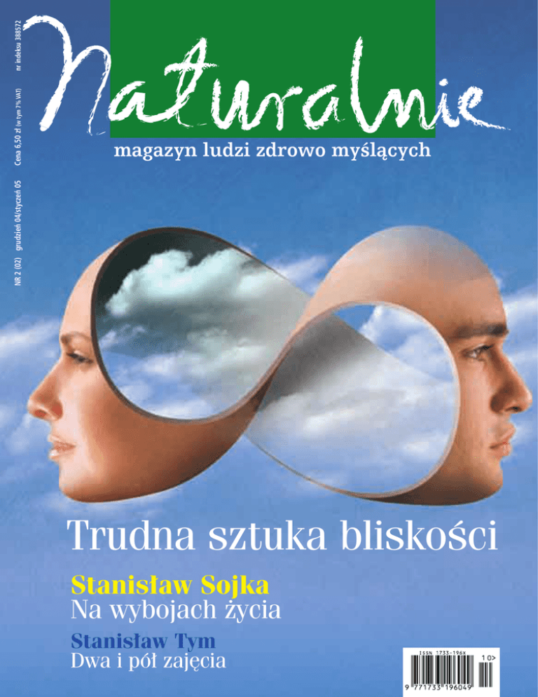 nr indeksu 388572 Cena 6,50 z∏ (w tym 7% VAT) NR 2 (02) grudzieƒ 04/styczeƒ 05 magazyn ludzi zdrowo myÊlàcych Trudna sztuka bliskoÊci Stanis∏aw Sojka Na wybojach ˝ycia Stanis∏aw Tym Dwa i pó∏ zaj´cia GALERIA W numerze NOTATNIK Krzysztof Piesiewicz .........................13 NA WYBOJACH ˚YCIA Stanis¸aw Sojka. Us∏yszeç siebie.......14 Galeria ..............................................3 E-listy................................................6 Naturalnie, ˝e....................................7 DYLEMATY WOKÓ¸ NAS Czy potrzebna jest cz∏owiekowi XXI wieku .......................................18 Dzieci naszych dzieci. Gdy rodzice potrzebujà naszej opieki ....................8 Co dobrego .....................................12 Dwa ˝ywio∏y....................................17 WIARA EKOLOGIA UMYS¸U Trudna sztuka bliskoÊci. Jak byç blisko siebie.........................20 Dobro zasypia cz´Êciej .....................24 Dobro zasypia cz´Êciej. 24 Stanis∏aw Sojka. 14 WYWIAD Prof. Stanis∏aw Berger. Dieta, czyli sposób ˝ycia...................26 ZDROWO NAUKOWO Apteka pana boga...........................28 Projekt ok∏adki: Igor Morski/Morski Studio S T R O N A 4 N A T U R A L N I E KULTURALNIE Warto przeczytaç .............................31 POGODA DUCHA Czym grzejemy dusz´, kiedy za oknem zimno i szaro ...................32 BLI˚EJ PRAWDY Wegetarianizm. Dwie strony medalu.........................36 SMACZNE I NIEGROèNE Winem rozpraszajcie troski...............38 OD FASCYNACJI DO BIZNESU Posmakuj zdrowego ˝ycia ................40 Wegetarianizm. Diwe strony medalu. 36 MODA Kolekcja Hexeline.............................43 BIODESIGN Przedmioty z ludzkà twarzà..............44 OBYCZAJE Na Êwiàtecznych sto∏ach Europy.......46 URODA Z natura do twarzy. Maseczki na ka˝dà pogod´ .................................48 Z naturà do twarzy. Maseczki na ka˝dà pogod´. 48 SZARE NA Z¸OTE Ucz si´ màdrze ................................50 PYTANIA FILOZOFICZNE Przemijanie ma sens ........................52 DZIENNIK CZ¸OWIEKA SZCZ¢ÂLIWEGO Pochmurny weekend we dwoje........53 PÓ¸ ˚ARTEM PÓ¸ SERIO G∏adkie jest Êliczne ..........................54 OPOWIADANIE Tyle piàtków....................................56 FELIETON Stanis∏aw Tym. Dwa i pó∏ zaj´cia......58 N A T U R A L N I E Ucz si´ màdrze, 50 S T R O N A 5 E–LISTY * Dzi´kuj´ * Ciesz´ si´ jak dziecko Z ca∏ego serca pragn´ Wam podzi´kowaç za nowà gazet´ „Naturalnie”. Prowadz´ kiosk z prasà i musz´ si´ Wam zwierzyç. Pierwszy numer gazety nieoczekiwanie odegra∏ ogromnà rol´ w moim ˝yciu. Sta∏o si´ tak: pewnego ranka zobaczy∏am ko∏o kiosku policjantów i ju˝ wiedzia∏am, ˝e ten dzieƒ nale˝y do straconych. W∏amanie. Mam 48 lat, pracuj´ po 12 godzin dziennie, wi´c nie musz´ t∏umaczyç, jaki sza∏ mnie ogarnà∏. Wszystko traci∏o sens. Zero optymizmu. Po usuni´ciu szkód usiad∏am i jak zawsze, z du˝ym uczuciem zacz´∏am obs∏ugiwaç klientów. W wolnej chwili usi∏owa∏am coÊ przeczytaç, ale wszystkie tytu∏y mnie dra˝ni∏y. I nagle zatrzyma∏am wzrok na nowej gazecie, przypominajàc sobie, ˝e nic o niej nie wiem. Zobaczy∏am uÊmiechni´tà twarz pani Marii, przyjrza∏am si´ pani Barbarze i zacz´∏am czytaç kartk´ za kartkà. Ka˝dy artyku∏ dawa∏ mi nadziej´, podnosi∏ na duchu i tonowa∏ mojà nienawiÊç. Po przeczytaniu ca∏ej gazety wiem ju˝, co oznacza, ˝e „trzeba byç w odpowiednim czasie, w odpowiednim miejscu”. Wy spe∏niliÊcie te warunki. To cud, ˝e majàc tak du˝y wybór prasy, si´gn´∏am akurat po „Naturalnie”. Da∏am gazet´ na czo∏owe miejsce, a póêniej do koƒca dnia ∏owi∏am same „rodzynki”. Dosta∏am od klienta (na otarcie ∏ez) bukiet kwiatów, ludzie pocieszali mnie i ˝ycie nabiera∏o rumieƒców. Poniewa˝ jest to pierwszy numer „Naturalnie”, a mój pierwszy do Was list, mam nadziej´, ˝e mimo przykrego poczàtku poznania, przyjaêƒ nasza si´ rozwinie. Ja kocham wszystko, co wià˝e si´ z naturà. Do pracy chodz´ na nogach 40 minut i jest to mój sposób medytacji i kontakt z naturà, ale myÊl´, ˝e czytajàc „Naturalnie” wiele si´ naucz´. ˚ycz´ Wam, by „Naturalnie” goÊci∏o w wielu domach. Serdecznie pozdrawiam! A ja si´ ciesz´, ˝e jesteÊcie. Tak po prostu ciesz´ si´, jak dziecko. Wyró˝niacie si´, dostrzeg∏am was wÊród setki innych kolorowych gazet. Gratuluj´. To wielka sztuka wyró˝niaç si´ w t∏umie. Wyró˝niaç pozytywnie. Bardzo màdrze „ktoÊ” tam pisze i bardzo ∏adnie „ktoÊ” to wydaje. Wszystko idzie dobrym rytmem, niczego za du˝o, ˝adnych pouczeƒ, ˝adnego krytykowania, ˝adnego szufladkowania ludzi na tych „modnych” i reszt´. Ciesz´ si´, ˝e jesteÊcie na rynku. Naprawd´ si´ ciesz´! I jeszcze raz gratuluj´! Maria, Bielsko-Bia∏a AÊka * Dobrze ˝e jesteÊcie Dobrze, ˝e jesteÊcie. Kupi∏am Wasze pismo od razu, jak tylko pojawi∏o si´ w pobliskim sklepie. Staram si´ ˝yç „naturalnie” ju˝ od wielu lat i robi´ rzeczy, które w przekonaniu „zwyk∏ych” ludzi wydajà si´ co najmniej dziwne. Kupuj´ w sklepie internetowym ekologicznà ˝ywnoÊç, warzywa i owoce przywo˝´ od rodziców, którzy majà swojà dzia∏k´, w∏aÊciwie nie jem wcale mi´sa i innych produktów pochodzenia zwierz´cego. Choroby panoszàce si´ w okresie jesienno-zimowym znam tylko z obserwacji kolegów i kole˝anek z pracy, którym co chwil´ coÊ dolega. Wybra∏am taki styl ˝ycia i jest mi z nim dobrze, nawet pomimo tego, ˝e w „normalnym” sklepie spo˝ywczym w∏aÊciwie nie ma produktów, które mog∏abym, czy raczej chcia∏abym kupiç. To naprawd´ niewielka cena w porównaniu z tym, jak si´ czuj´. Dodatkowo nie u˝ywam kosmetyków testowanych na zwierz´tach i uwa˝am, ˝e mam niez∏à ÊwiadomoÊç ekologicznà. Marzy mi si´ jeszcze wiele rzeczy, które chcia∏abym zrobiç i wi