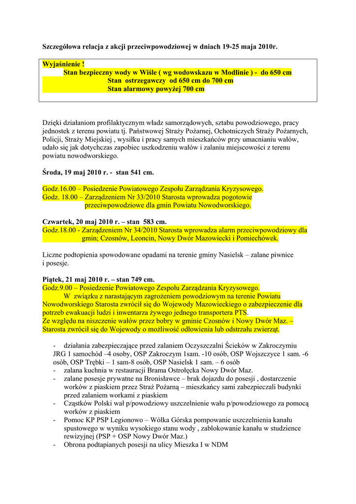 Szczegółowa relacja z akcji przeciwpowodziowej w dniach 19-25 maja 2010r. Wyjaśnienie ! Stan bezpieczny wody w Wiśle ( wg wodowskazu w Modlinie ) - do 650 cm Stan ostrzegawczy od 650 cm do 700 cm Stan alarmowy powyżej 700 cm Dzięki działaniom profilaktycznym władz samorządowych, sztabu powodziowego, pracy jednostek z terenu powiatu tj. Państwowej Straży Pożarnej, Ochotniczych Straży Pożarnych, Policji, Straży Miejskiej , wysiłku i pracy samych mieszkańców przy umacnianiu wałów, udało się jak dotychczas zapobiec uszkodzeniu wałów i zalaniu miejscowości z terenu powiatu nowodworskiego. Środa, 19 maj 2010 r. - stan 541 cm. Godz.16.00 – Posiedzenie Powiatowego Zespołu Zarządzania Kryzysowego. Godz. 18.00 – Zarządzeniem Nr 33/2010 Starosta wprowadza pogotowie przeciwpowodziowe dla gmin Powiatu Nowodworskiego. Czwartek, 20 maj 2010 r. – stan 583 cm. Godz.18.00 - Zarządzeniem Nr 34/2010 Starosta wprowadza alarm przeciwpowodziowy dla gmin; Czosnów, Leoncin, Nowy Dwór Mazowiecki i Pomiechówek. Liczne podtopienia spowodowane opadami na terenie gminy Nasielsk – zalane piwnice i posesje. Piątek, 21 maj 2010 r. – stan 749 cm. Godz.9.00 – Posiedzenie Powiatowego Zespołu Zarządzania Kryzysowego. W związku z narastającym zagrożeniem powodziowym na terenie Powiatu Nowodworskiego Starosta zwrócił się do Wojewody Mazowieckiego o zabezpieczenie dla potrzeb ewakuacji ludzi i inwentarza żywego jednego transportera PTS. Ze względu na niszczenie wałów przez bobry w gminie Czosnów i Nowy Dwór Maz. – Starosta zwrócił się do Wojewody o możliwość odłowienia lub odstrzału zwierząt. - działania zabezpieczające przed zalaniem Oczyszczalni Ścieków w Zakroczymiu JRG 1 samochód –4 osoby, OSP Zakroczym 1sam. -10 osób, OSP Wojszczyce 1 sam. -6 osób, OSP Trębki – 1 sam-8 osób, OSP Nasielsk 1 sam. – 6 osób - zalana kuchnia w restauracji Brama Ostrołęcka Nowy Dwór Maz. - zalane posesje prywatne na Bronisławce – brak dojazdu do posesji , dostarczenie worków z piaskiem przez Straż Pożarną – mieszkańcy sami zabezpieczali budynki przed zalaniem workami z piaskiem - Cząstków Polski wał p/powodziowy uszczelnienie wału p/powodziowego za pomocą worków z piaskiem - Pomoc KP PSP Legionowo – Wólka Górska pompowanie uszczelnienia kanału spustowego w wyniku wysokiego stanu wody , zablokowanie kanału w studzience rewizyjnej (PSP + OSP Nowy Dwór Maz.) - Obrona podtapianych posesji na ulicy Mieszka I w NDM - Pomiechówek ul. Ogrodowa, ul. Bałtycka, ul. Rybacka zalane posesje prywatne ok. 40 budynków zalanych ,ewakuacja 4 osób oraz mienia Na bieżąco były patrolowane wszystkie wały w powiecie nowodworskim. W pełnej gotowości KP PSP Nowy Dwór Mazowiecki + OSP z powiatu nowodworskiego. Sobota, 22 maj 2010 r. – stan 891 cm. W związku z narastającym zagrożeniem powodziowym na terenie Powiatu Nowodworskiego Starosta zwrócił się do Wojewody Mazowieckiego o wsparcie akcji przeciwpowodziowej w miejscowości Głusk gm. Leoncin przez 48 żołnierzy, - wypożyczenie urządzenia inżynieryjnego do workowania piasku, - sprowadzenie śmigłowca transportowego do przenoszenia worków z piaskiem. Dla wsparcia akcji w gminie Leoncin, z Wojewódzkiego magazynu dowieziono 5 tyś .worków + 20 tyś. worków dla potrzeb powiatu. Starosta Nowodworski polecił Wójtom i Burmistrzom rozważenie zamknięcia placówek oświatowych oraz odwołanie imprez masowych na terenach zagrożonych powodzią. - Czarnowo – odłączanie transformatorów – transport pracowników Zakładu Energetycznego łodzią - godz. 18:10 Nowy Dwór Maz. ul. Wojska Polskiego uszczelnienie wałów za pomocą worków z piaskiem, - godz. 22:45 Nowy Dwór Maz. ul. Wojska Polskiego uszczelnienie wałów za pomocą geowłókiny i worków z piaskiem na powierzchni ok. 3 tysięcy m2 decyzją Starosty Nowodworskiego zamknięcie drogi nr 85 obwodnicy Nowego Dworu Maz. na odcinku Most Wiślany do Osiedla Młodych. - Nowy Dwór Maz. ul. Okunin – obsunięcie wału p/powodziowego - Nowy Dwór Maz. ul. Targowa, ul. Sukienna, ul. Okunin przeciek z wału p/powodziowego – zabezpieczanie wału workami z piaskiem - Czosnów – przesiąki wody gruntowej pod wałem – zabezpieczenia wałów przez OSP Krogulec, OSP Kazuń, OSP Czosnów - Grochale Nowe umacnianie wału p/powodziowego 17:30 Powiat nowodworski, miejscowości Głusk gmina Leoncin wystąpiło przesiąkanie wałów na powierzchni 600 m 2 w działaniach udział bierze 2 zastępy JRG - 2 osoby oraz 6 zastępów OSP i 30osób. Działania polegały na zabezpieczeniu przecieku workami z piasku i geowłókniną. Na terenie powiatu nowodworskiego zaistniało 7 zdarzeń związanych z wysokim stanem wody w rzekach Wkra ,Narew, Wisła. Podtopionych zostało ok.40 posesji oraz z kilku budynków, wypompowano wodę z piwnic w miejscowości Nowy Dwór Maz. ul. Mieszka I. Wszystkie budynki zostały obłożono workami z piaskiem do czego zostało użyte ok. 6 tys. worków. W miejscowości Pomiechowo – Pomiechówek ewakuowano 4 osoby przygotowano do ewakuacji 5 budynków jednorodzinnych, cały czas prowadzone są działania zabezpieczające budynki, polegające na układaniu worków z piaskiem, wyżej wymienione miejsca nie są chronione wałami przeciwpowodziowymi. W miejscowości Cząstków Polski na rzece Wisła zabezpieczono workami z piaskiem lekkie przesiąkanie wody u podstawy wału przeciwpowodziowego. Cały czas prowadzone jest monitorowanie wałów przez OSP Straż Miejska oraz Policję. Nowy Dwór Maz. - sytuacja 22.05.2010 godz. 22:00 cały czas trwa umacnianie wałów w miejscowości Głusk, na bieżąco są kontrolowane wały w powiecie nowodworskim. Dodatkowo pomagają: SGSP z Warszawy 20 osób , Kompania Mława 10 samochodów gaśniczych – 62 osoby. Na bieżąco były patrolowane wszystkie wały w powiecie nowodworskim. Niedziela, 23 maj 2010 r. – stan 882 cm. W związku z narastającym zagrożeniem powodziowym na t