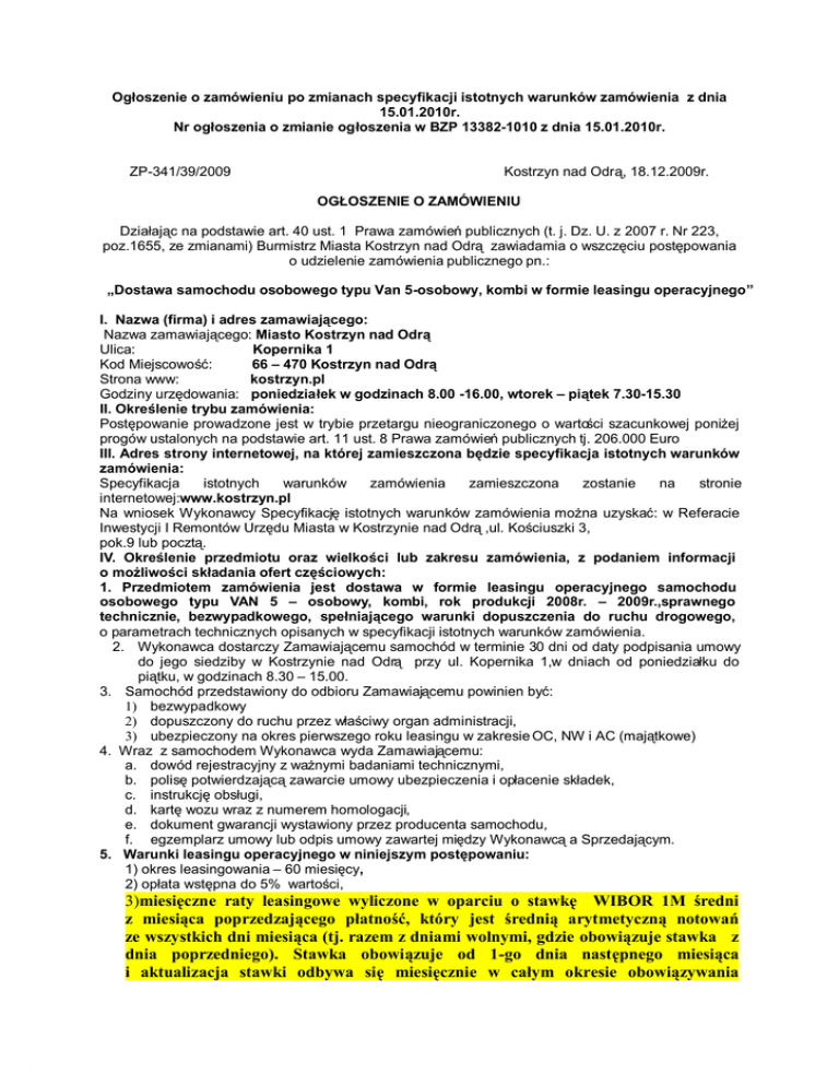 Ogłoszenie o zamówieniu po zmianach specyfikacji istotnych warunków zamówienia z dnia 15.01.2010r. Nr ogłoszenia o zmianie ogłoszenia w BZP 13382-1010 z dnia 15.01.2010r. ZP-341/39/2009 Kostrzyn nad Odrą, 18.12.2009r. OGŁOSZENIE O ZAMÓWIENIU Działając na podstawie art. 40 ust. 1 Prawa zamówień publicznych (t. j. Dz. U. z 2007 r. Nr 223, poz.1655, ze zmianami) Burmistrz Miasta Kostrzyn nad Odrą zawiadamia o wszczęciu postępowania o udzielenie zamówienia publicznego pn.: „Dostawa samochodu osobowego typu Van 5-osobowy, kombi w formie leasingu operacyjnego” I. Nazwa (firma) i adres zamawiającego: Nazwa zamawiającego: Miasto Kostrzyn nad Odrą Ulica: Kopernika 1 Kod Miejscowość: 66 – 470 Kostrzyn nad Odrą Strona www: kostrzyn.pl Godziny urzędowania: poniedziałek w godzinach 8.00 -16.00, wtorek – piątek 7.30-15.30 II. Określenie trybu zamówienia: Postępowanie prowadzone jest w trybie przetargu nieograniczonego o wartości szacunkowej poniżej progów ustalonych na podstawie art. 11 ust. 8 Prawa zamówień publicznych tj. 206.000 Euro III. Adres strony internetowej, na której zamieszczona będzie specyfikacja istotnych warunków zamówienia: Specyfikacja istotnych warunków zamówienia zamieszczona zostanie na stronie internetowej:www.kostrzyn.pl Na wniosek Wykonawcy Specyfikację istotnych warunków zamówienia można uzyskać: w Referacie Inwestycji I Remontów Urzędu Miasta w Kostrzynie nad Odrą ,ul. Kościuszki 3, pok.9 lub pocztą. IV. Określenie przedmiotu oraz wielkości lub zakresu zamówienia, z podaniem informacji o możliwości składania ofert częściowych: 1. Przedmiotem zamówienia jest dostawa w formie leasingu operacyjnego samochodu osobowego typu VAN 5 – osobowy, kombi, rok produkcji 2008r. – 2009r.,sprawnego technicznie, bezwypadkowego, spełniającego warunki dopuszczenia do ruchu drogowego, o parametrach technicznych opisanych w specyfikacji istotnych warunków zamówienia. 2. Wykonawca dostarczy Zamawiającemu samochód w terminie 30 dni od daty podpisania umowy do jego siedziby w Kostrzynie nad Odrą przy ul. Kopernika 1,w dniach od poniedziałku do piątku, w godzinach 8.30 – 15.00. 3. Samochód przedstawiony do odbioru Zamawiającemu powinien być: 1) bezwypadkowy 2) dopuszczony do ruchu przez właściwy organ administracji, 3) ubezpieczony na okres pierwszego roku leasingu w zakresie OC, NW i AC (majątkowe) 4. Wraz z samochodem Wykonawca wyda Zamawiającemu: a. dowód rejestracyjny z ważnymi badaniami technicznymi, b. polisę potwierdzającą zawarcie umowy ubezpieczenia i opłacenie składek, c. instrukcję obsługi, d. kartę wozu wraz z numerem homologacji, e. dokument gwarancji wystawiony przez producenta samochodu, f. egzemplarz umowy lub odpis umowy zawartej między Wykonawcą a Sprzedającym. 5. Warunki leasingu operacyjnego w niniejszym postępowaniu: 1) okres leasingowania – 60 miesięcy, 2) opłata wstępna do 5% wartości, 3)miesięczne raty leasingowe wyliczone w oparciu o stawkę WIBOR 1M średni z miesiąca poprzedzającego płatność, który jest średnią arytmetyczną notowań ze wszystkich dni miesiąca (tj. razem z dniami wolnymi, gdzie obowiązuje stawka z dnia poprzedniego). Stawka obowiązuje od 1-go dnia następnego miesiąca i aktualizacja stawki odbywa się miesięcznie w całym okresie obowiązywania umowy. Pozostałe składniki raty leasingowej w oparciu o które będzie ustalona jej wysokość będą stałe. 4) płatność miesięcznej raty leasingowej przypadać będzie na ostatni dzień roboczy każdego miesiąca na podstawie faktury VAT, wystawionej przez Leasingodawcę 5) ubezpieczenie OC, NW i AC (majątkowe) jest płatne przez Leasingodawcę za cały rok z góry. Koszty ubezpieczenia w całym okresie obowiązywania umowy leasingu, Leasingodawca doliczy do ceny oferty. Wykonawca zobowiązuje się do ubezpieczenia samochodu do pełnej wartości rynkowej, 6) opłata końcowa (wykup) 1% wartości, 7) ewentualna prowizja – opłata manipulacyjna płatna jednorazowo wraz z opłatą końcową, 8) nie przewiduje się wystąpienia innych dodatkowych opłat, z wyłączeniem opłat wynikających z przepisów prawa, 9) możliwość wykupu, 10) waluta leasingu – PLN, 11) odpisów amortyzacyjnych w okresie obowiązywania umowy leasingu dokonuje Leasingodawca. 7. Warunki płatności za przedmiot zamówienia: leasing na 60 miesięcznych rat, wysokość pierwszej wpłaty nie więcej niż 5% wartości, płatność miesięcznej raty leasingowej przypadać będzie na ostatni dzień roboczy każdego miesiąca na podstawie faktury VAT, wystawionej przez Leasingodawcę. 8. Inne warunki przedmiotowe: 1) czas dostępu serwisu nie dłuższy niż 24 godziny, 2) w zakresie obsługi samochodu dokonać przeszkolenia jednego pracownika, 3) Wykonawca wyrazi zgodę na montaż w oferowanym pojeździe systemu łączności bezprzewodowej tj.: instalacji antenowej, instalacji zasilania urządzeń łączności radiowej oraz innego specjalistycznego sprzętu, 4) zmiany adaptacyjne pojazdu powstałe w trakcie jego eksploatacji, dotyczące montażu wyposażenia specjalnego, nie mogą powodować utraty ani ograniczenia uprawnień wynikających z fabrycznej gwarancji, Wspólny Słownik Zamówień (CPV): 34110000-1 Samochody osobowe 66000000-0 Usługi finansowe i ubezpieczeniowe V. Informacja o możliwości złożenia oferty wariantowej Zamawiający nie dopuszcza składania ofert wariantowych VI Informacja o możliwości składania ofert częściowych Zamawiający nie dopuszcza możliwości składania ofert częściowych. VII. Termin wykonania zamówienia Umowa leasingu operacyjnego zostanie zawarta na 5 lat (60 miesięcy) okres spłaty rat leasingowych. Odbiór samochodu nastąpi nie później niż do 30 dni od daty podpisania umowy. Z chwilą odbioru samochodu, zaczyna biec okres spłaty leasingu – 60 miesięcy. VIII. Opis warunków udziału w postępowaniu oraz opis sposobu dokonywania oceny spełniania tych warunków 1