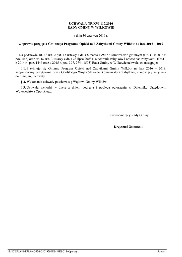 UCHWAŁA NR XVI.117.2016 RADY GMINY W WILKOWIE z dnia 30 czerwca 2016 r. w sprawie przyjęcia Gminnego Programu Opieki nad Zabytkami Gminy Wilków na lata 2016 – 2019 Na podstawie art. 18 ust. 2 pkt. 15 ustawy z dnia 8 marca 1990 r o samorządzie gminnym (Dz. U. z 2016 r. poz. 446) oraz art. 87 ust. 3 ustawy z dnia 23 lipca 2003 r. o ochronie zabytków i opiece nad zabytkami (Dz.U. z 2014 r. poz. 1446 oraz z 2015 r. poz. 397, 774 i 1505) Rada Gminy w Wilkowie uchwala, co następuje: § 1. Przyjmuje się Gminny Program Opieki nad Zabytkami Gminy Wilków na lata 2016 – 2019, zaopiniowany pozytywnie przez Opolskiego Wojewódzkiego Konserwatora Zabytków, stanowiący załącznik do niniejszej uchwały. § 2. Wykonanie uchwały powierza się Wójtowi Gminy Wilków. § 3. Uchwała wchodzi w życie z dniem podjęcia i podlega ogłoszeniu w Dzienniku Urzędowym Województwa Opolskiego. Przewodniczący Rady Gminy Krzysztof Ostrowski Id: 8CBF6A81-E78A-4C45-9C8C-95901E484EBC. Podpisany Strona 1 Załącznik do uchwały Nr XVI.117.2016 Rady Gminy w Wilkowie z dnia 30 czerwca 2016 r. GMINNY PROGRAM OPIEKI NAD ZABYTKAMI GMINY WILKÓW NA LATA 2016 – 2019 Id: 8CBF6A81-E78A-4C45-9C8C-95901E484EBC. Podpisany Strona 1 1. 2. 3. 4. 4.1. 4.2. 5. 5.1. 5.2. 5.2.1. 5.2.2. 5.2.3. 5.2.4. 5.2.5. 5.3. 5.4. 5.5. 6. 7. 7.1. 7.2. 7.3. 8. 9. 10. 11. 12. SPIS TREŚCI WSTĘP PODSTAWA PRAWNA OPRACOWANIA GMINNEGO PROGRAMU OPIEKI NAD ZABYTKAMI UWARUNKOWANIA PRAWNE OCHRONY I OPIEKI NAD ZABYTKAMI W POLSCE UWARUNKOWANIA ZEWNĘTRZNE OCHRONY DZIEDZICTWA KULTUROWEGO Strategiczne cele polityki państwa w zakresie ochrony zabytków i opieki nad zabytkami Relacje gminnego programu opieki nad zabytkami z dokumentami wykonanymi na poziomie województwa i powiatu UWARUNKOWANIA WEWNĘTRZNE OCHRONY DZIEDZICTWA KULTUROWEGO Relacje gminnego programu opieki nad zabytkami z dokumentami wykonanymi na poziomie gminy (analiza dokumentów programowych gminy) Charakterystyka zasobów i analiza stanu dziedzictwa i krajobrazu kulturowego gminy Zarys historii obszaru gminy Krajobraz kulturowy Zabytki nieruchome Zabytki ruchome Zabytki archeologiczne Zabytki objęte prawnymi formami ochrony Zabytki w gminnej ewidencji zabytków Zabytki o najwyższym znaczeniu dla gminy OCENA STANU DZIEDZICTWA KULTUROWEGO. ANALIZA SZANS I ZAGROŻEŃ ZAŁOŻENIA PROGRAMOWE Priorytety programu opieki nad zabytkami Kierunki działań programu opieki nad zabytkami Zadania programu opieki nad zabytkami INSTRUMENTARIUM REALIZACJI PROGRAMU OPIEKI NAD ZABYTKAMI ZASADY OCENY REALIZACJI PROGRAMU OPIEKI NAD ZABYTKAMI ŹRÓDŁA FINANSOWANIA PROGRAMU OPIEKI NAD ZABYTKAMI REALIZACJA I FINANSOWANIE PRZEZ GMINĘ ZADAŃ Z ZAKRESU OCHRONY ZABYTKÓW ANEKSY Id: 8CBF6A81-E78A-4C45-9C8C-95901E484EBC. Podpisany Strona 2 1. WSTĘP Przedmiot „Gminnego Programu Opieki nad Zabytkami” (dalej: GPONZ) dla gminy Wilków stanowi szeroko rozumiane dziedzictwo kulturowe zawierające się w granicach administracyjnych gminy. Za główny cel opracowania przyjmuje się wyznaczenie głównych kierunków działań oraz zadań, które należy podjąć na terenie gminy Wilków na rzecz ochrony i opieki nad zabytkami. Ogólnie dziedzictwo kulturowe definiuje się zazwyczaj jako zbiór rzeczy nieruchomych i ruchomych, a także wartości duchowych, historycznych, obyczajowych ściśle z nimi związanych, które uznaje się za wartość natury uniwersalnej, która jest godna objęcia ochroną prawną, dla szeroko rozumianego dobra oraz rozwoju społecznego. Dziedzictwo to uznaje się tym samym za godne przekazania kolejnym pokoleniom mieszkańców, opierając się o kryterium powszechnie przyjętego oraz akceptowalnego systemu wartości historycznych, patriotycznych, religijnych, naukowych i artystycznych. Wartości te mają fundamentalne znaczenie dla zachowania tożsamości oraz ciągłości rozwoju politycznego, społecznego i kulturalnego, dowodzenia prawd i upamiętniania wydarzeń historycznych, kultywowania poczucia piękna i wspólnoty cywilizacyjnej mieszkańców danego terytorium. Zadania przyjęte w GPONZ odzwierciedlają w równej mierze aspekty prawne oraz zadania i potrzeby samorządu, dążącego do osiągnięcia zrównoważonego rozwoju gminy, którego skutkiem powinna być poprawa jakości życia społeczności lokalnej. Temu drugiemu celowi podporządkowany powinien być strategiczny rozwój gminy, łączący problematykę społeczną, gospodarczą i przestrzenną. GPONZ zakłada wzmocnienie ochrony dziedzictwa kulturowego gminy i opieki nad zabytkami, prowadzące do poprawy stanu zabytków, przede wszystkim poprzez takie działania, jak: • włączenie zagadnień związanych z ochroną zabytków w strategiczne zadania gminy, szczególnie studium zagospodarowania przestrzennego, • uwzględnienie w strategii rozwojowej gminy zagadnień związanych z ochroną zabytków, która powinna stanowić wspólny komponent z zadaniami z zakresu ekologii oraz ochrony środowiska, • dbałość o stan zachowania zabytków na terenie gminy oraz przeciwdziałanie procesom degradacyjnym, • poprawienie atrakcyjności gminy, poprzez wyeksponowanie miejscowych zasobów dziedzictwa kulturowego i walorów turystycznych, • szersze udostępnienie lub przywrócenie zabytków społeczności, poprzez podjęcie działań zwiększających ich atrakcyjność turystyczną i edukacyjną, • wspieranie inicjatyw zmierzających do wzrostu absorpcji środków finansowych przeznaczonych na ochronę dziedzictwa kulturowego na terenie gminy, • ustalenie zasad współpracy z podmiotami cywilno-prawnymi posiadającymi tytuły własności do obiektów zabytkowych. GPONZ na lata 2016-2019 określa działania w zakresie ochrony i opieki nad zabytkami, w szczególności: • aktualizację inwentaryzacji zabytków nieruchomych, ruchomych, archeologicznych oraz dziedzictwa niematerialnego, • aktualizację gminnej ewidencji zabytków (dalej: GEZ), • aktualizację stanu oraz sposobu wykorzystania zabytków, • wskazan
