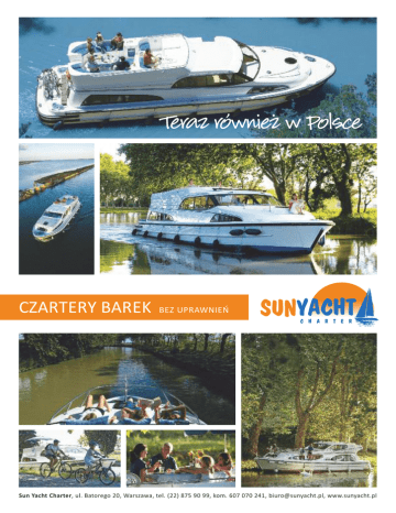 ෆ CZARTERY BAREK hWZtE/F Sun Yacht Charter, ul. Batorego 20, Warszawa, tel. (22) 875 90 99, kom. 607 070 241, [email protected], www.sunyacht.pl European Boating Holidays 2014 No Experience Necessary. No Licence Required . POLAND Cruise through nature – discover the Masurian Lakes EUROPE´S NUMBER ONE BOATING HOLIDAY COMPANY JUŻ JEST NOWA BAZA LE BOAT W POLSCE Z dumą informujemy że Sun Yacht Charter przyczyniła się do globalnej promocji Polski jako wspaniałego akwenu dla wodniaków w świadomości tysięcy miłośników houseboatingu na całym świecie. Mam przyjemność poinformować Państwa o rozpoczęciu współpracy z największą firmą na świecie TUI Marine oferującą wypoczynek na barkach i jachtach. Firma Sun Yacht Charter reprezentowana przez Konrada Korzonka po dwóch latach usilnych starań doprowadziła to tego, iż największy operator barek w Europie firma Le Boat powiększyła liczbę akwenów w swojej ofercie o Krainę Tysiąca Jezior Mazurskich. . Już od kolejnego sezonu będziemy obsługiwać turystów TUI Marine z całego świata. Nowa baza wraz z biurem została zlokalizowana w nowoczesnej Eko Marine w Giżycku. Wspólnie z Le Boat zdecydowaliśmy, że w sezonie 2015 flota polskich barek będzie liczyła 12 szt. Nasz partner TUI Marine to część TUI Travel, największej firmy na świecie organizującej wakacyjny wypoczynek, która obsługuje 180 krajów na 20 rynkach światowych, oferuje szeroką gamę różnych form spędzania czasu wolnego. W swojej ofercie posiada marki takie jak: Le Boat, Sunsail, Moorings, Footloose, Leopard Catamarans, Crystal Active, Club Vass. Flotylla. Firma TUI Marine dysponuje 2 415 jednostkami (żaglówki, katamarany, barki). Szczególnie zapraszamy od przyszłego sezonu na barki na Mazury Zapraszamy wszystkie osoby bez uprawnień na pokłady naszych łodzi w Europie. Przy dowolnym czarterze 7 – dniowym i dłuższym zapewnimy Państwu całodzienne szkolenie z manewrowania barką w naszej nowej bazie w giżyckiej Eko Marinie Przekonaj się że houseboating jest dosłownie dla każdego. My zapewniamy, że rozwiejemy wszelkie Państwa obawy przed wakacjami na Barce. Pozostajemy wierni głównej maksymie Le Boat „No experience required”, zgodnie z którą do poprowadzenia każdej łodzi wystarczy obecność na pokładzie przynajmniej dwóch pełnoletnich osób i posiadanie prawa jazdy. Praktyczne informacje Informacje dla podróżnych: Gdaŷsk G Gda ŷsk 'ŝǏLJĐŬŽ Warszawa Kraków Aktywności: E U R O P E ´ S N U M B E R O N E B O AT I N G H O L I D AY C O M PA N Y POLSKA Krótki czarter Jeziora i dzika przyroda Giżycko - Węgorzewo - Giżycko Czarter tygodniowy Rejs mazurski Giżycko - Ruciane Nida - Giżycko Kościół w Piszu Mikołajki Rejs dla miłośników przyrody Giżycko - Sztynort - Węgorzewo Ogonki - Giżycko Najlepsze tereny do obserwacji ptaków Dwutygodniowy czarter Dłuższy odpoczynek w Krainie Tysiąca Jezior Giżycko - Węgorzewo - Giżycko - Pisz - Ruciane Nida - Giżycko Mazury to region najlepszy do: C A L L U S V I S I T O U R W E B S I T E TO B O O K - D E TA I L S O N B AC KCOV E R BOATS FOR 4-8 PERSONS Nautiner 40 Nautiner 40.3: Sleeps 8 (6+2) / 3 cabins + saloon Nautiner 40.2: Sleeps 6 (4+2) / 2 cabins + saloon Size: 11,50 m x 3,50 m Both versions are fully-equipped with a covered outer steering helm, bow thruster, TV and DVD, kitchen, electric toilets, heating system and shore power. Forward cabin with double bed and en-suite bathroom. Rear cabin has another double bed plus bathroom. Nautiner 40.3 provides another double cabin. Saloon with settee which converts in to a double bed. Nautiner 40 Sleeps 8 (6+2) / 3 cabins + saloon Size: 11,20 m x 3,50 m Fully-equipped with indoor steering, bow thruster, 3 cabins with double bed, one bathroom, saloon with settee which converts to a double bed, TV and DVD player, kitchen, heating system and electric toilets. Shore power. Trust in TUI - Your holiday is in Safe Hands. Le Boat is proud to be a member of TUI Group of Companies. Nautiner 40.2 Nautiner 40.3 NOWOŚCI LE BOAT NA NADCHODZĄCY SEZON NOWY KATALOG LE BOAT NA NADCHODZĄCY SEZON JUŻ DOSTĘPNY Chcesz otrzymać swój egzemplarz? Skontaktuj się z nami mailowo lub telefonicznie a zostanie on do Ciebie wysłany e-mailem w wersji elektronicznej. Nowa edycja katalogu to jak zwykle cała masa informacji przydatnych w trakcie podejmowania decyzji, który region i jaką barkę wybrać. KRAINA WIELKICH JEZIOR MAZURSKICH + NOWA FLOTA BAREK - NOWA DESTYNACJA Wspólne z naszym partnerem SUN YACHT CHARTER oferujemy czartery barkami po krainie Tysiąca Jezior – na Mazurach. To pierwsza baza Le Boat w Polsce. Zapraszamy! NOWA VISION SL Zaprojektowana wyłącznie dla Le Boat barka Vision SL jest niższa niż jej poprzedniczka i cechuje ją łatwiejszy dostęp na górny pokład schodami z kuchni. NOWA VISION 2 Barka NEW Vision 2 jest zaprojektowana dla maksymalnie 6 osób. Główna kabina to duże, wygodne pomieszczenie z osobną łazienką. Funkcja manewrowania poprzez Joy-Stick sprawia, że prowadzenie tak dużej jednostki jest bardzo proste i sprawi, ze wakacje będą wyjątkowe. DWIE NOWE LOKALIZACJE DLA BARKI VISION Wsłuchując się w prośby naszych Klientów postanowiliśmy zaoferować możliwość spędzenia wakacji na barce Vision w dwóch nowych lokalizacjach: w romantycznych Włoszech oraz w Akwitanii – południowo – zachodniej części Francji. NOWY SERWIS INTERNETOWY Przygotowana została NOWA przyjazna Klientowi strona internetowa Le Boat, z nowoczesną grafiką, przejrzystym tekstem oraz pięknymi zdjęciami. Serwis zapewnia łatwiejszy sposób wyszukiwania łodzi na wymarzone wakacje. TEST NOWEJ LINII BAREK VISION KONRAD KORZONEK NOWA DUMA FLOTY LE BOAT BEZKONKURENCYJNY LUKSUS WŚRÓD BAREK