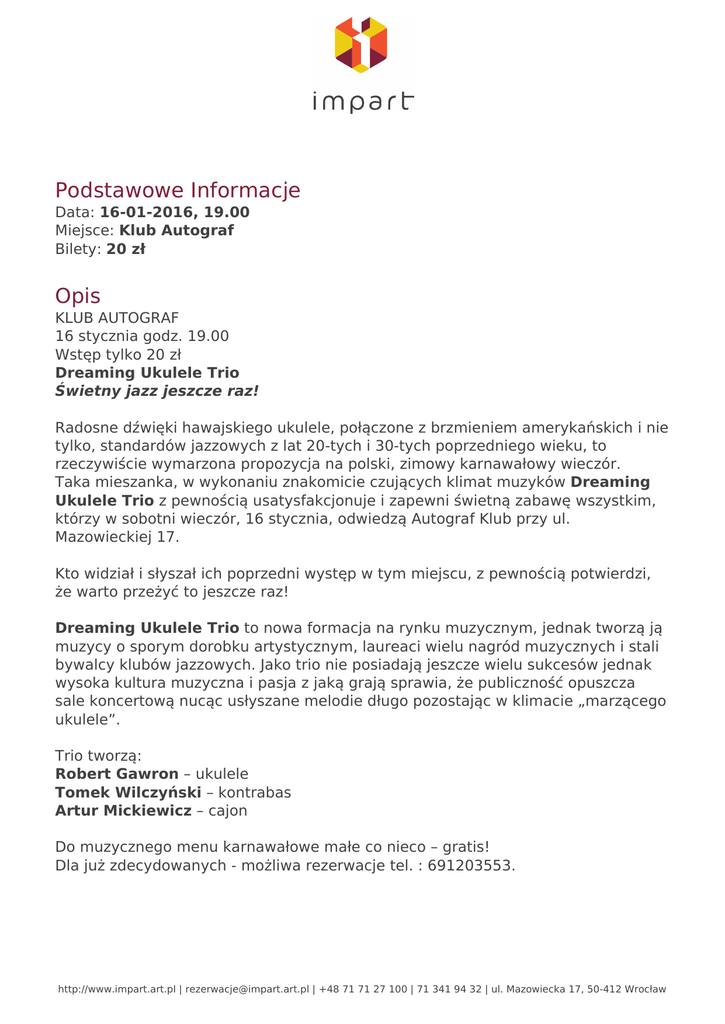 Podstawowe Informacje Data: 16-01-2016, 19.00 Miejsce: Klub Autograf Bilety: 20 zł Opis KLUB AUTOGRAF 16 stycznia godz. 19.00 Wstęp tylko 20 zł Dreaming Ukulele Trio Świetny jazz jeszcze raz! Radosne dźwięki hawajskiego ukulele, połączone z brzmieniem amerykańskich i nie tylko, standardów jazzowych z lat 20-tych i 30-tych poprzedniego wieku, to rzeczywiście wymarzona propozycja na polski, zimowy karnawałowy wieczór. Taka mieszanka, w wykonaniu znakomicie czujących klimat muzyków Dreaming Ukulele Trio z pewnością usatysfakcjonuje i zapewni świetną zabawę wszystkim, którzy w sobotni wieczór, 16 stycznia, odwiedzą Autograf Klub przy ul. Mazowieckiej 17. Kto widział i słyszał ich poprzedni występ w tym miejscu, z pewnością potwierdzi, że warto przeżyć to jeszcze raz! Dreaming Ukulele Trio to nowa formacja na rynku muzycznym, jednak tworzą ją muzycy o sporym dorobku artystycznym, laureaci wielu nagród muzycznych i stali bywalcy klubów jazzowych. Jako trio nie posiadają jeszcze wielu sukcesów jednak wysoka kultura muzyczna i pasja z jaką grają sprawia, że publiczność opuszcza sale koncertową nucąc usłyszane melodie długo pozostając w klimacie „marzącego ukulele”. Trio tworzą: Robert Gawron – ukulele Tomek Wilczyński – kontrabas Artur Mickiewicz – cajon Do muzycznego menu karnawałowe małe co nieco – gratis! Dla już zdecydowanych - możliwa rezerwacje tel. : 691203553. http://www.impart.art.pl | [email protected] | +48 71 71 27 100 | 71 341 94 32 | ul. Mazowiecka 17, 50-412 Wrocław Powered by TCPDF (www.tcpdf.org)