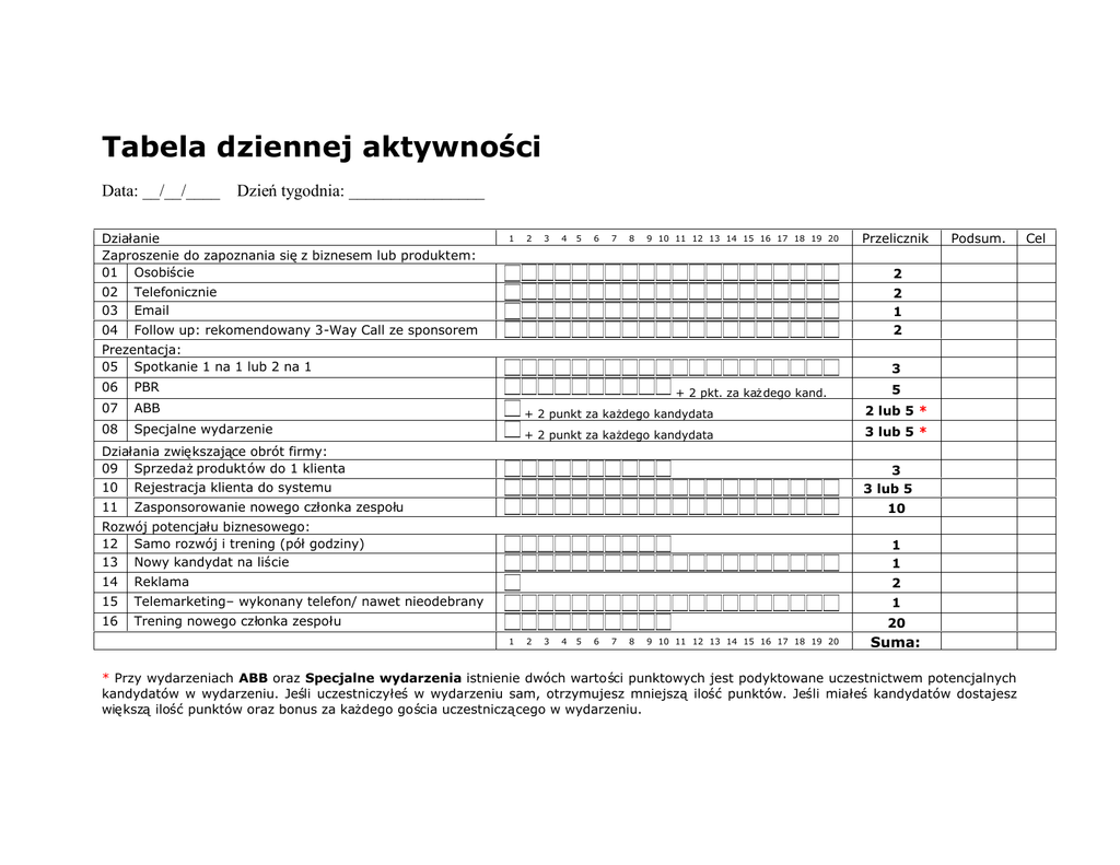 Tabela dziennej aktywności Data: __/__/____ Dzieńtygodnia: ________________ Dział anie Zaproszenie do zapoznania sięz biznesem lub produktem: 01 Osobiście 02 03 Telefonicznie Email 04 Follow up: rekomendowany 3-Way Call ze sponsorem 1 2 3 4 5 6 7 8 9 10 11 12 13 14 15 16 17 18 19 20 Przelicznik 2 2 1 2 Prezentacja: 05 Spotkanie 1 na 1 lub 2 na 1 3 06 PBR 07 ABB + 2 punkt za każ dego kandydata 2 lub 5 * 08 Specjalne wydarzenie + 2 punkt za każ dego kandydata 3 lub 5 * + 2 pkt. za każdego kand. Dział ania zwiększające obrót firmy: 09 Sprzedażproduktów do 1 klienta 10 Rejestracja klienta do systemu 11 Podsum. 5 3 3 lub 5 Zasponsorowanie nowego czł onka zespoł u 10 Rozwój potencjał u biznesowego: 12 Samo rozwój i trening (półgodziny) 13 Nowy kandydat na liście 1 1 14 Reklama 2 15 Telemarketing– wykonany telefon/ nawet nieodebrany 1 16 Trening nowego czł onka zespoł u 20 1 2 3 4 5 6 7 8 9 10 11 12 13 14 15 16 17 18 19 20 Suma: * Przy wydarzeniach ABB oraz Specjalne wydarzenia istnienie dwóch wartoś ci punktowych jest podyktowane uczestnictwem potencjalnych kandydatów w wydarzeniu. Jeś li uczestniczył eśw wydarzeniu sam, otrzymujesz mniejszą ilośćpunktów. Jeśli miał eśkandydatów dostajesz większąilośćpunktów oraz bonus za każdego goś cia uczestniczącego w wydarzeniu. Cel Dział anie #1 – Osobiste zaproszenie: Kiedy rozmawiasz z kandydatem osobiście podczas spotkania i oferujesz mu zapoznanie się z biznesem czy to wręczając mu pł ytę „Agel Phenomenon”, magazyn albo wizytówkę ze strona internetową. Pamiętaj o umówieniu się na kolejnąrozmowę(follow up). Za każ dątakąrozmowędostajesz 2 punkty bez wzgędu na rezultat. Dział anie #2 – Zaproszenie telefoniczne: Kiedy poł ączysz się z kandydatem telefonicznie i zł ożysz mu ofertę zapoznania się z biznesem. Dostajesz dwa punkty bez względu na to czy zechce sięzapoznaćczy teżnie. Pamiętaj by nie wyjaśniaćniczego przez telfon. Twoim zadaniem jest tylko zdobyc uwagękandydata i odesł ac go do narzędzia np. strony internetowej, nagrania audio albo pł yty DVD, którą mu wyś lesz. Dział anie #3 – Zaproszenie przez Email: Zaproszenie do zapoznania sięz ofertąbiznesowąza pomocąpoczty emailowej. Za każdym razem, kiedy wyślesz email – krok #1 do potencjalnego kandydata dostajesz jeden punkt. Dział anie #4 – Follow up: Rekomendowany 3-way Call. Jest to kolejna rozmowa z kandydatem o umówionym wcześ niej terminie po wyeksponowaniu go do narzędzia np. pł yty DVD Agel Phenomenon. Jest to rozmowa telefoniczna trzech osób za pomocą funkcji zwanej 3-way call, gdzie angażujemy w rozmowę naszego sponsora czy też inną osobę trzecią oraz potencjalnego kandydata. Przedmiotem tej rozmowy jest odkrycie poziomu zainteresowania kandydata oraz zaproponowanie następnego kroku, który w danej sytuacji wydaje się najbardziej odpowiedni. Może to byćzaproszenie na PBR lub ABB czy też odesł anie do źródł a informacji, których kandydat wymaga. Nie rzadko może to byćzaproponowanie współ pracy. Dostajesz 2 punkty za każdątakąrozmowę. Dział anie #5 Spotkanie 1 na 1 lub 2 na 1: Za każ e takie spotkanie dostajesz 3 punkty. Jest to sytuacja kiedy spotykasz się osobiście z kandydatem w celu obejrzenia prezentacji na pł ycie DVD czy też , by samemu przeprowadzićprezentację. Pomocne może byćzabranie ze sobąsponsora, by to on przeprowadziłprezentację. Chociażmoże to byćskuteczny sposób robienia biznesu, nie polecamy go ze względu na trudnoś ci w powielaniu. Dużo skuteczniejsze jest organizowanie spotkańw domu – PBR. Dział anie #6 – PBR - Private Business Review: Prezentacja biznesowa w domu. Za każdym razem, kiedy odbędzie się w twoim domu prezentacja dostajesz 5 punktów. Za każ dym razem, kiedy czł onek twojego zespoł u ma PBR w swoim domu, gdzie jesteśspecjalnym gościem czy to osobiście czy też przez telefon dostajesz 5 punktów. Warunkiem by dostać punkty jest obecnoś ć przynajmniej 2 kandydatów na spotkaniu. Puste spotkania, czyli takie, gdzie nie był o goś ci albo byłtylko jeden nie są w ogóle punktowane. Dostajesz dodatkowo 2 punkty za każdego kandydata, który pojawi sięna twoim spotkaniu. Dział anie #7 – ABB: Za każdym razem, kiedy uczestniczysz w co tygodniowej Prezentacji Biznesowej Agel – Weekly Agel Business Briefing (ABB) dostajesz 2 punkty. Jeś li masz ze sobą osobiście zaproszonych goś ci dostajesz 5 punktów za uczestnictwo oraz po 2 punkty dodatkowo za każdego gościa. Dział anie #8 Specjalne wydarzenie: Raz na jakiśczas będziesz miałokazję uczestniczyćw wydarzeniu wyższej rangi takim, jak wydarzenia regionalne czy konwencje. Uczestnictwo w takim wydarzeniu jest nagradzane 3 punktami. Jeśli masz ze sobą gości (potencjalnych kandydatów) otrzymujesz 5 punktów oraz 2 punkty za każdego gościa, którego ze sobąprzyprowadzisz. Dział anie #9 Sprzedaż produktów do klienta: Za każ dym razem, kiedy dokonasz sprzedaży bezpośredniej produktów klientowi, dokonując następnie odpowiedniego zamówienia w celu uzupeł nienia inwentarza otrzymujesz 3 punkty. Dział anie #10 Rejestracja klienta do systemu: W firmie Agel można dokonywać sprzedaży bezpoś redniej albo rejestrować klientów na program Preffered Customer, co pozwala klientowi zamawiać produkty bezpośrednio w firmie, gdzie firma wypł aca tobie stosowną prowizję. Za zarejestrowanie klienta w tym programie dostajesz 5 punktów, ale tylko, jeś li ma ustawiony automatycznąwysył kę(autoship). W przeciwnym wypadku dostajesz tylko 3 punkty. Dział anie #11 Zasponsorowanie nowego czł onka zespoł u: Za każdym razem, kiedy dokonasz rejestracji nowego czł onka zespoł u bez względu na to czy jest to pakiet personalny czy kierowniczy dostajesz 10 punktów. Dział anie #12 Samo rozwój i trening: Każe półgodziny, które poś więcisz na rozwój swojej osobowości – czytanie książ ek, sł uchanie nagrań aud