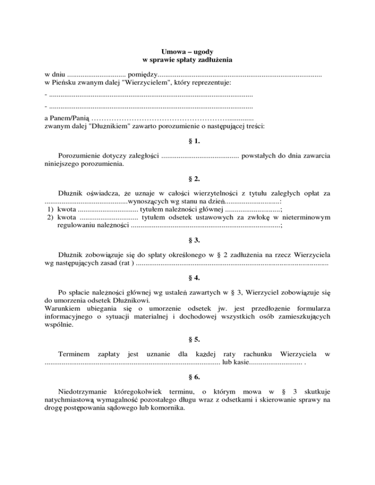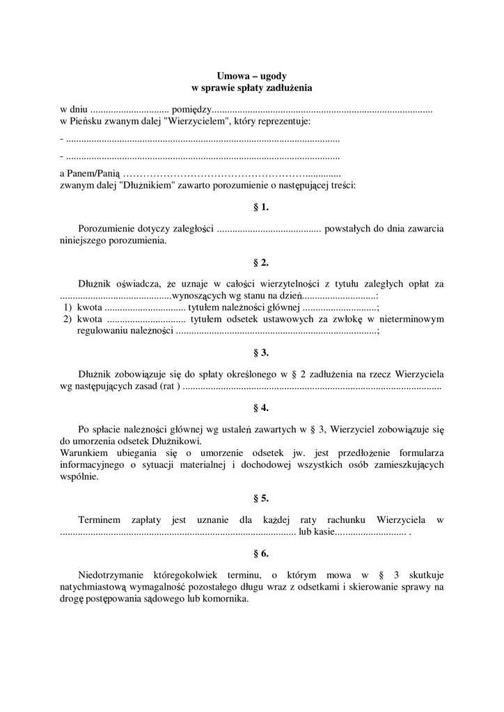 Umowa – ugody w sprawie spłaty zadłu enia w dniu ............................... pomi dzy....................................................................................... w Pie sku zwanym dalej "Wierzycielem", który reprezentuje: - ............................................................................................................ - ............................................................................................................ a Panem/Pani ……………………………………………….............. zwanym dalej "Dłu nikiem" zawarto porozumienie o nast puj cej tre ci: § 1. Porozumienie dotyczy zaległo ci ......................................... powstałych do dnia zawarcia niniejszego porozumienia. § 2. Dłu nik o wiadcza, e uznaje w cało ci wierzytelno ci z tytułu zaległych opłat za ............................................wynosz cych wg stanu na dzie .............................: 1) kwota ................................ tytułem nale no ci głównej .............................; 2) kwota ............................... tytułem odsetek ustawowych za zwłok w nieterminowym regulowaniu nale no ci ...............................................................................; § 3. Dłu nik zobowi zuje si do spłaty okre lonego w § 2 zadłu enia na rzecz Wierzyciela wg nast puj cych zasad (rat ) ...................................................................................................... § 4. Po spłacie nale no ci głównej wg ustale zawartych w § 3, Wierzyciel zobowi zuje si do umorzenia odsetek Dłu nikowi. Warunkiem ubiegania si o umorzenie odsetek jw. jest przedło enie formularza informacyjnego o sytuacji materialnej i dochodowej wszystkich osób zamieszkuj cych wspólnie. § 5. Terminem zapłaty jest uznanie dla ka dej raty rachunku Wierzyciela ............................................................................................. lub kasie............................ . w § 6. Niedotrzymanie któregokolwiek terminu, o którym mowa w § 3 skutkuje natychmiastow wymagalno pozostałego długu wraz z odsetkami i skierowanie sprawy na drog post powania s dowego lub komornika. § 7. Zmiana tre ci Porozumienia wymaga formy pisemnej pod rygorem niewa no ci. § 8. W sprawach nieuregulowanych Porozumieniem stosuje si przepisy Kodeksu Cywilnego. § 9. Porozumienie sporz dzono w dwóch jednobrzmi cych egzemplarzach, po jednej dla ka dej ze stron ........................................... ( Wierzyciel) ........................................ (Dłu nik)