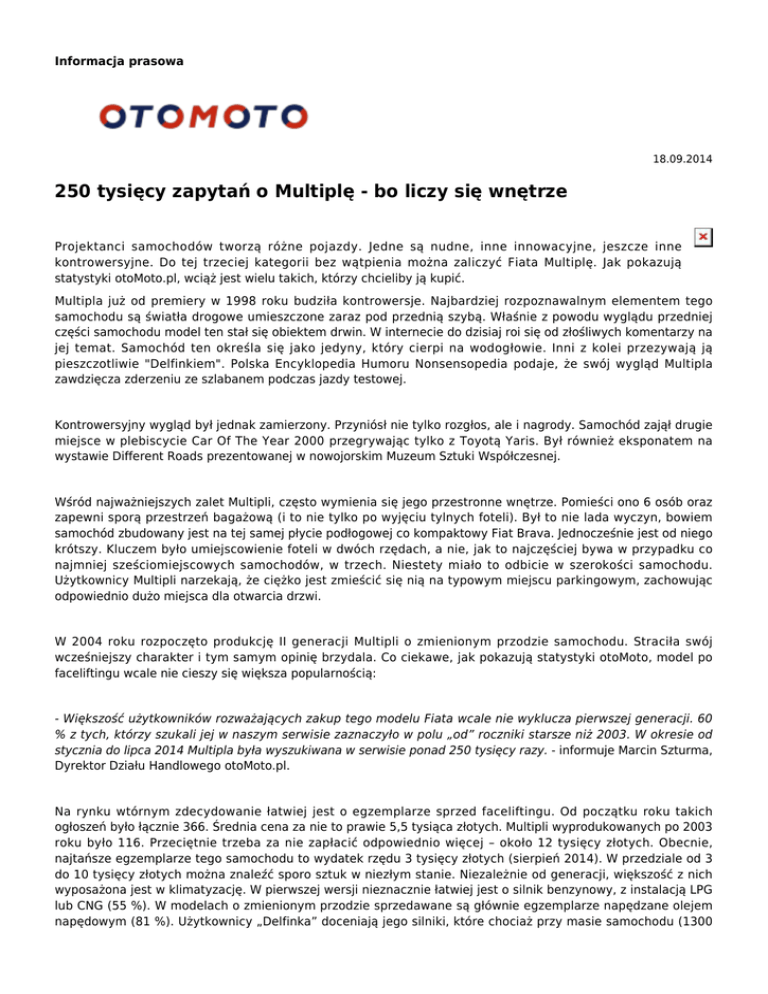Informacja prasowa 18.09.2014 250 tysięcy zapytań o Multiplę - bo liczy się wnętrze Projektanci samochodów tworzą różne pojazdy. Jedne są nudne, inne innowacyjne, jeszcze inne kontrowersyjne. Do tej trzeciej kategorii bez wątpienia można zaliczyć Fiata Multiplę. Jak pokazują statystyki otoMoto.pl, wciąż jest wielu takich, którzy chcieliby ją kupić. Multipla już od premiery w 1998 roku budziła kontrowersje. Najbardziej rozpoznawalnym elementem tego samochodu są światła drogowe umieszczone zaraz pod przednią szybą. Właśnie z powodu wyglądu przedniej części samochodu model ten stał się obiektem drwin. W internecie do dzisiaj roi się od złośliwych komentarzy na jej temat. Samochód ten określa się jako jedyny, który cierpi na wodogłowie. Inni z kolei przezywają ją pieszczotliwie "Delfinkiem". Polska Encyklopedia Humoru Nonsensopedia podaje, że swój wygląd Multipla zawdzięcza zderzeniu ze szlabanem podczas jazdy testowej. Kontrowersyjny wygląd był jednak zamierzony. Przyniósł nie tylko rozgłos, ale i nagrody. Samochód zajął drugie miejsce w plebiscycie Car Of The Year 2000 przegrywając tylko z Toyotą Yaris. Był również eksponatem na wystawie Different Roads prezentowanej w nowojorskim Muzeum Sztuki Współczesnej. Wśród najważniejszych zalet Multipli, często wymienia się jego przestronne wnętrze. Pomieści ono 6 osób oraz zapewni sporą przestrzeń bagażową (i to nie tylko po wyjęciu tylnych foteli). Był to nie lada wyczyn, bowiem samochód zbudowany jest na tej samej płycie podłogowej co kompaktowy Fiat Brava. Jednocześnie jest od niego krótszy. Kluczem było umiejscowienie foteli w dwóch rzędach, a nie, jak to najczęściej bywa w przypadku co najmniej sześciomiejscowych samochodów, w trzech. Niestety miało to odbicie w szerokości samochodu. Użytkownicy Multipli narzekają, że ciężko jest zmieścić się nią na typowym miejscu parkingowym, zachowując odpowiednio dużo miejsca dla otwarcia drzwi. W 2004 roku rozpoczęto produkcję II generacji Multipli o zmienionym przodzie samochodu. Straciła swój wcześniejszy charakter i tym samym opinię brzydala. Co ciekawe, jak pokazują statystyki otoMoto, model po faceliftingu wcale nie cieszy się większa popularnością: - Większość użytkowników rozważających zakup tego modelu Fiata wcale nie wyklucza pierwszej generacji. 60 % z tych, którzy szukali jej w naszym serwisie zaznaczyło w polu „od” roczniki starsze niż 2003. W okresie od stycznia do lipca 2014 Multipla była wyszukiwana w serwisie ponad 250 tysięcy razy. - informuje Marcin Szturma, Dyrektor Działu Handlowego otoMoto.pl. Na rynku wtórnym zdecydowanie łatwiej jest o egzemplarze sprzed faceliftingu. Od początku roku takich ogłoszeń było łącznie 366. Średnia cena za nie to prawie 5,5 tysiąca złotych. Multipli wyprodukowanych po 2003 roku było 116. Przeciętnie trzeba za nie zapłacić odpowiednio więcej – około 12 tysięcy złotych. Obecnie, najtańsze egzemplarze tego samochodu to wydatek rzędu 3 tysięcy złotych (sierpień 2014). W przedziale od 3 do 10 tysięcy złotych można znaleźć sporo sztuk w niezłym stanie. Niezależnie od generacji, większość z nich wyposażona jest w klimatyzację. W pierwszej wersji nieznacznie łatwiej jest o silnik benzynowy, z instalacją LPG lub CNG (55 %). W modelach o zmienionym przodzie sprzedawane są głównie egzemplarze napędzane olejem napędowym (81 %). Użytkownicy „Delfinka” doceniają jego silniki, które chociaż przy masie samochodu (1300 kg) nie są szczególnie dynamiczne, nie należą jednak do najbardziej awaryjnych. Chwalone są szczególnie dieslowskie JTD i MultiJet. Często podkreślaną bolączką są problemy z zawieszeniem, szczególnie przy przedniej osi. Nie można stwierdzić, ze Fiat Multipla zawojował polski rynek. Z pewnością jednak nie jest to samochód stanowiący jego margines. Nie sposób koło niej przejść obojętnie, jeżeli poszukuje się samochodu oferującego dużo przestrzeni za niezbyt wygórowaną cenę. W końcu uroda to nie wszystko. A wnętrze… wnętrze ma pojemne. O nas Serwis OTOMOTO działa już od 12 lat. Jesteśmy liderem na rynku ogłoszeń motoryzacyjnych w Polsce. Od początku naszej działalności przyświecał nam jasny cel – zadowolenie klienta. Nasz zespół to ludzie, dla których pasją jest tworzenie rozwiązań, pomagających kupować i sprzedawać pojazdy. Naszym priorytetem jest ciągły wzrost wiarygodności, dlatego nieustannie dążymy do budowania wzajemnego zaufania. OTOMOTO to nie tylko ogłoszenia. To także wiedza i unikalne statystyki, z których korzystają dziennikarze i profesjonaliści branży motoryzacyjnej.