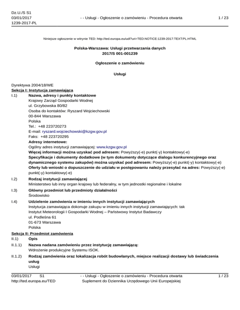Dz.U./S S1 03/01/2017 1239-2017-PL - - Usługi - Ogłoszenie o zamówieniu - Procedura otwarta 1 / 23 Niniejsze ogłoszenie w witrynie TED: http://ted.europa.eu/udl?uri=TED:NOTICE:1239-2017:TEXT:PL:HTML Polska-Warszawa: Usługi przetwarzania danych 2017/S 001-001239 Ogłoszenie o zamówieniu Usługi Dyrektywa 2004/18/WE Sekcja I: Instytucja zamawiająca I.1) Nazwa, adresy i punkty kontaktowe Krajowy Zarząd Gospodarki Wodnej ul. Grzybowska 80/82 Osoba do kontaktów: Ryszard Wojciechowski 00-844 Warszawa Polska Tel.: +48 223720273 E-mail: [email protected] Faks: +48 223720295 Adresy internetowe: Ogólny adres instytucji zamawiającej: www.kzgw.gov.pl Więcej informacji można uzyskać pod adresem: Powyższy(-e) punkt(-y) kontaktowy(-e) Specyfikacje i dokumenty dodatkowe (w tym dokumenty dotyczące dialogu konkurencyjnego oraz dynamicznego systemu zakupów) można uzyskać pod adresem: Powyższy(-e) punkt(-y) kontaktowy(-e) Oferty lub wnioski o dopuszczenie do udziału w postępowaniu należy przesyłać na adres: Powyższy(-e) punkt(-y) kontaktowy(-e) I.2) Rodzaj instytucji zamawiającej Ministerstwo lub inny organ krajowy lub federalny, w tym jednostki regionalne i lokalne I.3) Główny przedmiot lub przedmioty działalności Środowisko I.4) Udzielenie zamówienia w imieniu innych instytucji zamawiających Instytucja zamawiająca dokonuje zakupu w imieniu innych instytucji zamawiających: tak Instytut Meteorologii I Gospodarki Wodnej – Państwowy Instytut Badawczy ul. Podleśna 61 01-673 Warszawa Polska Sekcja II: Przedmiot zamówienia II.1) Opis II.1.1) Nazwa nadana zamówieniu przez instytucję zamawiającą: Wdrożenie produkcyjne Systemu ISOK. II.1.2) Rodzaj zamówienia oraz lokalizacja robót budowlanych, miejsce realizacji dostawy lub świadczenia usług Usługi 03/01/2017 S1 http://ted.europa.eu/TED - - Usługi - Ogłoszenie o zamówieniu - Procedura otwarta Suplement do Dziennika Urzędowego Unii Europejskiej 1 / 23 Dz.U./S S1 03/01/2017 1239-2017-PL - - Usługi - Ogłoszenie o zamówieniu - Procedura otwarta 2 / 23 Kategoria usług: nr 7: Usługi komputerowe i usługi z nimi związane Kod NUTS PL II.1.3) Informacje na temat zamówienia publicznego, umowy ramowej lub dynamicznego systemu zakupów (DSZ) Ogłoszenie dotyczy zamówienia publicznego II.1.4) Informacje na temat umowy ramowej II.1.5) Krótki opis zamówienia lub zakupu Przedmiotem zamówienia jest „Wdrożenie produkcyjne Systemu ISOK”. Zamówienie pn. „Wdrożenie produkcyjne Systemu ISOK” jest elementem projektu pn. „Informatyczny System Osłony Kraju przed nadzwyczajnymi zagrożeniami” (w skrócie Projekt ISOK), realizowanego w ramach VII osi priorytetowej Programu Operacyjnego Innowacyjna Gospodarka. Projekt ISOK współfinansowany jest ze środków Europejskiego Funduszu Rozwoju Regionalnego oraz budżetu państwa w ramach Programu Operacyjnego Innowacyjna Gospodarka Oś priorytetowa VII – Społeczeństwo informacyjne – budowa elektronicznej administracji (Umowa o dofinansowanie nr POIG.07.01.00-00-025/09-00 zawarta w Warszawie w dniu 30 lipca 2010 r. wraz z późniejszymi zmianami) oraz współfinansowanego ze środków Narodowego Funduszu Ochrony Środowiska i Gospodarki Wodnej (Umowa nr 16/2012/Wn50/NZ-LZ/D zawarta w Warszawie w dniu 12 stycznia 2012 r. z aneksami). Wdrożony System ISOK ma stanowić wsparcie służb zarządzania kryzysowego oraz obywateli w momencie wystąpienia nadzwyczajnych zagrożeń występujących w atmosferze, w szczególności ma służyć zwiększeniu bezpieczeństwa obywateli oraz ograniczeniu strat spowodowanych występowaniem tych zagrożeń. System ISOK będzie konsolidował informacje z istniejących systemów informatycznych Instytutu Meteorologii i Gospodarki Wodnej – Państwowego Instytutu Badawczego (IMGW-PIB), Krajowego Zarządu Gospodarki Wodnej (KZGW) i Głównego Urzędu Geodezji i Kartografii (GUGiK), a także przetwarzał i udostępniał nowe produkty oraz usługi zarówno podmiotom odpowiedzialnym i zaangażowanym w zarządzanie kryzysowe w Polsce, jak i obywatelom. Podstawową cechą systemu będzie udostępnianie usług sieciowych w architekturze SOA oraz usług zgodnych z dyrektywą INSPIRE. System ISOK będzie w sposób zasadniczy wspierał wypełnienie głównych zobowiązań wdrożeniowych Dyrektywy Powodziowej (Dyrektywa 2007/60/WE Parlamentu Europejskiego i Rady z dnia 23.10.2007 w sprawie oceny ryzyka powodziowego i zarządzania nim), które polegają na konieczności publicznego udostępniania wstępnej oceny ryzyka powodziowego (WORP), map zagrożenia powodziowego (MZP), map ryzyka powodziowego (MRP) i planów zarządzania ryzykiem powodziowym. Budowana platforma informatyczna Systemu ISOK – poprzez udostępnianie narzędzi pomagających w rozpoznawaniu oraz ostrzeganiu przed ekstremalnymi zjawiskami atmosferycznymi, hydrologicznymi oraz zdarzeniami technologicznymi (synergicznymi) – będzie narzędziem wsparcia systemu zarządzania kryzysowego w Polsce. System będzie również zestawem narzędzi (aplikacji) wspomagających zarówno działania związane z szeroko pojętym zarządzaniem gospodarką wodną – w szczególności poprzez udostępnienie narzędzi do realizacji rutynowych i incydentalnych zadań związanych z zarządzaniem, aktualizacją, przetwarzaniem czy udostępnianiem danych (np. przetwarzanie danych związanych z prowadzeniem katastru wodnego, przetwarzanie danych dotyczących zarządzania Majątkiem Skarbu Państwa, obsługę pozwoleń wodnoprawnych, informowanie o stanie zagrożeń, przeprowadzanie wymaganych analiz z wykorzystaniem informacji geoprzestrzennej, czy generowanie raportów). II.1.6) Wspólny Słownik Zamówień (CPV) 72310000, 72263000, 72265000, 72266000, 72268000, 72100000 II.1.7) Informacje na temat Porozumienia w sprawie zamówień rządowych (GPA) Zamówienie jest objęte Porozumieniem w sprawie zamówień rządowych (GPA): nie 03/01/2017 S1 http://ted.europa.eu/TED - - Usługi - Ogłoszenie o zam