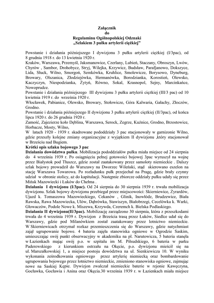Załącznik do Regulaminu Ogólnopolskiej Odznaki „Szlakiem 3 pułku artylerii ciężkiej” Powstanie i działania późniejszego I dywizjonu 3 pułku artylerii ciężkiej (I/3pac), od 8 grudnia 1918 r. do 13 kwietnia 1920 r. Kraków, Warszawa, Przemyśl, Jaksmanowice, Czerlany, Lubień, Staczany, Obroszyn, Lwów, Chyrów , Sambor, Drohobycz, Stryj, Wilejka, Krzywicz, Budsław, Parafjanowo, Dokszyce, Lida, Słuck, Wilno, Smorgoń, Semkówka, Kruhlice, Smolewicze, Borysowo, Dyneburg, Browary, Olszanica, Złodziejówka, Hermanówka, Borodzianka, Korostień, Olewsko, Kaczyczyn, Niespodzianka, Żytyń, Równo, Sokal, Krasnopol, Sejny, Marcinkańce, Nowoprudce. Powstanie i działania późniejszego III dywizjonu 3 pułku artylerii ciężkiej (III/3 pac) od 10 kwietnia 1919 r. do września 1920 r. Włocławek, Pabianice, Olewsko, Browary, Stołowicze, Góra Kalwaria, Gałachy, Złoczów, Grodno. Powstanie i działania późniejszego II dywizjonu 3 pułku artylerii ciężkiej (II/3pac), od końca lipca 1920 r. do 26 grudnia 1920 r. Zamość, Zajezierze koło Dęblina, Warszawa, Serock, Zegrze, Kuźnice, Grodno, Brzostowice, Horbacze, Mosty, Wilno, W latach 1920 - 1939 r. skadrowane pododdziały 3 pac stacjonowały w garnizonie Wilno, gdzie przeszły kolejne zmiany organizacyjne z wyjątkiem II dywizjonu ,który stacjonował w Brześciu nad Bugiem. Krótki opis szlaku bojowego 3 pac Działania dowództwa pułku. Mobilizacja pododdziałów pułku miała miejsce od 24 sierpnia do 4 września 1939 r. Po osiągnięciu pełnej gotowości bojowej 3pac wyruszył na wojnę przez Białystok pod Tłuszcz, gdzie został zaatakowany przez samoloty niemieckie . Dalszy szlak bojowy prowadził do Warszawy na Dworzec Wileński, stąd skierowano eszelon na stację Warszawa Towarowa. Po rozładunku pułk przejechał na Pragę, gdzie brały czynny udział w obronie stolicy, aż do kapitulacji. Następnie zbiorcze oddziały pułku udały się przez Mińsk Mazowiecki i Łuków do Chełma . Działania I dywizjonu (I/3pac). Od 24 sierpnia do 30 sierpnia 1939 r. trwała mobilizacja dywizjonu. Szlak bojowy dywizjonu przebiegał przez miejscowości: Skierniewice, Żyrardów, Ujazd k. Tomaszowa Mazowieckiego, Cekanów , Glinik, Inowłódz, Brudzewice, Biała Rawska, Rawa Mazowiecka, Ulów, Dąbrówka, Stawiszyn, Białobrzegi, Cecelówka k. Warki, Głowaczów, Podole Nowe k. Miszewa, Krzywda, Czeremch k. Bielska Podlaskiego. Działania II dywizjonu(II/3pac). Mobilizację zarządzono 30 sierpnia, która z przeszkodami trwała do 4 września 1939 r. Dywizjon z Brześcia trasą przez Łuków, Siedlce udał się do Warszawy, gdzie pod Milanówkiem został zaatakowany przez lotnictwo niemieckie. W Skierniewicach otrzymał rozkaz przemieszczenia się do Warszawy, gdzie natychmiast zajął ugrupowanie bojowe. 4 bateria zajęła stanowiska ogniowe w Ogrodzie Saskim, umieszczając swój punkt obserwacyjny w akademiku na pl. Narutowicza, 5 bateria stanęła w Łazienkach mając swój p.o. w szpitalu im M. Piłsudskiego, 6 bateria w parku Paderewskiego z kierunkiem ostrzału na Okęcie, p.o. dywizjonu mieścił się na ul. Marszałkowskiej 1, a miejsce postoju dowództwa na ul. Sienkiewicza 10. W wyniku wykonania ześrodkowania ogniowego przez artylerię niemiecką oraz bombardowanie ugrupowania bojowego przez lotnictwo niemieckie, zmieniono stanowiska ogniowe, zajmując nowe na Saskiej Kępie. Dywizjon zwalczał niemieckie baterie w rejonie Kawęczyna, Gocławka, Gocławia i Anina oraz Okęcia.30 września 1939 r. w Łazienkach miała miejsce ostatnia zbiórka II/3pac. Odczytano rozkaz kapitulacyjny i pożegnano kadrę i żołnierzy. Poinformowano również oficerów o decyzji gen. Rómmla, nakazującej wszystkim oficerom , pod odpowiedzialnością sądową i honorową, udać się do niewoli. Działania 1 dywizjonu artylerii ciężkiej (1 dac ) dla 1 Dywizji Piechoty Legionów . Mobilizacje dywizjonu przeprowadzono od 24 do 28 sierpnia 1939 r. w m. Wołokompie pod Wilnem. 29 sierpnia nastąpił wyjazd do planowanego rejonu koncentracji 1DPLeg. Trasa wiodła przez Grodno – Białystok do rejonu wyładowczego na odcinku Małkinia – Ostrów Maz. Po wyładunku dywizjon pomaszerował do miejsca postoju k. uroczyska Glina w pobliżu Broku. 1 września ruszył na front, 2 września dotarł m. Nagaszewo, gdzie pozostał na postoju przez 2 dni. 4 września 1 dac wraz z całą 1DPLeg. wyrusza przez Długosiodło do Różana, tam otrzymuje rozkaz natychmiastowego marszu do Pułtuska. Rano 6 września dywizjon osiągnął rejon na wschód od Pułtuska, gdzie zajął ugrupowanie bojowe. Od rana 7 września ciężkie baterie uczestniczyły w odpieraniu ataków npla na przyczółek mostowy w Pułtusku. Ogień artylerii niemieckiej skutecznie raził elementy ugrupowania bojowego 1 dac wobec powyższego po południu nadszedł rozkaz wycofania się do Wyszkowa.8 września 1dac zajął nowe stanowiska ogniowe w lesie na prawym brzegu Bugu, nękając swoim ogniem siły npla.9 września dywizjon toczył mało intensywny pojedynek z artylerią niemiecka 61 DP.Od rana 10 września 1 dac osłaniał ogniem odwrót 1 DPLeg. . po czym zwinął swoje stanowiska ogniowe i około południa dotarł w rejon Kęt. W nocy z 10/11 września rozpoczął marsz do rejonu Jakubowa. 11 września wieczorem 1 dac wyruszył, w głównej kolumnie1 DPLeg. do Kuflewa. Rejon postoju dywizjonu był kilkakrotnie atakowany przez lotnictwo npla. Wieczorem 12 września rozpoczęto marsz do nowego miejsca postoju w rejonie Wodyń. Oddział pokonywał drogę samodzielnie, szosą przez Latowicze, Oleksiankę do Żelechowa. Podczas marszu odłączyła się 2 bateria z powodu ciemności i tłoku na drodze. Dalej maszerowała samodzielnie .Pozostałość dywizjonu w godzinach nocnych została ostrzelana przez niemieckie czołgi i broń maszynowa w rejonie Miastkowa Kościelnego. Okazało się, że dywizjon wszedł w nocne ugrupowanie DPanc KEMPF. W wyniku walki nocą zaginął oficer