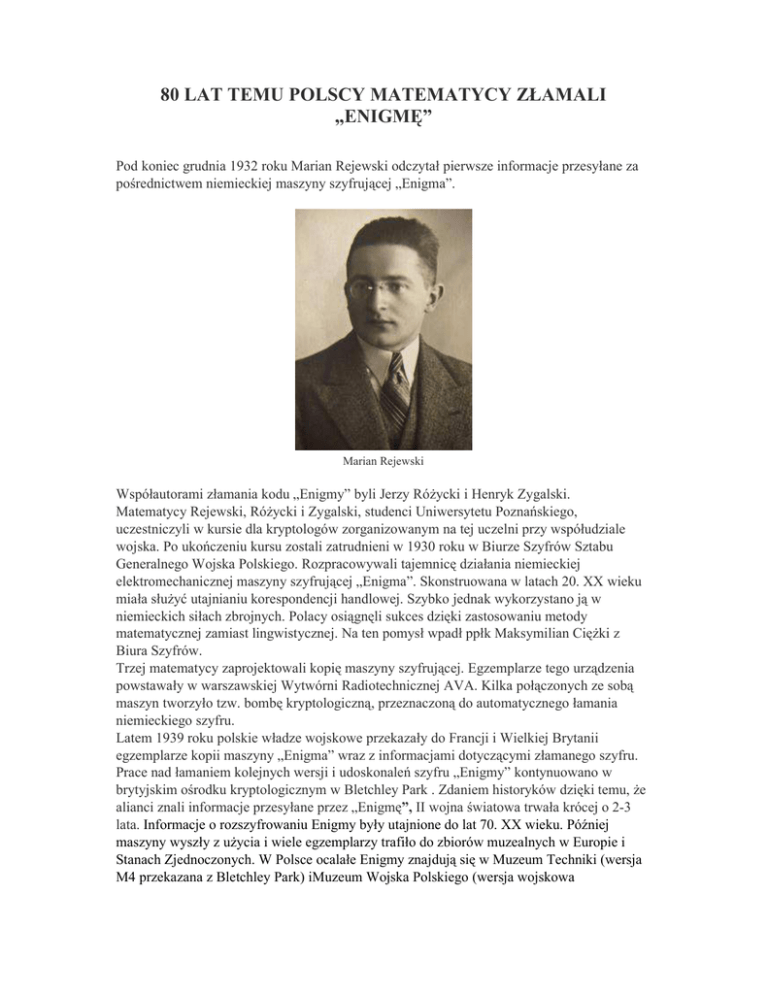 80 LAT TEMU POLSCY MATEMATYCY ZŁAMALI „ENIGMĘ” Pod koniec grudnia 1932 roku Marian Rejewski odczytał pierwsze informacje przesyłane za pośrednictwem niemieckiej maszyny szyfrującej „Enigma”. Marian Rejewski Współautorami złamania kodu „Enigmy” byli Jerzy RóŜycki i Henryk Zygalski. Matematycy Rejewski, RóŜycki i Zygalski, studenci Uniwersytetu Poznańskiego, uczestniczyli w kursie dla kryptologów zorganizowanym na tej uczelni przy współudziale wojska. Po ukończeniu kursu zostali zatrudnieni w 1930 roku w Biurze Szyfrów Sztabu Generalnego Wojska Polskiego. Rozpracowywali tajemnicę działania niemieckiej elektromechanicznej maszyny szyfrującej „Enigma”. Skonstruowana w latach 20. XX wieku miała słuŜyć utajnianiu korespondencji handlowej. Szybko jednak wykorzystano ją w niemieckich siłach zbrojnych. Polacy osiągnęli sukces dzięki zastosowaniu metody matematycznej zamiast lingwistycznej. Na ten pomysł wpadł ppłk Maksymilian CięŜki z Biura Szyfrów. Trzej matematycy zaprojektowali kopię maszyny szyfrującej. Egzemplarze tego urządzenia powstawały w warszawskiej Wytwórni Radiotechnicznej AVA. Kilka połączonych ze sobą maszyn tworzyło tzw. bombę kryptologiczną, przeznaczoną do automatycznego łamania niemieckiego szyfru. Latem 1939 roku polskie władze wojskowe przekazały do Francji i Wielkiej Brytanii egzemplarze kopii maszyny „Enigma” wraz z informacjami dotyczącymi złamanego szyfru. Prace nad łamaniem kolejnych wersji i udoskonaleń szyfru „Enigmy” kontynuowano w brytyjskim ośrodku kryptologicznym w Bletchley Park . Zdaniem historyków dzięki temu, Ŝe alianci znali informacje przesyłane przez „Enigmę”, II wojna światowa trwała krócej o 2-3 lata. Informacje o rozszyfrowaniu Enigmy były utajnione do lat 70. XX wieku. Później maszyny wyszły z uŜycia i wiele egzemplarzy trafiło do zbiorów muzealnych w Europie i Stanach Zjednoczonych. W Polsce ocalałe Enigmy znajdują się w Muzeum Techniki (wersja M4 przekazana z Bletchley Park) iMuzeum Wojska Polskiego (wersja wojskowa trójwirnikowa i handlowa) w Warszawie, Muzeum Wojska w Białymstoku i Muzeum OręŜa Polskiego w Kołobrzegu. ENIGMA na wystawie Muzeum Techniki w Warszawie W 2000 roku Marian Rejewski, Jerzy RóŜycki i Henryk Zygalski zostali pośmiertnie odznaczeni KrzyŜami Wielkimi Orderu Odrodzenia Polski. Źródło: NiezaleŜna.pl/PAP/Wikipedia