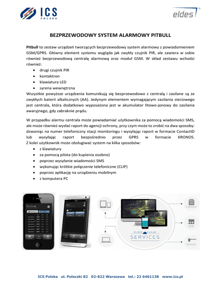 BEZPRZEWODOWY SYSTEM ALARMOWY PITBULL Pitbull to zestaw urządzeń tworzących bezprzewodowy system alarmowy z powiadomieniem GSM/GPRS. Główny element systemu wygląda jak zwykły czujnik PIR, ale zawiera w sobie również bezprzewodową centralę alarmową oraz moduł GSM. W skład zestawu wchodzi również: drugi czujnik PIR kontaktron klawiatura LED syrena wewnętrzna Wszystkie powyższe urządzenia komunikują się bezprzewodowo z centralą i zasilane są ze zwykłych baterii alkalicznych (AA). Jedynym elementem wymagającym zasilania sieciowego jest centrala, która dodatkowo wyposażona jest w akumulator litowo-jonowy do zasilania awaryjnego, gdy zabraknie prądu. W przypadku alarmu centrala może powiadamiać użytkownika za pomocą wiadomości SMS, ale może również wysłać raport do agencji ochrony, przy czym może to zrobić na dwa sposoby: dzwoniąc na numer telefoniczny stacji monitoringu i wysyłając raport w formacie ContactID lub wysyłając raport bezpośrednio przez GPRS w formacie KRONOS. Z kolei użytkownik może obsługiwać system na kilka sposobów: z klawiatury za pomocą pilota (do kupienia osobno) poprzez wysyłanie wiadomości SMS wykonując krótkie połączenie telefoniczne (CLIP) poprzez aplikację na urządzeniu mobilnym z komputera PC ICS Polska ul. Poleczki 82 02-822 Warszawa tel.: 22 6461138 www.ics.pl Nawiązanie połączenia z systemem przez aplikację mobilną możliwe jest dzięki usłudze typu Chmura udostępnianej bezpłatnie przez producenta. Aplikacja, oprócz zarządzania systemem alarmowym, umożliwia również zdalną kontrolę temperatury w poszczególnych pomieszczeniach (większość bezprzewodowych urządzeń systemu Pitbull posiada wbudowany czujnik temperatury). Zestaw alarmowy Pitbull jest wstępnie zaprogramowany i gotowy do pracy, wymaga jedynie zaprogramowania kodów użytkowników i numerów telefonów. W razie potrzeby system może zostać rozbudowany o dodatkowe urządzenia bezprzewodowe (maksymalnie do 16 elementów). W zestawie znajduje się przewód USB do połączenia centrali z komputerem, prosty program do konfiguracji urządzenia można pobrać ze strony producenta lub dystrybutora. Program jest na tyle intuicyjny, że możliwe jest zaprogramowanie systemu nawet przez osobę nieposiadającą doświadczenia w tej dziedzinie, a montaż systemu sprowadza się do ich fizycznego umocowania w odpowiednich miejscach. ICS Polska ul. Poleczki 82 02-822 Warszawa tel.: 22 6461138 www.ics.pl