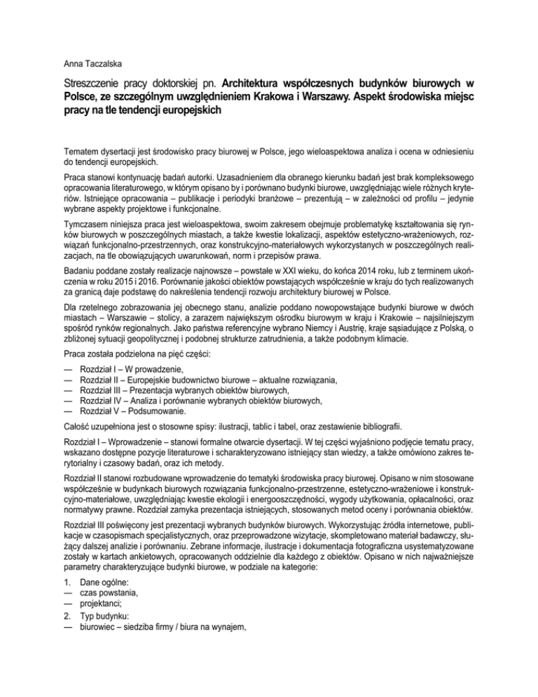 Anna Taczalska Streszczenie pracy doktorskiej pn. Architektura współczesnych budynków biurowych w Polsce, ze szczególnym uwzględnieniem Krakowa i Warszawy. Aspekt środowiska miejsc pracy na tle tendencji europejskich Tematem dysertacji jest środowisko pracy biurowej w Polsce, jego wieloaspektowa analiza i ocena w odniesieniu do tendencji europejskich. Praca stanowi kontynuację badań autorki. Uzasadnieniem dla obranego kierunku badań jest brak kompleksowego opracowania literaturowego, w którym opisano by i porównano budynki biurowe, uwzględniając wiele różnych kryteriów. Istniejące opracowania – publikacje i periodyki branżowe – prezentują – w zależności od profilu – jedynie wybrane aspekty projektowe i funkcjonalne. Tymczasem niniejsza praca jest wieloaspektowa, swoim zakresem obejmuje problematykę kształtowania się rynków biurowych w poszczególnych miastach, a także kwestie lokalizacji, aspektów estetyczno-wrażeniowych, rozwiązań funkcjonalno-przestrzennych, oraz konstrukcyjno-materiałowych wykorzystanych w poszczególnych realizacjach, na tle obowiązujących uwarunkowań, norm i przepisów prawa. Badaniu poddane zostały realizacje najnowsze – powstałe w XXI wieku, do końca 2014 roku, lub z terminem ukończenia w roku 2015 i 2016. Porównanie jakości obiektów powstających współcześnie w kraju do tych realizowanych za granicą daje podstawę do nakreślenia tendencji rozwoju architektury biurowej w Polsce. Dla rzetelnego zobrazowania jej obecnego stanu, analizie poddano nowopowstające budynki biurowe w dwóch miastach – Warszawie – stolicy, a zarazem największym ośrodku biurowym w kraju i Krakowie – najsilniejszym spośród rynków regionalnych. Jako państwa referencyjne wybrano Niemcy i Austrię, kraje sąsiadujące z Polską, o zbliżonej sytuacji geopolitycznej i podobnej strukturze zatrudnienia, a także podobnym klimacie. Praca została podzielona na pięć części: — — — — — Rozdział I – W prowadzenie, Rozdział II – Europejskie budownictwo biurowe – aktualne rozwiązania, Rozdział III – Prezentacja wybranych obiektów biurowych, Rozdział IV – Analiza i porównanie wybranych obiektów biurowych, Rozdział V – Podsumowanie. Całość uzupełniona jest o stosowne spisy: ilustracji, tablic i tabel, oraz zestawienie bibliografii. Rozdział I – Wprowadzenie – stanowi formalne otwarcie dysertacji. W tej części wyjaśniono podjęcie tematu pracy, wskazano dostępne pozycje literaturowe i scharakteryzowano istniejący stan wiedzy, a także omówiono zakres terytorialny i czasowy badań, oraz ich metody. Rozdział II stanowi rozbudowane wprowadzenie do tematyki środowiska pracy biurowej. Opisano w nim stosowane współcześnie w budynkach biurowych rozwiązania funkcjonalno-przestrzenne, estetyczno-wrażeniowe i konstrukcyjno-materiałowe, uwzględniając kwestie ekologii i energooszczędności, wygody użytkowania, opłacalności, oraz normatywy prawne. Rozdział zamyka prezentacja istniejących, stosowanych metod oceny i porównania obiektów. Rozdział III poświęcony jest prezentacji wybranych budynków biurowych. Wykorzystując źródła internetowe, publikacje w czasopismach specjalistycznych, oraz przeprowadzone wizytacje, skompletowano materiał badawczy, służący dalszej analizie i porównaniu. Zebrane informacje, ilustracje i dokumentacja fotograficzna usystematyzowane zostały w kartach ankietowych, opracowanych oddzielnie dla każdego z obiektów. Opisano w nich najważniejsze parametry charakteryzujące budynki biurowe, w podziale na kategorie: 1. — — 2. — Dane ogólne: czas powstania, projektanci; Typ budynku: biurowiec – siedziba firmy / biura na wynajem, — budynek mono- / multifunkcjonalny; 3. Aspekty estetyczno-wrażeniowe (styl architektoniczny): 4. Lokalizacja: — położenie w strukturach urbanistycznych miasta, — dojazd komunikacją zbiorową, — dojazd komunikacją indywidualną, — parking; 5. Dane ilościowe: — powierzchnia (całkowita, użytkowa z podziałem na poszczególne funkcje), — wysokość, — liczba i wysokość kondygnacji, — komunikacja pionowa (liczba dźwigów osobowych i klatek schodowych); 6. Rozwiązania konstrukcyjno-materiałowe: 7. Rozwiązania funkcjonalno-przestrzenne: — układ funkcjonalny, — układ przestrzenny, — adaptowalność układu, — oświetlenie światłem dziennym przestrzeni pracy, — funkcje uzupełniające w budynku; 8. Rozwiązania i projektowe działania proekologiczne: 9. Certyfikaty i nagrody. Karty ankietowe zostały uzupełnione o fotografie budynków, oraz schematyczne rysunki typowych kondygnacji biurowych. Prezentowane są w grupach, w podziale w zależności od lokalizacji: w Krakowie, Warszawie, Niemczech i Austrii. Każda część poprzedzona jest notą o wielkości i tendencjach rozwojowych rynków biurowych polskich (Krakowa i Warszawy), a także wybranych na podstawie liczby poddawanych dalszej analizie obiektów rynków niemieckich i Wiednia. W rozdziale IV przedstawione zostało porównanie poszczególnych budynków i szerzej – środowiska pracy biurowej w Polsce i Europie Zachodniej. Na podstawie zebranych uprzednio w kartach ankietowych informacji, opracowano tablice zbiorcze zawierające dane dotyczące wyszczególnionych grup zagadnień: Tablica 1 – Tablica 2 – Tablica 3 – Tablica 4 – Tablica 5 – Tablica 6 – Tablica 7 – Tablica 8 – Tablica 9 – Tablica 10 – Tablica 11 – Podział budynków biurowych w zależności od przeznaczenia i struktury własności, Rozwiązania formalne – aspekty estetyczno-wrażeniowe, Zestawienie danych dotyczących lokalizacji i dostępności budynków, Zestawienie danych dotyczących parkingów, Zestawienie danych dotyczących komunikacji pionowej w budynkach, Układy funkcjonalne. Zestawienie danych ilościowych i przyjętych schematów funkcjonalnych, Zestawienie czynników determinujących adaptowalność budynków biurowych do n