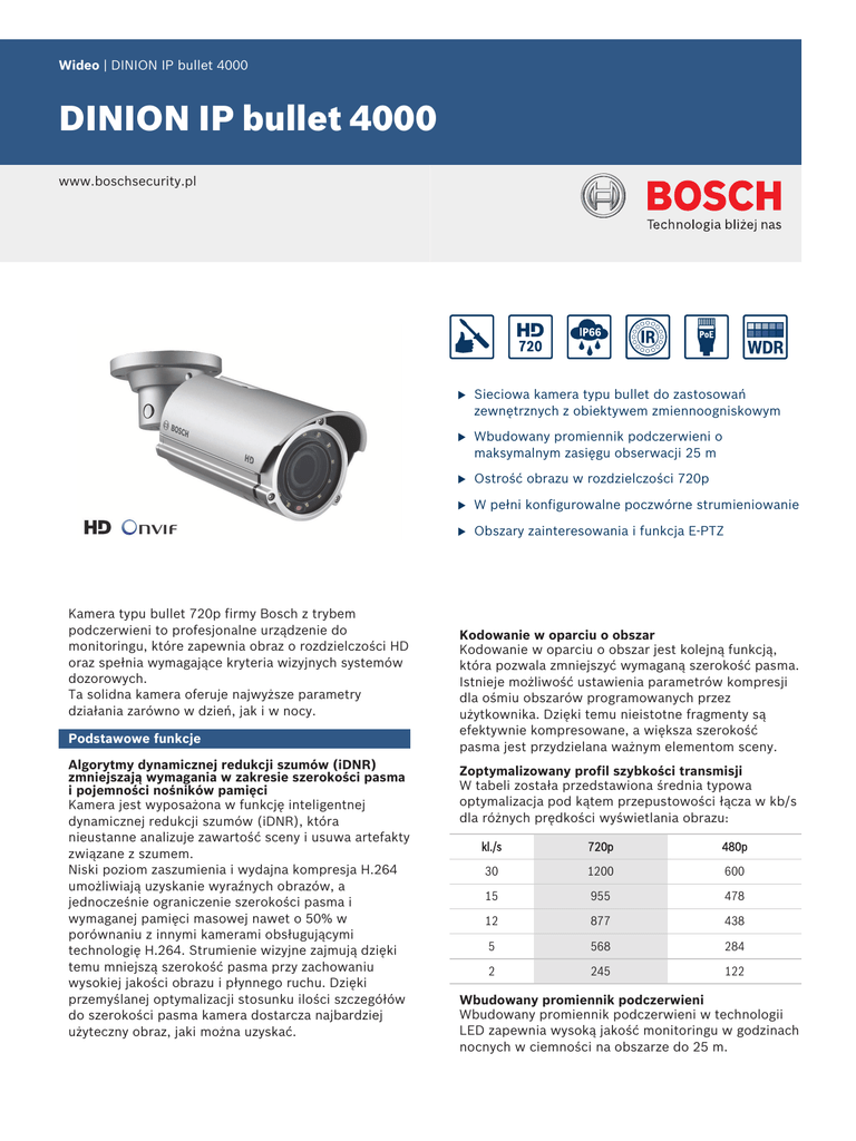 Wideo | DINION IP bullet 4000 DINION IP bullet 4000 www.boschsecurity.pl Kamera typu bullet 720p firmy Bosch z trybem podczerwieni to profesjonalne urządzenie do monitoringu, które zapewnia obraz o rozdzielczości HD oraz spełnia wymagające kryteria wizyjnych systemów dozorowych. Ta solidna kamera oferuje najwyższe parametry działania zarówno w dzień, jak i w nocy. Podstawowe funkcje Algorytmy dynamicznej redukcji szumów (iDNR) zmniejszają wymagania w zakresie szerokości pasma i pojemności nośników pamięci Kamera jest wyposażona w funkcję inteligentnej dynamicznej redukcji szumów (iDNR), która nieustanne analizuje zawartość sceny i usuwa artefakty związane z szumem. Niski poziom zaszumienia i wydajna kompresja H.264 umożliwiają uzyskanie wyraźnych obrazów, a jednocześnie ograniczenie szerokości pasma i wymaganej pamięci masowej nawet o 50% w porównaniu z innymi kamerami obsługującymi technologię H.264. Strumienie wizyjne zajmują dzięki temu mniejszą szerokość pasma przy zachowaniu wysokiej jakości obrazu i płynnego ruchu. Dzięki przemyślanej optymalizacji stosunku ilości szczegółów do szerokości pasma kamera dostarcza najbardziej użyteczny obraz, jaki można uzyskać. u Sieciowa kamera typu bullet do zastosowań zewnętrznych z obiektywem zmiennoogniskowym u Wbudowany promiennik podczerwieni o maksymalnym zasięgu obserwacji 25 m u Ostrość obrazu w rozdzielczości 720p u W pełni konfigurowalne poczwórne strumieniowanie u Obszary zainteresowania i funkcja E-PTZ Kodowanie w oparciu o obszar Kodowanie w oparciu o obszar jest kolejną funkcją, która pozwala zmniejszyć wymaganą szerokość pasma. Istnieje możliwość ustawienia parametrów kompresji dla ośmiu obszarów programowanych przez użytkownika. Dzięki temu nieistotne fragmenty są efektywnie kompresowane, a większa szerokość pasma jest przydzielana ważnym elementom sceny. Zoptymalizowany profil szybkości transmisji W tabeli została przedstawiona średnia typowa optymalizacja pod kątem przepustowości łącza w kb/s dla różnych prędkości wyświetlania obrazu: kl./s 720p 480p 30 1200 600 15 955 478 12 877 438 5 568 284 2 245 122 Wbudowany promiennik podczerwieni Wbudowany promiennik podczerwieni w technologii LED zapewnia wysoką jakość monitoringu w godzinach nocnych w ciemności na obszarze do 25 m. 2 | DINION IP bullet 4000 Kamera typu bullet do zastosowań zewnętrznych z obiektywem zmiennoogniskowym Solidna aluminiowa obudowa zapewnia dużą elastyczność instalacji. Kamera oferuje ochronę zarówno przed wodą i kurzem w trudnych warunkach oraz zapewnia ochronę klasy IP66 (NEMA 4X). Obiektyw zmiennoogniskowy 3 ÷ 10 mm pozwala wybrać obszar obserwacji najlepiej dostosowany do potrzeb użytkownika. Obsługa wielu strumieni Innowacyjna funkcja obsługi wielu strumieni umożliwia kamerze jednoczesne generowanie kilku strumieni H. 264 i strumienia M-JPEG. Strumienie te ułatwiają wyświetlanie i rejestrację obrazu przy optymalnym wykorzystaniu szerokości pasma, a także umożliwiają prostą integrację z systemami zarządzania obrazem innych producentów. Obszary zainteresowania i funkcja E-PTZ Użytkownik może zdefiniować obszary zainteresowania. Zdalne, elektroniczne sterowanie funkcjami obrotu, pochylania i powiększania (E-PTZ) umożliwia wybór określonych obszarów obrazu głównego. Obszary te można wyświetlać i rejestrować jako oddzielne strumienie. Dzięki tym strumieniom, a także strumieniowi głównemu, operator może śledzić najbardziej interesujący element sceny i zachować orientację w sytuacji. Dwukierunkowa transmisja dźwięku i sygnał alarmowy Dwukierunkowa transmisja dźwięku pozwala operatorom przekazywać komunikaty gościom i intruzom za pośrednictwem zewnętrznego wejścia i wyjścia liniowego fonii. W razie potrzeby funkcja wykrywania dźwięku może posłużyć do wyemitowania alarmu. Zabezpieczenie antysabotażowe i wykrywanie ruchu Dostępna jest szeroka gama opcji konfiguracyjnych dotyczących alarmów antysabotażowych. Wbudowany algorytm wykrywający ruch w obrazie może być również stosowany do emitowania sygnału alarmowego. Usługa chmurowa Kamera obsługuje funkcję wysyłania obrazów JPEG na podstawie czasu lub alarmu do czterech różnych kont. Mogą to być między innymi serwery FTP lub usługi przechowywania danych w chmurze (np. Dropbox). Istnieje także możliwość wyeksportowania klipów wideo i obrazów JPEG do tych kont. Po wyzwoleniu alarmu może zostać wysłane powiadomienie w wiadomości e-mail lub SMS. Dzięki temu operator jest zawsze informowany o niespodziewanych zdarzeniach. Prosta instalacja Zasilanie kamery może być zapewniane przez sieć kablową zgodną ze standardem PoE (Power-overEthernet). W takiej konfiguracji do podglądu obrazu, zasilania i sterowania kamerą wystarczy jedno połączenie kabla. Dzięki możliwości zasilania przez sieć Ethernet (PoE) instalacja stała się łatwiejsza i tańsza, ponieważ kamery nie wymagają dostępu do sieci energetycznej. Kamera może być również zasilana za pomocą zasilacza +12 VDC. W celu zwiększenia niezawodności systemu kamera może być podłączona jednocześnie do zasilania PoE oraz +12 VDC. Możliwe jest również zastosowanie zasilaczy bezprzerwowych (UPS), zapewniających pracę ciągłą nawet w przypadku awarii głównego źródła zasilania. Dla uproszczenia okablowania sieciowego kamera obsługuje funkcję Auto-MDIX, dzięki czemu można używać kabli krosowych lub prostych. Przełączanie trybu True Day/Night Kamera jest wyposażona w filtry mechaniczne zapewniające intensywne kolory w ciągu dnia i znakomite widzenie nocne, gwarantując odpowiednią ostrość niezależnie od warunków oświetleniowych. Bezpieczeństwo dostępu Kamera obsługuje trójpoziomową ochronę za pomocą hasła oraz uwierzytelnianie 802.1x. W celu zabezpieczenia dostępu przez przeglądarkę internetową należy korzystać z protokołu