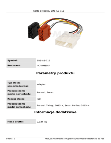 Karta produktu ZRS-AS-71B Symbol: ZRS-AS-71B Producent: 4CARMEDIA Parametry produktu Typ złącza samochodowego: Przeznaczenie marka samochodu: Rodzaj złącza: Przeznaczenie model samochodu: adapter Renault, Smart ISO Renault Twingo 2015->, Smart ForTwo 2015-> Informacje dodatkowe Masa brutto: Strona: 1 0,034 kg http://pl.4carmedia.com/product/4carmedia/adapter/zrs-as-71b