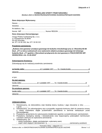 Załącznik nr 3 FORMULARZ OFERTY PRZETARGOWEJ (Konkurs ofert nr 09/KOF/PB/2016/KOTŁOWNIA OŁAWSKA/PRZYŁĄCZE GAZOWE) Dane dotyczące Wykonawcy Nazwa ......................................................................................................................... Siedziba ...................................................................................................................... Nr telefonu / fax ........................................................................................................... Numer NIP .................................................. Numer REGON .................................................. Dane dotyczące Zamawiającego: innogy Polska Contracting Sp. z o.o. ul. Powstańców Śl.28/30 53-333 Wrocław tel. 071 33 50 330, fax: 071 33 50 331 Przedmiot zamówienia: „Budowa sieci gazowej i przyłącza gazowego do budynku mieszkalnego przy ul. Oławskiej 66-68 (bud. „D”) w Jelczu-Laskowicach oraz wykonanie odejścia przyłącza gazowego do kolejnego budynku (bud. „C”) zgodnie z Warunkami przyłączenia do sieci gazowej nr PSG/5/OKP/KD-WP302402/2016 z dn. 21.04.2016” Zobowiązania Dostawcy: Zobowiązuję się do realizacji przedmiotu zamówienia za kwotę netto: ............................... zł + podatek VAT …… % = kwota brutto: ................................... zł (słownie ..................................................................................................................................................); w tym: Za sieć gazową: kwotę netto: ............................... zł + podatek VAT …… % = kwota brutto: ................................... zł (słownie ..................................................................................................................................................); Za przyłącze gazowe: kwotę netto: ............................... zł + podatek VAT …… % = kwota brutto: ................................... zł (słownie ..................................................................................................................................................); OŚWIADCZENIA: 1. Oświadczamy, że dokonaliśmy wizji lokalnej terenu budowy i jego otoczenia w dniu ............ o godz. ............ . 2. Oświadczamy, że zobowiązujemy się w przypadku wygrania konkursu ofert do zawarcia umowy o roboty budowlane objęte przedmiotem zamówienia w terminie wskazanym przez Zamawiającego. 3. Posiadamy uprawnienia do wykonywania działalności zgodnie z przedmiotowym zamówieniem. 4. Posiadamy niezbędną wiedzę i doświadczenie oraz dysponujemy potencjałem technicznym i osobami zdolnymi do wykonania zamówienia. 5. Oświadczamy, że*: - roboty budowlane objęte zamówieniem, wykonamy sami; - część robót objętych zamówieniem tj.................................................zamierzamy podzlecić. Formularz oferty – załącznik nr 3 Konkurs ofert nr 09/KOF/PB/2016/KOTŁOWNIA OŁAWSKA/PRZYŁĄCZE GAZOWE Strona 1 z 2 6. Oświadczamy, że w przypadku, gdy realizacja prac będzie wymagała udziału podwykonawców, będziemy w pełni odpowiedzialni za działania lub uchybienia każdego podwykonawcy, tak jakby to były nasze działania lub uchybienia. 7. Znajdujemy się w sytuacji ekonomicznej i finansowej zapewniającej wykonanie zamówienia. 8. Nie podlegamy wykluczeniu na podstawie art. 24 ust. 1 i 2 ustawy o zamówieniach publicznych. 9. Na każde żądanie Zamawiającego dostarczymy niezwłocznie odpowiednie dokumenty potwierdzające prawdziwość każdej z kwestii zawartej w oświadczeniu. 10. W stosunku do naszej firmy nie otwarto likwidacji oraz nie ogłoszono upadłości. 11. Zobowiązujemy się do wykonania przedmiotu zamówienia zgodnie z określonymi przez Polską Spółkę Gazownictwa sp. z o.o. Oddział we Wrocławiu warunkami przyłączenia do sieci gazowej z dn. 21.04.2016 r. 12. Oświadczamy, że zapoznaliśmy się z dokumentacją projektową przedstawioną do postępowania, 13. Oświadczamy, że uważamy się za związanych niniejszą ofertą przez okres 60 dni od upływu terminu składania ofert. 14. Udzielamy gwarancji jakości na okres 36 miesięcy od daty wykonania przedmiotu zamówienia (zarówno na sieć gazową, jak i na przyłącze gazowe) 15. Przedmiot zamówienia wykonamy w terminie 3 tyg. od przekazania pozwolenia na budowę. 16. Akceptujemy formę i termin płatności: przelew w terminie 14 dni po wykonaniu przedmiotu zamówienia i uznania przez Zamawiającego za należycie wykonany oraz po dostarczeniu do Zamawiającego prawidłowo wystawionej faktury VAT. 17. Oświadczamy, że zapoznaliśmy się z treścią wymagań ofertowych i nie wnosimy do nich żadnych zastrzeżeń oraz przyjmujemy warunki w nich zawarte. ZAŁĄCZNIKI: Integralną częścią oferty są następujące załączniki: 1. .............................................................................. .........................- nr strony oferty ................. 2. .............................................................................. .........................- nr strony oferty ................. 3. .............................................................................. .........................- nr strony oferty ................. 4. .............................................................................. .........................- nr strony oferty ................. …….................................... Miejscowość, data ………….…………………………………… (pieczątka i podpis Wykonawcy lub upoważnionych osób) *niepotrzebne skreślić Formularz oferty – załącznik nr 3 Konkurs ofert nr 09/KOF/PB/2016/KOTŁOWNIA OŁAWSKA/PRZYŁĄCZE GAZOWE Strona 2 z 2