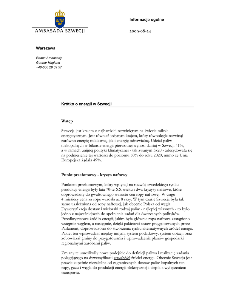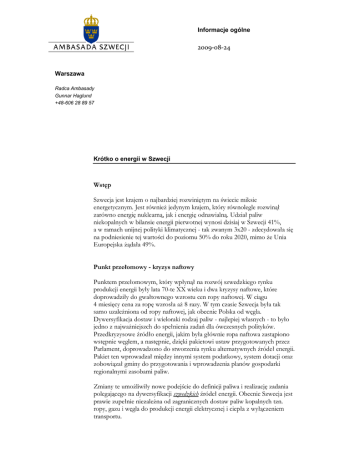 Informacje ogólne 2009-08-24 Warszawa Radca Ambasady Gunnar Haglund +48-606 28 89 57 Krótko o energii w Szwecji Wstęp Szwecja jest krajem o najbardziej rozwiniętym na świecie miksie energetycznym. Jest równieŜ jedynym krajem, który równolegle rozwinął zarówno energię nuklearną, jak i energię odnawialną. Udział paliw niekopalnych w bilansie energii pierwotnej wynosi dzisiaj w Szwecji 41%, a w ramach unijnej polityki klimatycznej - tak zwanym 3x20 - zdecydowała się na podniesienie tej wartości do poziomu 50% do roku 2020, mimo Ŝe Unia Europejska Ŝądała 49%. Punkt przełomowy - kryzys naftowy Punktem przełomowym, który wpłynął na rozwój szwedzkiego rynku produkcji energii były lata 70-te XX wieku i dwa kryzysy naftowe, które doprowadziły do gwałtownego wzrostu cen ropy naftowej. W ciągu 4 miesięcy cena za ropę wzrosła aŜ 8 razy. W tym czasie Szwecja była tak samo uzaleŜniona od ropy naftowej, jak obecnie Polska od węgla. Dywersyfikacja dostaw i wieloraki rodzaj paliw - najlepiej własnych - to było jedno z najwaŜniejszch do spełnienia zadań dla ówczesnych polityków. Przedkryzysowe źródło energii, jakim była głównie ropa naftowa zastąpiono wstępnie węglem, a następnie, dzięki pakietowi ustaw przygotowanych przez Parlament, doprowadzono do stworzenia rynku alternatywnych źródeł energii. Pakiet ten wprowadzał między innymi system podatkowy, system dotacji oraz zobowiązał gminy do przygotowania i wprowadzenia planów gospodarki regionalnymi zasobami paliw. Zmiany te umoŜliwiły nowe podejście do definicji paliwa i realizację zadania polegającego na dywersyfikacji szwedzkich źródeł energii. Obecnie Szwecja jest prawie zupełnie niezaleŜna od zagranicznych dostaw paliw kopalnych tzn. ropy, gazu i węgla do produkcji energii elektrycznej i ciepła z wyłączeniem transportu. 2(12) Ambasada Szwecji Warszawa 2009-08- Zmiany zostały wprowadzone z uwzględnieniem potrzeb energetycznych. Równocześnie zaostrzono normy ochrony środowiska, mając jednak na uwadze zachowanie konkurencyjności bardzo energochłonnego szwedzkiego przemysłu tzn. kopalnie, huty stali, fabryki papieru i przemysł chemiczny. W ten sposób zmniejszono uzaleŜnienie od importu energii i fluktuacji na międzynarodowych rynkach energii oraz zredukowano – co nie było tak waŜnym czynnikiem w tamtych latach jak dzisiaj – emisje kopalnego CO2. Dzisiaj, dodatkowym aspektem wynikającym z przynaleŜności do Unii Europejskiej jest konieczność wypełnienia Dyrektyw Klimatycznych i Odpadowych, które mają duŜy wpływ na politykę energetyczno-paliwową. Według szwedzkich ekspertów Polska jest jednym z krajów, który dzięki duŜej populacji i przywiązaniu do rolnictwa ma najlepsze w UE przesłanki, aby powtórzyć tak zwany szwedzki cud energetyczny. Oszczędzanie i szanowanie energii oraz efektywizacja energetyczna NajwaŜniejszym celem polityki energetycznej Szwecji ostatnich lat była energooszczędność i efektywizacja energetyczna, co miało olbrzymie znaczenie dla zmniejszenia kosztów funkcjonowania całej gospodarki. ZuŜycie energii w Szwecji od około 25 lat pozostaje na mniej więcej tym samym poziomie - przy wzroście PKB o około 80 % w tym samym czasie. - Najtańsza energia to ta energia, która nigdy nie została wyprodukowana i nigdy nie została zuŜyta. Warto oszczędzać energię. Efektywność wzmacnia konkurencyjność. Oszczędność i efektywizacja wypełniły w 75 % wzrostu zapotrzebowania na energię w Szwecji od roku 1970 do dnia dzisiejszego, a tylko 25 % to nowe moce wytwórcze, głównie energia nuklearna, spalarnie odpadów komunalnych i kotłownie opalane biomasą. MoŜna zatem stwierdzić, Ŝe gdyby nie zwiększenie efektywności energetycznej konieczna byłaby budowa trzykrotnie więcej jednostek energetycznych aniŜeli wybudowano. Jest wiele sposobów na oszczędzanie energii. Zawsze przy wyborze metody jest to sprawa optymalizacji dla danych warunków. Oto jeden przykład oszczędności w gminie zuŜycia energii elektrycznej do oświetlenia ulic przy uŜyciu lamp energooszczędnych: Ogromny zysk w zmniejszeniu zuŜycia energii oświetleniowej nastąpił tylko dlatego, Ŝe właścicielem słupa i lampy jest ten, który płaci za energię, czyli gmina, a nie dystrybutor energii. Dlatego opłacalne stało się inwestowanie w Ŝarówki energooszczędne, przyciemniacze oświetlenia. Drugą inicjatywą było zainstalowanie czujek ruchu, które miały doprowadzić do automatycznej oszczędności energii elektrycznej uŜywanej do oświetlania gminnych pomieszczeń biurowych. Okazało się, Ŝe nikt nie odczuł niedogodności, Ŝe oświetlano tylko pomieszczenia, w których znajdują się ludzie. Efektem była oszczędność zuŜycia energii o 85%. Czas spłaty inwestycji to 3,5 roku. 3(12) Ambasada Szwecji Warszawa 2009-08- W Szwecji mówi się, Ŝe trzeba znaleźć te miejsca, gdzie najłatwiej zbierać owoce, czyli tam gdzie owoce wiszą najbliŜej ziemi. Sieć ciepłownicza Zarówno w Szwecji, jak i w Polsce sieć ciepłownicza odgrywa waŜną rolę. Zapewne większość rzeczy w czasach komunistycznych była zła, ale istnieje jeden wyjątek: sieć ciepłownicza, która umoŜliwia pewną, przewidywalną i efektywną dystrybucję ciepła oraz zagospodarowanie róŜnych rodzajów ciepła odpadowego. Sieć ciepłownicza oszczędza więc i szanuje energię. Około 50% ciepła w Szwecji dystrybuowane jest przy pomocy sieci ciepłowniczej, która posiada zbliŜone do polskiej parametry techniczne, chociaŜ szwedzkie firmy z branŜy twierdzą, Ŝe moŜna zefektywizować polską sieć ciepłowniczą o jakieś 20-40%, szczególnie jeśli chodzi o akumulację ciepła i regulację sieci. Zaopatrzenie w ciepło poza siecią ciepłowniczą (wieś, gospodarstwa, wille, letniska itp.) odbywa się poprzez grzejniki elektryczne, płytką geotermię wraz z pompą ciepła oraz spalanie peletów i drewna. Ciepłą wodę uŜytkową produk