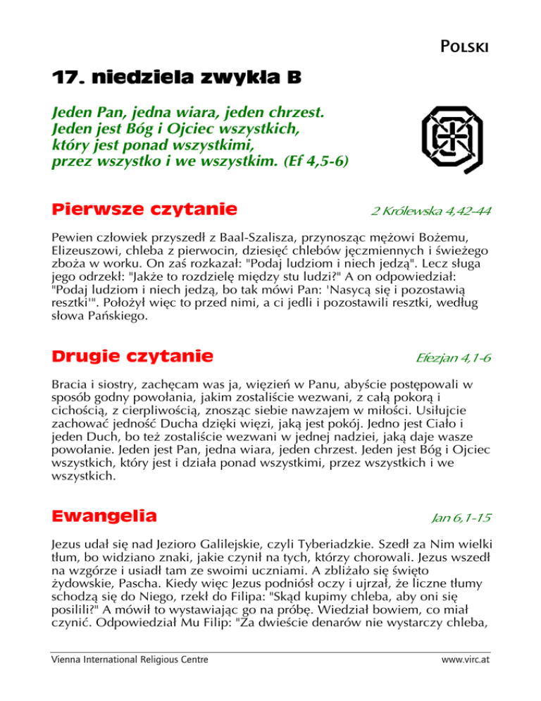Polski Jeden Pan, jedna wiara, jeden chrzest. Jeden jest Bóg i Ojciec wszystkich, który jest ponad wszystkimi, przez wszystko i we wszystkim. (Ef 4,5-6) Pewien człowiek przyszedł z Baal-Szalisza, przynosząc mężowi Bożemu, Elizeuszowi, chleba z pierwocin, dziesięć chlebów jęczmiennych i świeżego zboża w worku. On zaś rozkazał: "Podaj ludziom i niech jedzą". Lecz sługa jego odrzekł: "Jakże to rozdzielę między stu ludzi?" A on odpowiedział: "Podaj ludziom i niech jedzą, bo tak mówi Pan: 'Nasycą się i pozostawią resztki'". Położył więc to przed nimi, a ci jedli i pozostawili resztki, według słowa Pańskiego. Bracia i siostry, zachęcam was ja, więzień w Panu, abyście postępowali w sposób godny powołania, jakim zostaliście wezwani, z całą pokorą i cichością, z cierpliwością, znosząc siebie nawzajem w miłości. Usiłujcie zachować jedność Ducha dzięki więzi, jaką jest pokój. Jedno jest Ciało i jeden Duch, bo też zostaliście wezwani w jednej nadziei, jaką daje wasze powołanie. Jeden jest Pan, jedna wiara, jeden chrzest. Jeden jest Bóg i Ojciec wszystkich, który jest i działa ponad wszystkimi, przez wszystkich i we wszystkich. Jezus udał się nad Jezioro Galilejskie, czyli Tyberiadzkie. Szedł za Nim wielki tłum, bo widziano znaki, jakie czynił na tych, którzy chorowali. Jezus wszedł na wzgórze i usiadł tam ze swoimi uczniami. A zbliżało się święto żydowskie, Pascha. Kiedy więc Jezus podniósł oczy i ujrzał, że liczne tłumy schodzą się do Niego, rzekł do Filipa: "Skąd kupimy chleba, aby oni się posilili?" A mówił to wystawiając go na próbę. Wiedział bowiem, co miał czynić. Odpowiedział Mu Filip: "Za dwieście denarów nie wystarczy chleba, Vienna International Religious Centre www.virc.at aby każdy z nich mógł choć trochę otrzymać". Jeden z uczniów Jego, Andrzej, brat Szymona Piotra, rzekł do Niego: "Jest tu jeden chłopiec, który ma pięć chlebów jęczmiennych i dwie ryby, lecz cóż to jest dla tak wielu?" Jezus zatem rzekł: "Każcie ludziom usiąść". A w miejscu tym było wiele trawy. Usiedli więc mężczyźni, a liczba ich dochodziła do pięciu tysięcy. Jezus więc wziął chleby i odmówiwszy dziękczynienie, rozdał siedzącym; podobnie uczynił i z rybami rozdając tyle, ile kto chciał. A gdy się nasycili, rzekł do uczniów: "Zbierzcie pozostałe ułomki, aby nic nie zginęło". Zebrali więc i ułomkami z pięciu chlebów jęczmiennych, które zostały po spożywających, napełnili dwanaście koszów. A kiedy ci ludzie spostrzegli, jaki cud uczynił Jezus, mówili: "Ten prawdziwie jest prorokiem, który miał przyjść na świat". Gdy więc Jezus poznał, że mieli przyjść i porwać Go, aby Go obwołać królem, sam usunął się znów na górę. Wielka rzesza ludzi zgromadziła się przy Jezusie. Z wielu stron zbiegali się ludzie do Jezusa, gdyż widzieli Jego cudowne dzieła. Jezus występuje tutaj jako nowy Mojżesz, jako nowy – wskazujący drogę – prorok, jednakże nie jako król. On akceptuje, co prawda, tę niestabilną przyczynę wielkiego zainteresowania ludzi (niezwykłą siłę przyciągającą cudowności), jednak chce poprowadzić ich do istoty rzeczy. Gdy spostrzega, że ludzie wykorzystują Jego cuda do umacniania swojej pozycji, manipulują Nim dla własnych celów, wówczas odchodzi od nich i czyni się nieuchwytnym. Być może dlatego, że wie, iż władza tego świata prowadzi do zniewolenia i grabieży. Tym, którzy nie szukają Jego mocy po to, by wzmocnić swoją pozycję, chce coś pokazać: nie odsyła ludzi z niczym, aby troszczyli się o samych siebie. On ukazuje im swoją, nową drogę, drogę wzajemności, która rozpoczyna się od tego, co już mają – nawet jeśli jest to tylko pięć chlebów i dwie ryby. Ludzie zostają włączeni w przygotowanie posiłku. Andrzej wskazuje Jezusowi chłopca, który oddaje do dyspozycji to niewiele, które ma. To oznacza, że rozmnożenie chleba rozpoczyna się nie z niczego, lecz z gotowości chłopca do dzielenia się swoją własnością. Ten, kto chce stać się błogosławieństwem dla innych, musi przynieść Jezusowi to, co posiada. Jezus nie oczekuje od nas czegoś, czego nie mamy; w Jego dłoniach rozmnaża się nasze skromne posiadanie. "Gdy każdy da to, co ma, wszyscy będą nasyceni." – mówi pieśń. Jezus stoi w centrum jako dawca życia w pełni, w nadmiarze. Jako ten, kto wynosi to, co małe (chleb i ryby) i rozmnaża. Jako ten, kto chce, aby nic się nie zmarnowało; ten, kto daje ludziom przyszłość i gromadzi ich w postawie wdzięczności wokół Ojca. Gdy owoce tej ziemi są ofiarowywane Bogu we wdzięczności, wówczas to, co codzienne staje się tym, co daje życie. Podobnie jak dary ziemi również my jesteśmy sobie podarowani: dziecko rodzicom, brat siostrze, mężczyzna kobiecie, przyjaciółka przyjacielowi. Nie może się zmarnować to, co zostało podarowane przez Boga. Jeśli przyniesiemy do Ojca to, co nas codziennie żywi, co dla nas oznacza życie, wówczas otrzyma ono swój pierwotny sens. Nie będziemy wtedy patrzeć na ludzi i rzeczy tej ziemi z pożądliwością posiadania, lecz w pokorze i czci. W ten sposób zostanie odnowione oblicze ziemi. Vienna International Religious Centre [email protected]