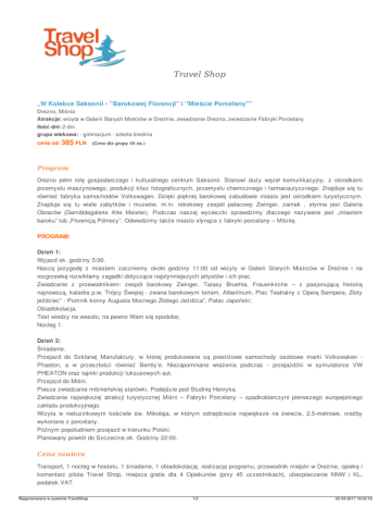 Travel Shop „W Kolebce Saksonii - "Barokowej Florencji" i "Mieście Porcelany"” Drezno, Miśnia Atrakcje: wizyta w Galerii Starych Mistrzów w Dreźnie, zwiedzanie Drezna, zwiedzanie Fabryki Porcelany ilość dni: 2 dni grupa wiekowa: - gimnazjum - szkoła średnia cena od: 385 PLN (Cena dla grupy 45 os.) Program Drezno pełni rolę gospodarczego i kulturalnego centrum Saksonii. Stanowi duży węzeł komunikacyjny, z ośrodkami przemysłu maszynowego, produkcji klisz fotograficznych, przemysłu chemicznego i farmaceutycznego. Znajduje się tu również fabryka samochodów Volkswagen. Dzięki pięknej barokowej zabudowie miasto jest ośrodkiem turystycznym. Znajduje się tu wiele zabytków i muzeów, m.in. rokokowy zespół pałacowy Zwinger, zamek , słynna jest Galeria Obrazów (Gemäldegalerie Alte Meister). Podczas naszej wycieczki sprawdzimy dlaczego nazywane jest „miastem baroku” lub „Florencją Północy”. Odwiedzimy także miasto słynące z fabryki porcelany – Miśnię. PROGRAM: Dzień 1: Wyjazd ok. godziny 5:00. Naszą przygodę z miastem zaczniemy około godziny 11:00 od wizyty w Galerii Starych Mistrzów w Dreźnie i na rozgrzewkę rozwikłamy zagadki dotyczące najsłynniejszych artystów i ich prac. Zwiedzanie z przewodnikiem: zespół barokowy Zwinger, Tarasy Bruehla, Frauenkirche – z pasjonującą historią najnowszą, katedra p.w. Trójcy Świętej - zwana barokowym tortem, Albertinum, Plac Teatralny z Operą Sempera, Złoty jeździec" - Pomnik konny Augusta Mocnego Złotego Jeźdźca”, Pałac Japoński; Obiadokolacja. Test wiedzy na wesoło, na pewno Wam się spodoba; Nocleg 1. Dzień 2: Śniadanie. Przejazd do Szklanej Manufaktury, w której produkowane są prestiżowe samochody osobowe marki Volkswaken Phaeton, a w przeszłości również Bently’e. Niezapomniane wrażenia podczas - przejażdżki w symulatorze VW PHEATON oraz tajniki produkcji luksusowych aut. Przejazd do Miśni. Piesze zwiedzanie miśnieńskiej starówki. Podejście pod Studnię Henryka. Zwiedzanie największej atrakcji turystycznej Miśni – Fabryki Porcelany – spadkobierczyni pierwszego europejskiego zakładu produkcyjnego. Wizyta w nietuzinkowym kościele św. Mikołaja, w którym odnajdziecie największe na świecie, 2,5-metrowe, rzeźby wykonane z porcelany. Późnym popołudniem przejazd w kierunku Polski. Planowany powrót do Szczecina ok. Godziny 22:00. Cena zawiera Transport, 1 nocleg w hostelu, 1 śniadanie, 1 obiadokolację, realizację programu, przewodnik miejski w Dreźnie, opiekę i komentarz pilota Travel Shop, miejsca gratis dla 4 Opiekunów (przy 45 uczestnikach), ubezpieczenie NNW i KL, podatek VAT. Wygenerowane w systemie TravelShop 1/2 02-03-2017 16:02:16 Cena nie zawiera: Biletów wstępu do atrakcji turystycznych, ok. 20 €/os. Dodatkowe informacje Wygenerowane w systemie TravelShop 2/2 02-03-2017 16:02:16