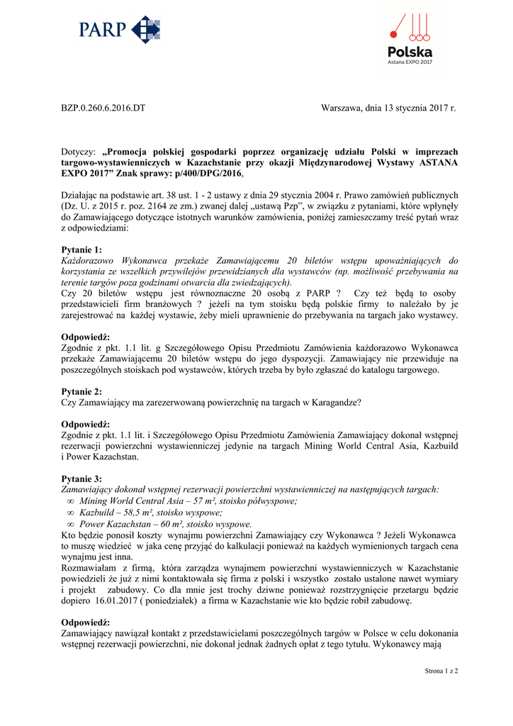 BZP.0.260.6.2016.DT Warszawa, dnia 13 stycznia 2017 r. Dotyczy: „Promocja polskiej gospodarki poprzez organizację udziału Polski w imprezach targowo-wystawienniczych w Kazachstanie przy okazji Międzynarodowej Wystawy ASTANA EXPO 2017” Znak sprawy: p/400/DPG/2016, Działając na podstawie art. 38 ust. 1 - 2 ustawy z dnia 29 stycznia 2004 r. Prawo zamówień publicznych (Dz. U. z 2015 r. poz. 2164 ze zm.) zwanej dalej „ustawą Pzp”, w związku z pytaniami, które wpłynęły do Zamawiającego dotyczące istotnych warunków zamówienia, poniżej zamieszczamy treść pytań wraz z odpowiedziami: Pytanie 1: Każdorazowo Wykonawca przekaże Zamawiającemu 20 biletów wstępu upoważniających do korzystania ze wszelkich przywilejów przewidzianych dla wystawców (np. możliwość przebywania na terenie targów poza godzinami otwarcia dla zwiedzających). Czy 20 biletów wstępu jest równoznaczne 20 osobą z PARP ? Czy też będą to osoby przedstawicieli firm branżowych ? jeżeli na tym stoisku będą polskie firmy to należało by je zarejestrować na każdej wystawie, żeby mieli uprawnienie do przebywania na targach jako wystawcy. Odpowiedź: Zgodnie z pkt. 1.1 lit. g Szczegółowego Opisu Przedmiotu Zamówienia każdorazowo Wykonawca przekaże Zamawiającemu 20 biletów wstępu do jego dyspozycji. Zamawiający nie przewiduje na poszczególnych stoiskach pod wystawców, których trzeba by było zgłaszać do katalogu targowego. Pytanie 2: Czy Zamawiający ma zarezerwowaną powierzchnię na targach w Karagandze? Odpowiedź: Zgodnie z pkt. 1.1 lit. i Szczegółowego Opisu Przedmiotu Zamówienia Zamawiający dokonał wstępnej rezerwacji powierzchni wystawienniczej jedynie na targach Mining World Central Asia, Kazbuild i Power Kazachstan. Pytanie 3: Zamawiający dokonał wstępnej rezerwacji powierzchni wystawienniczej na następujących targach: • Mining World Central Asia – 57 m², stoisko półwyspowe; • Kazbuild – 58,5 m², stoisko wyspowe; • Power Kazachstan – 60 m², stoisko wyspowe. Kto będzie ponosił koszty wynajmu powierzchni Zamawiający czy Wykonawca ? Jeżeli Wykonawca to muszę wiedzieć w jaka cenę przyjąć do kalkulacji ponieważ na każdych wymienionych targach cena wynajmu jest inna. Rozmawiałam z firmą, która zarządza wynajmem powierzchni wystawienniczych w Kazachstanie powiedzieli że już z nimi kontaktowała się firma z polski i wszystko zostało ustalone nawet wymiary i projekt zabudowy. Co dla mnie jest trochy dziwne ponieważ rozstrzygnięcie przetargu będzie dopiero 16.01.2017 ( poniedziałek) a firma w Kazachstanie wie kto będzie robił zabudowę. Odpowiedź: Zamawiający nawiązał kontakt z przedstawicielami poszczególnych targów w Polsce w celu dokonania wstępnej rezerwacji powierzchni, nie dokonał jednak żadnych opłat z tego tytułu. Wykonawcy mają Strona 1 z 2 obowiązek skontaktowania się we własnym zakresie z głównymi organizatorami targów lub ich przedstawicielami w Polsce w celu uzyskania informacji na temat kosztów najmu powierzchni. Przedstawicielem targów Kazbuild, Mining World Central Asia oraz Power/ReEnergy/Lighting Kazakhstan w Polsce jest firma ITE Poland Sp. z o.o. Pytanie 4: Targi „Mining Week” Kazachstan 2017, Karaganda, 27-29 czerwca 2017 r Kto będzie ponosił koszty wynajmu powierzchni Zamawiający czy Wykonawca ? Jeżeli wykonawca to muszę wiedzieć w jaka cenę przyjąć do kalkulacji. Odpowiedź: Koszty najmu powierzchni na targach Mining Week w Karagandzie pokrywa Wykonawca. Wykonawcy mają obowiązek skontaktowania się we własnym zakresie z głównymi organizatorami tych targów lub ich przedstawicielami w Polsce w celu uzyskania informacji na temat kosztów najmu powierzchni. Przedstawicielem targów Mining Week w Polsce jest firma World Expo International Sp. z o.o. Pytanie 5: Co po zakończeniu targów czy zabudowa idzie do utylizacji za co tez trzeba zapłacić? Czy tez Wykonawca powinien dostarczyć zabudowę do Zamawiającego. Ponieważ zabudowa stoiska na wszystkich wystawach jest podobna można ją przechowywać i transportować. Odpowiedź: Wykonawca jest odpowiedzialny za montaż i demontaż poszczególnych stoisk w Kazachstanie, w tym pokrycie wszelkich kosztów w tym zakresie. Decyzja nt. sposóbu utylizacji lub ewentualnego przechowywania elementów stoisk należy do Wykonawcy. Anna Zaręba Przewodnicząca Komisji Przetargowej Strona 2 z 2