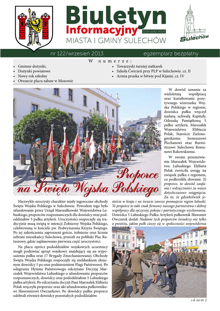 nr 122/wrzesień 2013 • • • • Gminne dożynki, Dożynki powiatowe Nowy rok szkolny Otwarcie placu zabaw w Mozowie W egzemplarz bezpłatny n u m e r z e : • Towarzyski turniej siatkarek • Szkoła Ćwiczeń przy PLP w Sulechowie. cz. II • Armia pruska w bitwie pod Kijami. cz. IV W dowód uznania za wieloletnią współpracę oraz kształtowanie pozytywnego wizerunku Wojska Polskiego w regionie, dowódca pułku wręczył nadaną uchwałą Kapituły, Odznakę Pamiątkową 5 pułku artylerii, Marszałek Województwa Elżbiecie Polak, Staroście Zielonogórskiemu Ireneuszowi Plechanowi oraz Burmistrzowi Sulechowa Romanowi Rakowskiemu. W swoim przemówieniu Marszałek Województwa Lubuskiego Elżbieta Polak zwróciła uwagę na związek pułku z regionem, co podkreśliła słowami: Te proporce, to dowód zaufania i wdzięczności za wasze dotychczasowe osiągnięcia. Za to, że gdziekolwiek jesteście w kraju i na świecie zawsze promujecie region lubuski. Te proporce to taki znak firmowy naszego partnerstwa i dobrej współpracy dla ojczyzny, pokoju i patriotycznego wychowania. Dowódca 5 Lubuskiego Pułku Artylerii pułkownik Sławomir Owczarek dodał: Nadanie tych proporców świadczy nie tylko o prestiżu, jakim pułk cieszy się w społeczności województwa Proporce na Święto Wojska Polskiego Niezwykle uroczysty charakter miały tegoroczne obchody Święta Wojska Polskiego w Sulechowie. Powodem tego było ufundowanie przez Urząd Marszałkowski Województwa Lubuskiego, proporców rozpoznawczych dla dowódcy oraz pododdziałów 5 pułku artylerii. Uroczystości rozpoczęły się tradycyjnie mszą świętą w intencji Żołnierzy Wojska Polskiego, celebrowaną w kościele pw. Podwyższenia Krzyża Świętego. Po jej zakończeniu zaproszeni goście, żołnierze oraz licznie zebrani mieszkańcy Sulechowa, przeszli na pobliski Plac Ratuszowy, gdzie zaplanowano pierwsza część uroczystości. Na placu oprócz pododdziałów wojskowych uczestnicy mogli podziwiać sprzęt wojskowy znajdujący się na wyposażeniu pułku oraz 17 Brygady Zmechanizowanej. Obchody Święta Wojska Polskiego rozpoczęły się meldunkiem złożonym dowódcy 5 pa oraz podniesieniem Flagi Państwowej. Po odegraniu Hymnu Państwowego odczytano Decyzję Marszałek Województwa Lubuskiego o ufundowaniu proporców rozpoznawczych, dowódcy oraz pododdziałom 5 Lubuskiego pułku artylerii. Po odczytaniu decyzji Pani Marszałek Elżbieta Polak wręczyła proporzec oraz akt ufundowania pułkownikowi Sławomirowi Owczarkowi. Po dowódcy pułku proporce odebrali również dowódcy pozostałych pododdziałów. c.d. na str. 2 2 BIULET YN INFORMACYJNY Nr 122 lubuskiego, ale również potwierdza jego silny związek z naszym regionem. Służący pod proporcami żołnierze będą mogli się mocniej identyfikować oraz budować wokół nich tradycję swoich komórek organizacyjnych. Po przemówieniach wręczono przyznane żołnierzom odznaczenia i medale, po czym swoje umiejętności z musztry paradnej zaprezentowali żołnierze 2 dywizjonu artylerii samobieżnej. Dla uczczenia Święta Wojska Polskiego, Kurkowe Bractwo Strzeleckie ze Zbąszynia oddało salwę armatnią. Był to sygnał do rozpoczęcia defilady. Oprócz żołnierzy mieszkańcom Sulechowa zaprezentowały się również pojazdy będą- Wr z e s i e ń 2 0 1 3 ce na wyposażeniu pułku oraz 17 BZ. Po zakończeniu pierwszej części uroczystości uczestnicy przemieścili się na pobliski Plac Biskupa Wilhelma Pluty, gdzie pod Pomnikiem Chwały Oręża Polskiego odbył się Apel Pamięci. W swoim przemówieniu Burmistrz Sulechowa Roman Rakowski nawiązał do bardzo dobrej współpracy miasta ze stacjonującym w Sulechowie wojskiem. Życzył przy tej okazji żołnierzom satysfakcji ze służby oraz sukcesów w szkoleniu. Uroczystość zakończyło złożenie wiązanek i kwiatów pod Pomnikiem Chwały Oręża Polskiego. kpt. Marcin Stajkowski a sz a pr a z ry u lt Ku m Do i sk w Sulecho na zajęcia w sezonie 2013/2014 lny została przy Oferta zajęć na najbliższy rok szko ie odbiorców. gotowana z myślą o jak największej grup ane, zwłaszcza Znajdują się w niej sprawdzone i lubi ne, wokalne, naprzez najmłodszych, zajęcia plastycz Zamkowej Akauka gry na keyboardzie oraz zajęcia demii Małego Rycerza i Małej Damy. na zajęcia Pracownia Multimedialna zaprasza owej oraz zaz grafiki komputerowej, fotografii cyfr cznych w tym jęcia multimedialne. Wśród zajęć tane i taniec brzucha. roku obok hip-hopu pojawi się balet jak w latach poprzedW SDK odbywać się będą również, na gitarze, zajęcia Uninich: nauka gry w szachy, nauka gry ia klubu brydżowego. wersytetu Trzeciego Wieku i spotkan ostaje sala bilardowa Do dyspozycji zainteresowanych poz . Szczegółowe infororaz sala prób dla zespołów muzycznych oraz pod numerem macje oraz zapisy u instruktorów SDK telefonu 68 385 22 14. Krzysztofa Gonciarz Sulechowski Dom Kultury Wr z e s i e ń 2 0 1 3 BIULET YN INFORMACYJNY Nr 122 3 Dożynki gminne w Kijach W sobotę 31 sierpnia 2013 roku w sołectwie Kije odbyły się Dożynki Gminne. Święto plonów rozpoczęło się o godz. 14.00 mszą świętą w kościele pod wezwaniem Najświętszego Serca Jezusowego, którą wraz z proboszczem Wacławem Zaborowskim koncelebrował Dziekan ksiądz Henryk Wojnar. Po nabożeństwie korowód dożynkowy, na czele którego w okazałej bryczce jechali starostowie dożynek Magdalena Gulbicka i Stanisław Schmidt, udał się na plac gdzie odbywała się dalsza część uroczystości. Starostowie dożynek przekazali Burmistrzowi Sulechowa Romanowi Rakowskiemu chleb wypieczony z tegorocznej mąki. Burmistrz obiecał podzielić bochen sprawiedliwie, tak by starczyło go na cały rok, aż do kolejnych zbiorów. Gośćmi dożynek byli starostowie powiatu Zielonogórskiego Ireneusz Plechan i Ryszard Górnicki, Przewodniczący Rady Miejskiej w Sulechowie Jan Rerus, radni samorządów: województwa Lubuskiego, powiatu Zielonogór