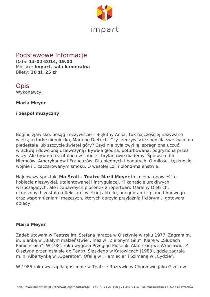 Podstawowe Informacje Data: 13-02-2014, 19.00 Miejsce: Impart, sala kameralna Bilety: 30 zł, 25 zł Opis Wykonawcy: Maria Meyer i zespół muzyczny Bogini, zjawisko, posąg i oczywiście – Błękitny Anioł. Tak najczęściej nazywano wielką aktorkę niemiecką, Marlenę Dietrich. Czy rzeczywiście spędziła swe życie na piedestale lub szczycie świętej góry? Czyż nie była zwykłą, spragnioną uczuć, wrażliwą i dowcipną dziewczyną? Bywała głodna, poturbowana, pogryziona przez wszy. Ale bywała też otulona w sobole i brylantowe diademy. Śpiewała dla Niemców, Amerykanów i Francuzów. Dla biednych i bogatych. O miłości, tęsknocie, wojnie i… zaczarowanym smoku. O wesołej Loli i blond-maleństwie. Najnowszy spektakl Ma Scali – Teatru Marii Meyer to kolejna opowieść o kobiecie niezwykłej, utalentowanej i intrygującej. Kilkanaście urokliwych, wzruszających, ale i zabawnych piosenek z repertuaru Marleny Dietrich, okraszonych zostało refleksjami wielkiej aktorki, anegdotami z planu filmowego oraz wspomnieniami mężczyzn, których darzyła przyjaźnią i którym… gotowała obiady. Maria Meyer Zadebiutowała w Teatrze im. Stefana Jaracza w Olsztynie w roku 1977. Zagrała m. in. Biankę w „Białym małżeństwie”, Inez w „Zielonym Gilu”, Klarę w „Ślubach Panieńskich”. W 1981 roku wygrała Przegląd Piosenki Aktorskiej we Wrocławiu. Z Olsztyna przeniosła się do Teatru Śląskiego w Katowicach (1983), gdzie zagrała m.in. Albertynkę w „Operetce”, Ofelię w „Hamlecie” i Szimenę w „Cydzie”. W 1985 roku wystąpiła gościnnie w Teatrze Rozrywki w Chorzowie jako Gizela w http://www.impart.art.pl | [email protected] | +48 71 71 27 100 | 71 341 94 32 | ul. Mazowiecka 17, 50-412 Wrocław „Huśtawce” (Seesaw) Cy Colemana. Od 1988 roku związana jest etatowo ze sceną chorzowską. Gra tutaj bardzo dużo, niemal we wszystkich przedstawieniach. Do najbardziej znaczących ról należą: Anna w „Dwa razy tak” (I do, I do), Polly w „Operze za trzy grosze” (Der Dreigroschen Opera), Helena w „Firmie”, Sally Bowles w „Cabarecie” (Cabaret), Diablica w autorskim spektaklu Józefa Szajny „Ślady”, Turandot w komedii Gozziego „Księżniczka Turandot” (Turandot), Hudel w „Skrzypku na dachu” (Fiddler on the Roof), Evita w musicalu Webbera - Rice'a (Evita), którego prapremiera polska odbyła się w 1994 roku, Siostra Mary Amnezja w widowisku muzycznym „Nunsense” Goggina, AldonzaDulcinea w „Człowieku z La Manchy” (Man of La Mancha), Magenta w kultowym musicalu „The Rocky Horror Show” (prapremiera polska), Maria Magdalena w rockoperze „Jesus Christ Superstar”, Maria Anioł w muzycznej tragifarsie Michaela Tremblay'a „Szwagierki”, Mańka w musicalu Wojciecha Młynarskiego i Włodzimierza Korcza „Dyzma - musical” (prapremiera) oraz tytułowa w monodramie „Ja, Josephine” (prapremiera). Za rolę Evity otrzymała Specjalną Złotą Maskę, przypieczętowaną znakomitymi recenzjami. Po gościnnych prezentacjach „Evity” w warszawskim Teatrze Dramatycznym, okrzyknięto ją najlepszą aktorką musicalową. Jacek Sieradzki w tygodniku „Polityka” stwierdził, że stworzyła kreację życiową. Natomiast w Spisie subiektywnym aktorów polskich, również w „Polityce”, napisał, że to znakomicie śpiewająca aktorka. Lucjan Kydryński uważa, że wielkim plusem chorzowskiej „Evity” jest świetna Maria Meyer w roli tytułowej. Znakomita wokalnie i aktorsko, jest gwiazdą, dla której warto przedstawienie obejrzeć. Tomasz Konina w czasopiśmie „Teatr” potwierdza opinię J.Sieradzkiego, stwierdzając, że Meyer znakomicie śpiewa i konsekwentnie prowadzi rolę. Na tym jednak nie koniec sukcesów. Jaką trzeba być rasową aktorzycą, aby z granej od roku Evity wskoczyć w Aldonzę-Dulcyneę. A Maria Meyer zrobiła to świetnie... - napisała Marta Fox w miesięczniku „Śląsk” tuż po premierze musicalu „Człowiek z La Manchy” M. Leigha, D. Wassermana i J. Dariona. Jerzy Piekarczyk w „Przekroju” uznał, że prawda chorzowskiego „Człowieka z La Manchy” nie przemawia tam, gdzie jest widowisko, ale tam gdzie jest teatr, gdzie mamy do czynienia z kreacją...Marii Meyer jako Aldonzy. Niewątpliwa zasługa w tym reżysera, Józefa Opalskiego, który w znakomitej Marii Meyer dostrzegł możliwość łagodnego przejścia od ostrej jak brzytwa Aldonzy do cichego zdziwienia Dulcynei - napisał Paweł Głowacki w miesięczniku „Teatr”. Zaś recenzent „Kuriera Lubelskiego” określił Aldonzę mianem: rewelacyjna. Bo to gwiazda, która świeci własnym, mocnym, oryginalnym światłem. Inne teatry mogą jej pozazdrościć dyrektorowi Teatru Rozrywki, Dariuszowi Miłkowskiemu. Oprócz wspomnianej Specjalnej Złotej Maski, Maria Meyer jest m.in. laureatką http://www.impart.art.pl | [email protected] | +48 71 71 27 100 | 71 341 94 32 | ul. Mazowiecka 17, 50-412 Wrocław nagrody ZASP im. Leny Starke; nagrody Wojewody Katowickiego dla Młodych Twórców za wszechstronność sztuki aktorskiej, a także nagrody Prezydenta miasta Chorzowa w dziedzinie kultury (2000 r.) W 1996 roku została pierwszą laureatką Plebiscytu Publiczności na najpopularniejszą aktorkę, organizowanego przez „Gazetę Wyborczą - Gazetę w Katowicach” i Wojewodę Katowickiego. Miesięcznik „Pani” zaś wyróżnił ją jako jedną z 100 kobiet w Polsce, które w roku 2001 szczególnie zaznaczyły się w życiu publicznym. Maria Meyer jest też laureatką statuetki „Narcyza” - nagrody przyznanej przez Izbę Przemysłowo-Handlową Rybnickiego Okręgu Przemysłowego za wybitne osiągnięcia zawodowe (kwiecień 2004). Zaproszona przez Jana Pietrzaka do stałej współpracy wiele lat występowała z Kabaretem „Pod Egidą”. Z tym zespołem brała udział w tournée po Szwajcarii, Niemczech i Włoszech, a także w USA i Kanadzie. W czerwcu 2000 roku gościła na scenie Polskiego Ośrodka Kultury w Lo
