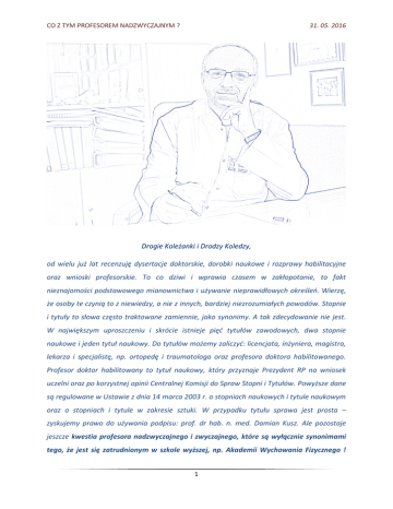 CO Z TYM PROFESOREM NADZWYCZAJNYM ? 31. 05. 2016 Drogie Koleżanki i Drodzy Koledzy, od wielu już lat recenzuję dysertacje doktorskie, dorobki naukowe i rozprawy habilitacyjne oraz wnioski profesorskie. To co dziwi i wprawia czasem w zakłopotanie, to fakt nieznajomości podstawowego mianownictwa i używanie nieprawidłowych określeń. Wierzę, że osoby te czynią to z niewiedzy, a nie z innych, bardziej niezrozumiałych powodów. Stopnie i tytuły to słowa często traktowane zamiennie, jako synonimy. A tak zdecydowanie nie jest. W największym uproszczeniu i skrócie istnieje pięć tytułów zawodowych, dwa stopnie naukowe i jeden tytuł naukowy. Do tytułów możemy zaliczyć: licencjata, inżyniera, magistra, lekarza i specjalistę, np. ortopedę i traumatologa oraz profesora doktora habilitowanego. Profesor doktor habilitowany to tytuł naukowy, który przyznaje Prezydent RP na wniosek uczelni oraz po korzystnej opinii Centralnej Komisji do Spraw Stopni i Tytułów. Powyższe dane są regulowane w Ustawie z dnia 14 marca 2003 r. o stopniach naukowych i tytule naukowym oraz o stopniach i tytule w zakresie sztuki. W przypadku tytułu sprawa jest prosta – zyskujemy prawo do używania podpisu: prof. dr hab. n. med. Damian Kusz. Ale pozostaje jeszcze kwestia profesora nadzwyczajnego i zwyczajnego, które są wyłącznie synonimami tego, że jest się zatrudnionym w szkole wyższej, np. Akademii Wychowania Fizycznego ! 1 CO Z TYM PROFESOREM NADZWYCZAJNYM ? 31. 05. 2016 Profesor nadzwyczajny (z łac. professor extraordinarius) – to stanowisko na uczelni przewidziane dla pracownika naukowego lub naukowo - dydaktycznego, posiadającego stopień doktora habilitowanego lub tytuł profesora. Ustawodawca dopuszcza także zatrudnienie na stanowisku profesora nadzwyczajnego osoby, które mają jedynie stopień doktora oraz znaczne i twórcze osiągnięcia w pracy naukowej, jednak tylko na podstawie umowy o pracę. Stanowisko profesora nadzwyczajnego jest niższe rangą od stanowiska profesora zwyczajnego. Na uczelniach morskich na stanowisku profesora nadzwyczajnego można zatrudnić doktora, który dodatkowo ma najwyższy dyplom morski, tj. kapitana żeglugi wielkiej bądź starszego mechanika. Dla odróżnienia osoby mającej tytuł naukowy profesora od osoby zatrudnionej na stanowisku o tej nazwie, stanowisko profesora nadzwyczajnego powinno się pisać po nazwisku, razem z akronimem uczelni, przez którą jest zatrudniony, np.: dr hab. n. med. Jan Nowak, prof. UJ – zapis zgodny z polską normą, czyli poprawny. dr hab. Jan Nowak, prof. nadzw. UJ – zapis dopuszczalny. Ostatnio coraz częściej spotyka się jednak błędną pisownię przed nazwiskiem, zarezerwowaną dla tytułu naukowego, np.: prof. UJ dr hab. Wacław Kowalski – zapis często spotykany, niepoprawny. dr hab., prof. UJ Wacław Kowalski – zapis niepoprawny. Są też przykłady skrajne, gdy ktoś pisze sobie tylko: Ta profesor nadzwyczajny Nikodem Skoczylas, co odznacza „profesor zatrudniony” . ostatnia forma jest niedopuszczalna, ponieważ wprowadza w błąd osobę niewtajemniczoną, że ma do czynienia z profesorem geniuszem, osobą ponadprzeciętną i niezwykłą. A przede wszystkim z posiadaczem tytułu profesora. Ma to wydźwięk wyjątkowo pejoratywny, zwłaszcza w medycynie, ponieważ taki może być odbiór przez pacjenta. Mam nadzieję, że w tych przypadkach mamy do czynienia z nieświadomością, a nie działaniem celowym. Odmienną zupełnie kwestią jest pytanie, czy tzw. „habilitacje” utrzymywać, czy też przejść na „system amerykański” ? Zaliczam się do grona opowiadających się za drugim rozwiązaniem, widząc obecnie wstydliwą łatwość zdobywania i spadek prestiżu statusu „pracownika samodzielnego nauki”. Ale to już temat na zupełnie inny komentarz. Kiedyś ! Z pozdrowieniami Damian Kusz 2