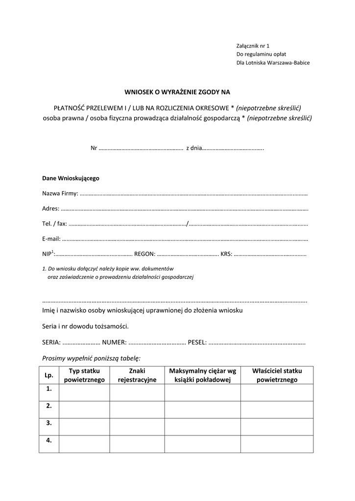 Załącznik nr 1 Do regulaminu opłat Dla Lotniska Warszawa-Babice WNIOSEK O WYRAŻENIE ZGODY NA PŁATNOŚĆ PRZELEWEM I / LUB NA ROZLICZENIA OKRESOWE * (niepotrzebne skreślić) osoba prawna / osoba fizyczna prowadząca działalność gospodarczą * (niepotrzebne skreślić) Nr ……………………………………………….. z dnia………………………………….. Dane Wnioskującego Nazwa Firmy: …………………………………………………………………………………………………………………………….……… Adres: ………………………………………………………………………………………………………………………………………….……. Tel. / fax: ……………………………………………………………………/……………………………………………………………….…… E-mail: …………………………………………………………………………………………………………………………………………….… NIP1:………………………………..…………. REGON: ……………………….…………. KRS: …………………………….……..…… 1. Do wniosku dołączyć należy kopie ww. dokumentów oraz zaświadczenie o prowadzeniu działalności gospodarczej …………………………………………………………………………………………………………………………………………….. Imię i nazwisko osoby wnioskującej uprawnionej do złożenia wniosku Seria i nr dowodu tożsamości. SERIA: ..………………… NUMER: ..…………………………… PESEL: ………………………………………………….. Prosimy wypełnić poniższą tabelę: Lp. 1. 2. 3. 4. Typ statku powietrznego Znaki rejestracyjne Maksymalny ciężar wg książki pokładowej Właściciel statku powietrznego Poniżej prosimy zaznaczyć właściwe pole poprzez postawienie znaku X (w kwadracie). 1. Proszę o udzielenie zgody na płatność przelewem za usługi świadczone przez Zarządzającego Lotniskiem Warszawa-Babice – Centrum Usług Logistycznych „Lotnisko Warszawa-Babice” na rzecz Wnioskującego na podstawie otrzymanej faktury. 2. Proszę o udzielenie zgody na rozliczenie miesięczne za usługi świadczone przez Zarządzającego Lotniskiem Warszawa-Babice. Zobowiązuję się do: a) Uiszczania płatności za usługi lotniskowe w terminie do 14 dni od daty wystawienia faktury obejmującej wykonanie usługi świadczonej przez Zarządzającego Lotniskiem Warszawa-Babice na rzecz Wnioskującego wg obowiązujących stawek za usługi ujęte w regulaminie opłat dla Lotniska Warszawa-Babice, b) Terminowego regulowania należności, c) Uaktualniania danych (zmiany nazwy operatora, zmiany numerów telefonów, sprzedaży statku powietrznego, aktualnego wykazu floty powietrznej). Wnioskujący oświadcza, że jest płatnikiem podatku od towarów i usług, uprawnionym do otrzymania faktury VAT faktur korygujących oraz, że upoważnia Zarządzającego do wystawiania faktur bez swojego podpisu. W przypadku płatności na rachunek zarządzającego Lotniskiem Warszawa-Babice, za dzień zapłaty uznaje się datę wpływu środków na rachunek Zarządzającego. Zarządzający Lotniskiem Warszawa-Babice wystawi fakturę VAT w terminie 7 dni po dokonaniu usługi lub upływie wnioskowanego okresu. Opłaty za usługi lotniskowe prosimy dokonywać na niżej podane konto wg. aktualnego cennika: ZARZĄDZAJĄCY LOTNISKIEM: Centrum Usług Logistycznych „Lotnisko Warszawa-Babice” ul. Słoneczna 37 00-789 Warszawa NIP: 701 – 027 – 09 – 11 UWAGA! Nowy numer konta bankowego (od 1/03/2015): Bank BGK 64 1130 1017 0020 1465 3920 0004 Adres do korespondencji: CUL – „Lotnisko Warszawa-Babice” ul. gen bryg S. Kaliskiego 57 01-476 Warszawa Uwaga zmiana numer telefonu: tel. +48 261 855 481 fax: +48 261 855 363 Wypełnia Wnioskujący*: Wnioskowany okres, na który została zawarta powyższa umowa obowiązuje od dnia ……………………………………………………… do dnia…………………………………… * ( po upływie wnioskowanego terminu należy ponownie złożyć wniosek) Wniosek sporządzono w dwóch jednobrzmiących egzemplarzach, po jednym dla każdej ze Stron. Wypełnia Zarządzający Lotniskiem Warszawa-Babice: Należy zaznaczyć właściwe pole poprzez postawienie znaku X (w kwadracie). Wyrażam zgodę ………………………………………………………………. Podpis osoby upoważnionej przez Zarządzającego Lotniskiem Warszawa-Babice Nie wyrażam zgody ……………………………………………………………….. Podpis wnioskującego