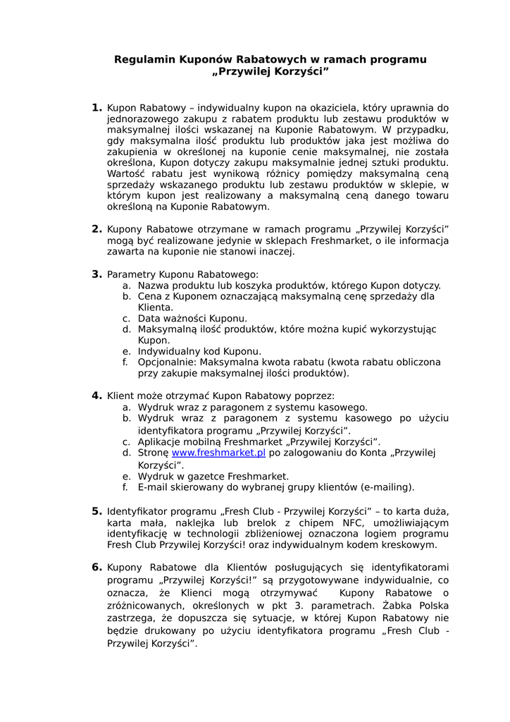 Regulamin Kuponów Rabatowych w ramach programu „Przywilej Korzyści” 1. Kupon Rabatowy – indywidualny kupon na okaziciela, który uprawnia do jednorazowego zakupu z rabatem produktu lub zestawu produktów w maksymalnej ilości wskazanej na Kuponie Rabatowym. W przypadku, gdy maksymalna ilość produktu lub produktów jaka jest możliwa do zakupienia w określonej na kuponie cenie maksymalnej, nie została określona, Kupon dotyczy zakupu maksymalnie jednej sztuki produktu. Wartość rabatu jest wynikową różnicy pomiędzy maksymalną ceną sprzedaży wskazanego produktu lub zestawu produktów w sklepie, w którym kupon jest realizowany a maksymalną ceną danego towaru określoną na Kuponie Rabatowym. 2. Kupony Rabatowe otrzymane w ramach programu „Przywilej Korzyści” mogą być realizowane jedynie w sklepach Freshmarket, o ile informacja zawarta na kuponie nie stanowi inaczej. 3. Parametry Kuponu Rabatowego: a. Nazwa produktu lub koszyka produktów, którego Kupon dotyczy. b. Cena z Kuponem oznaczającą maksymalną cenę sprzedaży dla Klienta. c. Data ważności Kuponu. d. Maksymalną ilość produktów, które można kupić wykorzystując Kupon. e. Indywidualny kod Kuponu. f. Opcjonalnie: Maksymalna kwota rabatu (kwota rabatu obliczona przy zakupie maksymalnej ilości produktów). 4. Klient może otrzymać Kupon Rabatowy poprzez: a. Wydruk wraz z paragonem z systemu kasowego. b. Wydruk wraz z paragonem z systemu kasowego po użyciu identyfikatora programu „Przywilej Korzyści”. c. Aplikacje mobilną Freshmarket „Przywilej Korzyści”. d. Stronę www.freshmarket.pl po zalogowaniu do Konta „Przywilej Korzyści”. e. Wydruk w gazetce Freshmarket. f. E-mail skierowany do wybranej grupy klientów (e-mailing). 5. Identyfikator programu „Fresh Club - Przywilej Korzyści” – to karta duża, karta mała, naklejka lub brelok z chipem NFC, umożliwiającym identyfikację w technologii zbliżeniowej oznaczona logiem programu Fresh Club Przywilej Korzyści! oraz indywidualnym kodem kreskowym. 6. Kupony Rabatowe dla Klientów posługujących się identyfikatorami programu „Przywilej Korzyści!” są przygotowywane indywidualnie, co oznacza, że Klienci mogą otrzymywać Kupony Rabatowe o zróżnicowanych, określonych w pkt 3. parametrach. Żabka Polska zastrzega, że dopuszcza się sytuacje, w której Kupon Rabatowy nie będzie drukowany po użyciu identyfikatora programu „Fresh Club Przywilej Korzyści”. 7. Kupony Rabatowe po użyciu Identyfikatora Fresh Club Przywilej Korzyści! przyznawane są wyłącznie w związku z dokonaniem zakupu towarów lub usług w sieci sklepów Freshmarket. 8. Kupon Rabatowy jest jednorazowy – po jednokrotnym wykorzystaniu nie może zostać wykorzystany ponownie, niezależnie od ilości produktów, na które został wykorzystany (zakup mniejszej ilości produktów niż maksymalna ilość wskazana na kuponie). 9. Kupon Rabatowy w formie drukowanej po realizacji zostaje zatrzymany przez Kasjera sklepu Freshmarket. 10. Kupon Rabatowy nie będzie mógł być zrealizowany w momencie braku łączności z serwerami obsługującymi program. Kupon może zostać zrealizowany po przywróceniu łączności lub w innym sklepie Freshmarket posiadającym łączność z serwerem obsługującym program. 11. Kupon Rabatowy nie podlega wymianie na gotówkę lub ekwiwalent rzeczowy. 12. W przypadku utraty, zniszczenia lub uszkodzenia Kuponu Rabatowego po jego wydaniu, duplikaty nie będą wydawane, a posiadaczowi Kuponu Rabatowego nie przysługują z tego tytułu jakiekolwiek roszczenia. 13. W przypadku gdy maksymalna cena z Kuponem jest wyższa od ceny w sklepie, w którym Kupon został okazany do realizacji np. w wyniku innej promocji, kupon nie zostanie zrealizowany. 14. Wsparcie programu realizowane jest pod numerem +48 800 207 208 w godzinach 8-16 w dni robocze. Koszty połączenia wg. taryfy operatora. 15. Reklamacje co do przebiegu realizacji Kuponów Rabatowych mogą być zgłaszane pisemnie na adres Żabka Polska, ul. Ogrodowa 12, 61821 Poznań lub na adres poczty elektronicznej [email protected]. Pisemna reklamacja powinna być wysłana z dopiskiem „Reklamacja” oraz zawierać: imię, nazwisko, dokładny adres reklamującego jak również dokładny opis, wskazanie przyczyny reklamacji. Reklamacje rozpatrywane będą w terminie 14 dni od dnia doręczenia. Składający reklamację zostanie powiadomiony o jej rozpatrzeniu listem poleconym na adres podany w reklamacji lub drogą mailową. 16. Podanie danych osobowych oraz wyrażenie zgody na ich przetwarzanie w związku z prowadzeniem postępowania reklamacyjnego jest dobrowolne. Uczestnik akceptuje jednak, że podanie danych osobowych i wyrażenie zgody na ich przetwarzanie jest niezbędne do prawidłowego przeprowadzenia postępowania reklamacyjnego przez Żabka Polska sp. z o.o.