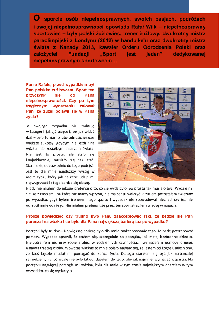 O sporcie osób niepełnosprawnych, swoich pasjach, podróżach i swojej niepełnosprawności opowiada Rafał Wilk – niepełnosprawny sportowiec – były polski żużlowiec, trener żużlowy, dwukrotny mistrz paraolimpijski z Londynu (2012) w handbike'u oraz dwukrotny mistrz świata z Kanady 2013, kawaler Orderu Odrodzenia Polski oraz założyciel Fundacji „Sport jest jeden” dedykowanej niepełnosprawnym sportowcom… Panie Rafale, przed wypadkiem był Pan polskim żużlowcem. Sport ten przyczynił się do Pana niepełnosprawności. Czy po tym tragicznym wydarzeniu żałował Pan, że żużel pojawił się w Pana życiu? Ja swojego wypadku nie traktuję w kategorii jakiejś tragedii, bo jak widać dziś – było to ziarno, aby odnosić jeszcze większe sukcesy: gdybym nie jeździł na wózku, nie zostałbym mistrzem świata. Nie jest to proste, ale stało się i najwidoczniej musiało się tak stać. Staram się odpowiednio do tego podejść. Jest to dla mnie najdłuższy wyścig w moim życiu, który jak na razie udaje mi się wygrywać i z tego bardzo się cieszę. Nigdy nie miałem do nikogo pretensji o to, co się wydarzyło, po prostu tak musiało być. Wydaje mi się, że z rzeczami, na które nie mamy wpływu, nie ma sensu walczyć. Z żużlem pozostałem związany po wypadku, gdyż byłem trenerem tego sportu i wypadek nie spowodował niechęci czy też nie odrzucił mnie od niego. Nie miałem pretensji, że przez ten sport straciłem władzę w nogach. Proszę powiedzieć czy trudno było Panu zaakceptować fakt, że będzie się Pan poruszał na wózku i co było dla Pana największą barierą tuż po wypadku? Początki były trudne… Największą barierą było dla mnie zaakceptowanie tego, że będę potrzebował pomocy. Wypadek sprawił, że czułem się, szczególnie na początku, jak małe, bezbronne dziecko. Nie potrafiłem nic przy sobie zrobić, w codziennych czynnościach wymagałem pomocy drugiej, a nawet trzeciej osoby. Wówczas właśnie to mnie bolało najbardziej, że jestem od kogoś uzależniony, że ktoś będzie musiał mi pomagać do końca życia. Dlatego starałem się być jak najbardziej samodzielny i choć wcale nie było łatwo, dążyłem do tego, aby jak najmniej wymagać wsparcia. Na początku najwięcej pomogła mi rodzina, była dla mnie w tym czasie największym oparciem w tym wszystkim, co się wydarzyło. Jednak wypadek nie spowodował Pana rezygnacji ze sportowych ambicji. Proszę powiedzieć, czy łatwo po wypadku było Panu powrócić do sportu i co zmotywowało Pana do podjęcia tej decyzji? Sport zabrał mi zdrowie, ale też dał mi jakąś nadzieję na przyszłość. Już pół roku po wypadku jeździłem na nartach. Powoli zacząłem wyznaczać sobie nowe, kolejne cele. Nie chciałem, aby to, że jeżdżę na wózku, spowodowało, że będę siedział bezczynnie. Narciarstwo było moją pasją i częścią życia już wcześniej, przed wypadkiem i bardzo chciałem to kontynuować. Gdy po wypadku pojechałem na narty, wzbudziło to ogromne zdziwienie wśród lekarzy oraz spowodowało niezbyt pozytywne opinie, bo przecież mam złamany kręgosłup. Ale uważam, że skoro moja głowa tego wymagała i potrzebowała spróbować czegoś, co się wcześniej robiło i zmierzyć się z rzeczywistością, to czemu nie dać sobie szansy. Narty okazały się idealnym sposobem na powrót do aktywności i okazało się, że pomimo, iż mam sparaliżowane nogi, to mogę swoją pasję kontynuować. Później przyszedł czas na rower, gdyż na rowerze też wcześniej startowałem w maratonach w kolarstwie górskim i byłem mistrzem polski amatorów. Bardzo ważne było dla mnie to, że robię po wypadku, to samo co robiłem wcześniej, choć może w trochę innej formie, bo na rowerze ręcznym – dla mnie jednak nadal był to po prostu rower. Te rzeczy uświadamiały mi, iż nie ma ograniczeń, mimo że jeżdżę na wózku. Jak Pan wspomniał, będąc już na wózku pełnił Pan funkcję trenera klubu KMŻ Lublin, jak jest dzisiaj? Czy żużel nadal jest Pana pasją? Tak, pełniłem funkcję trenera przez 4 lata. Obecnie jestem kibicem żużla, gdyż brak czasu nie pozwala mi po prostu na szersze działania. Mam teraz swoje starty, zawody, zgrupowania, czasami śledzę w Internecie co się dzieje, jakie są mecze ligowe, chociaż na meczach nie bywam, gdyż nie mam na to czasu. Trzeba umieć jakoś to swoje życie przewartościować, więc żużel nie jest dla mnie na pierwszym miejscu, lecz gdzieś dalej. Dziś wygrywa Pan najważniejsze międzynarodowe zawody oraz jest jednym z liderów polskiej kadry. Proszę powiedzieć, czy trudno było Panu osiągnąć ten sukces? Swoje sukcesy odniosłem w bardzo krótkim czasie, ale zawdzięczam to temu, że ze sportem związany byłem przed wypadkiem. Myślę, że to co wtedy wypracowałem, dużo szybciej teraz wróciło w postaci zdecydowanie lepszej formy. Na rowerze jeżdżę od 2010 roku. Gdy pojechałam na pierwsze zawody do Zamościa i zobaczyłem, jaka przepaść dzieli mnie od najlepszych, zrozumiałem jak dużo jeszcze pracy przede mną. Wyznaczyłem sobie więc poprzeczkę: skoro na tych zawodach straciłem tyle, to na następnych muszę dać z siebie więcej. Postawiłem sobie za cel: nie stracę 10 minut, tylko mniej. I tak powoli udawało mi się do następnego sezonu osiągać coraz to lepsze wyniki. Pomogła mi też determinacja, która jest bardzo ważna w sporcie, bo jeżeli robi się coś na pół gwizdka, lepiej tego nie robić. Rozpocząłem również współpracę z moim obecnym trenerem, co uważam za bardzo istotne w sporcie – ważne, aby prowadził nas ktoś, kto ma o tym pojęcie, a nie byśmy trenowali na „hurra” na podstawie tego, co przeczytaliśmy w książce. Moim trenerem jest Jakub Pieniążek i razem doszliśmy do tych rezultatów w naprawdę szybkim czasie, on zna moją formę i szczyt moich możliwości. Obecnie trenuję cały tydzień. Jest to systematyczna, ci