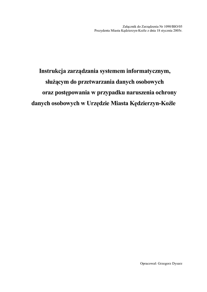 Załącznik do Zarządzenia Nr 1090/BIO/05 Prezydenta Miasta Kędzierzyn-Koźle z dnia 18 stycznia 2005r. Instrukcja zarządzania systemem informatycznym, służącym do przetwarzania danych osobowych oraz postępowania w przypadku naruszenia ochrony danych osobowych w Urzędzie Miasta Kędzierzyn-Koźle Opracował: Grzegorz Dysarz Ilekroć w instrukcji mowa jest o Administratorze Danych należy przez to rozumieć Prezydenta Miasta Kędzierzyn-Koźle. Ilekroć w instrukcji mowa jest o Administratorze Bezpieczeństwa Informacji należy przez to rozumieć Kierownika Biura Informatyki i Ochrony Informacji Urzędu Miasta odpowiedzialnego za bezpieczeństwo danych osobowych w systemie informatycznym, w tym w szczególności za przeciwdziałanie dostępowi osób niepowołanych do systemu, w którym przetwarzane są dane osobowe, oraz za podejmowanie odpowiednich działań w przypadku wykrycia naruszeń w systemie zabezpieczeń. Ilekroć w instrukcji mowa jest Administratorze systemu (odcinka systemu, aplikacji) należy przez to rozumieć pracowników Biura Informatyki i Ochrony Informacji administrujących serwerami i systemami w których przetwarzane są dane osobowe Ilekroć w instrukcji mowa jest Kierownikach komórek organizacyjnych należy przez to rozumieć kierowników wydziałów, biur , referatów oraz pracowników samodzielnych Urzędu Miasta Kędzierzyn-Koźle Ilekroć w instrukcji jest mowa o: danych osobowych - rozumie się przez to wszelkie informacje dotyczące zidentyfikowanej lub możliwej do zidentyfikowania osoby fizycznej. zbiorze danych - rozumie się przez to każdy posiadający strukturę zestaw danych o charakterze osobowym, dostępnych według określonych kryteriów, niezależnie od tego, czy zestaw ten jest rozproszony lub podzielony funkcjonalnie, przetwarzaniu danych - rozumie się przez to jakiekolwiek operacje wykonywane na danych osobowych, takie jak zbieranie, utrwalanie, przechowywanie, opracowywanie, zmienianie, udostępnianie i usuwanie, a zwłaszcza te, które wykonuje się w systemach informatycznych, usuwaniu danych - rozumie się przez to zniszczenie danych osobowych lub taką ich modyfikację, która nie pozwoli na ustalenie tożsamości osoby, której dane dotyczą, zgodzie osoby - której dane dotyczą - rozumie się przez to oświadczenie woli, którego treścią jest zgoda na przetwarzanie danych osobowych tego, kto składa oświadczenie; zgoda nie może być domniemana lub dorozumiana z oświadczenia woli o innej treści. bezpieczeństwie systemu informatycznego - należy przez to rozumieć wdrożone środki fizyczne, techniczne i administracyjne służące zabezpieczeniu zasobów- technicznych oraz ochronie przed modyfikacją, zniszczeniem, nieuprawnionym dostępem i ujawnieniem lub pozyskaniem danych osobowych, a także ich utratą, naruszeniu systemu bezpieczeństwa -jest to zarówno odstępstwo od obowiązujących procedur postępowania, zawartych we wspomnianych wyżej dokumentach, jak i bezprawne, fizyczne naruszenia zasobów i bez względu na skutek jaki te zdarzenia spowodowały. osobach nieupoważnionych do korzystania z danych zawartych w zbiorze - są to wszystkie osoby fizyczne, prawne i jednostki nie posiadające osobowości prawnej, które bez upoważnienia administratora danych miały potencjalną możliwość lub faktycznie uzyskały w jakiejkolwiek formie dostęp do danych. Instrukcja określa zasady: 1. zarządzania systemem informatycznym służącym do przetwarzania danych osobowych zgodnie ze strategią określoną w „Polityce bezpieczeństwa systemu informatycznego" wprowadzoną w życie Zarządzeniem Nr 1030/BIO/04 Prezydenta Miasta KędzierzynKoźle z dnia 15 grudnia 2004r. 2. Postępowania w przypadku naruszenia ochrony danych osobowych Dokument stanowi specyfikację podstawowych środków technicznych ochrony danych oraz elementów zarządzania systemem informatycznym. W przypadku wystąpienia potrzeb wprowadzenia nowych lub modyfikacji istniejących uregulowań proceduralnych danego obszaru, wnioski o ich opracowanie powinni składać kierownicy komórek w których procedury są używane do administratora bezpieczeństwa informacji. Zasady zawarte w niniejszym dokumencie oraz określone w odrębnych dokumentach powinny być udostępniane pracownikom na poszczególnych stanowiskach tylko w niezbędnym zakresie. Za wdrożenie procedur w komórkach organizacyjnych odpowiedzialni są ich kierownicy,. Obowiązki wynikające z dokumentów dotyczących zarządzania systemem informatycznym oraz zasady ochrony danych osobowych należy określać w indywidualnych zakresach czynności pracowników -odpowiednio do zadań wykonywanych na zajmowanym stanowisku. 1. System informatyczny i jego zasoby System informatyczny stanowią środki przetwarzania informacji wraz ze związanymi z nim ludźmi oraz zasobami technicznymi i finansowymi, czyli urządzeniami komputerowymi i niekomputerowymi do przetwarzania danych osobowych i informacji z nimi związanych. Przetwarzanie informacji, w tym danych osobowych obejmuje operacje polegające na ich zbieraniu, utrwalaniu, zmianie, przechowywaniu, opracowywaniu, udostępnianiu i usuwaniu 1.1 Nazwa zbiorów danych osobowych, w których dane osobowe są przetwarzane: „Wykaz dzierżawców i użytkowników wieczystych, Świadczenia osobiste, Ochotnicze drużyny ratownicze, Formacje obrony cywilnej, Działalność gospodarcza, Zezwolenia na trzymanie psów ras uznanych za agresywne, Dane Wydziału Ochrony Środowiska i Infrastruktury, Zezwolenia na zajęcie pasa drogowego, Wnioski o ukaranie przez kolegium ds. wykroczeń oraz postępowanie mandatowe w sprawach o wykroczenia, Ewidencja ludności i dowody osobiste, Urząd Stanu Cywilnego, Spis danych radnych rady miasta, Spis danych przewodniczących organów wykonawczych jednostek pomocniczych, Rejestr płatników opłaty za wieczyste użytkowanie i czynszu za dzierżawy gruntu, Zbiór podatników i płatników oraz uczestników postępowania w zakre