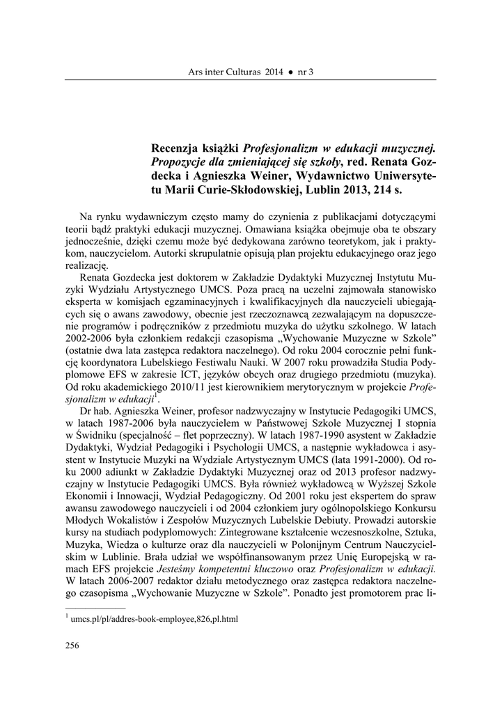 Ars inter Culturas 2014 ● nr 3 Recenzja książki Profesjonalizm w edukacji muzycznej. Propozycje dla zmieniającej się szkoły, red. Renata Gozdecka i Agnieszka Weiner, Wydawnictwo Uniwersytetu Marii Curie-Skłodowskiej, Lublin 2013, 214 s. Na rynku wydawniczym często mamy do czynienia z publikacjami dotyczącymi teorii bądź praktyki edukacji muzycznej. Omawiana książka obejmuje oba te obszary jednocześnie, dzięki czemu może być dedykowana zarówno teoretykom, jak i praktykom, nauczycielom. Autorki skrupulatnie opisują plan projektu edukacyjnego oraz jego realizację. Renata Gozdecka jest doktorem w Zakładzie Dydaktyki Muzycznej Instytutu Muzyki Wydziału Artystycznego UMCS. Poza pracą na uczelni zajmowała stanowisko eksperta w komisjach egzaminacyjnych i kwalifikacyjnych dla nauczycieli ubiegających się o awans zawodowy, obecnie jest rzeczoznawcą zezwalającym na dopuszczenie programów i podręczników z przedmiotu muzyka do użytku szkolnego. W latach 2002-2006 była członkiem redakcji czasopisma „Wychowanie Muzyczne w Szkole” (ostatnie dwa lata zastępca redaktora naczelnego). Od roku 2004 corocznie pełni funkcję koordynatora Lubelskiego Festiwalu Nauki. W 2007 roku prowadziła Studia Podyplomowe EFS w zakresie ICT, języków obcych oraz drugiego przedmiotu (muzyka). Od roku akademickiego 2010/11 jest kierownikiem merytorycznym w projekcie Profesjonalizm w edukacji1. Dr hab. Agnieszka Weiner, profesor nadzwyczajny w Instytucie Pedagogiki UMCS, w latach 1987-2006 była nauczycielem w Państwowej Szkole Muzycznej I stopnia w Świdniku (specjalność – flet poprzeczny). W latach 1987-1990 asystent w Zakładzie Dydaktyki, Wydział Pedagogiki i Psychologii UMCS, a następnie wykładowca i asystent w Instytucie Muzyki na Wydziale Artystycznym UMCS (lata 1991-2000). Od roku 2000 adiunkt w Zakładzie Dydaktyki Muzycznej oraz od 2013 profesor nadzwyczajny w Instytucie Pedagogiki UMCS. Była również wykładowcą w Wyższej Szkole Ekonomii i Innowacji, Wydział Pedagogiczny. Od 2001 roku jest ekspertem do spraw awansu zawodowego nauczycieli i od 2004 członkiem jury ogólnopolskiego Konkursu Młodych Wokalistów i Zespołów Muzycznych Lubelskie Debiuty. Prowadzi autorskie kursy na studiach podyplomowych: Zintegrowane kształcenie wczesnoszkolne, Sztuka, Muzyka, Wiedza o kulturze oraz dla nauczycieli w Polonijnym Centrum Nauczycielskim w Lublinie. Brała udział we współfinansowanym przez Unię Europejską w ramach EFS projekcie Jesteśmy kompetentni kluczowo oraz Profesjonalizm w edukacji. W latach 2006-2007 redaktor działu metodycznego oraz zastępca redaktora naczelnego czasopisma „Wychowanie Muzyczne w Szkole”. Ponadto jest promotorem prac li—————— 1 umcs.pl/pl/addres-book-employee,826,pl.html 256 cencjackich, magisterskich, doktorskich, opiekunem praktyk studenckich oraz Koła Naukowego Młodych Pedagogów. Od 2005 roku członek Polskiego Towarzystwa E.E. Gordona, a także, od 2007, członek Polskiego Towarzystwa Diagnostyki Edukacyjnej2. Książka zawiera dwanaście tekstów, które wewnętrznie dzielą zawartość na dwie części. Pierwszy artykuł Innowacyjne działania w nauczaniu muzyki Renaty Gozdeckiej opisuje trudy, z jakimi boryka się każdy nauczyciel, m.in. potrzebą stałego rozwoju i doskonalenia swoich umiejętności oraz wypaleniem zawodowym. Dlatego też poszukiwanie nowatorskich metod kształcenia może przeciwdziałać owej rutynie. Ważkość nowatorskich rozwiązań metodycznych podkreślają również Christina Maslach3, Hanna Przybyły4, Helena Sęk5. Istotne jest także, aby wykształcić nauczyciela świadomego konieczności ciągłego rozwoju w procesie nowatorskiego planowania metodycznego oraz jego znaczenie w fachowej praktyce zawodowej. Pisząc o odpowiednim planowaniu metodycznym, autorka wymienia m.in. Krzysztofa Kruszewskiego, Czesława Kupisiewicza, Wincentego Okonia czy też Bolesława Niemierko, i szczegółowo opisuje planowanie działań dydaktycznych według każdego z wyżej wymienionych dydaktyków. Dalej R. Gozdecka podaje metody aktywizujące, podkreśla ich walory oraz wskazuje konkretne nawiązania do lekcji muzyki z zastosowaniem tychże metod. Możemy tu również przeczytać o typach lekcji (od czego zależy dany typ lekcji). Autorka nawiązuje również do podstawy programowej z 2008 roku, w której opisano formy realizacji treści nauczania. Dzięki temu adekwatnie do formy możemy zaplanować konkretny typ scenariusza lekcji. Następny tekst, Praktyki ogólnopedagogiczne elementem profesjonalizmu zawodowego Agnieszki Weiner, przedstawia charakterystykę rozwoju zawodowego nauczyciela od pierwszego kroku w szkole. Autorka trafnie zauważa, iż pierwsze kroki nauczyciela to zderzenie z brakami w swoich umiejętnościach6. Jest to etap doskonalenia i rozwoju kompetencji. O tym problemie mówi także Irena Dzierzgowska7, Douglas Barnes8, Robert V. Bullough9. Weiner następnie skupia się na etapie wdrażania projektu innowacyjnych praktyk ogólnopedagogicznych, odwołując się do podstawy prawnej (Rozporządzenie Ministra Edukacji Narodowej i Sportu z dnia 7 września 2004 roku w sprawie standardów kształcenia) i zawartych w niej szczegółów. Następnie przedstawia szczegółową realizację praktyk przez studentów czwartego semestru 3-letnich stacjonarnych studiów licencjackich. Część pierwszą zamyka tekst Od scjentyzmu w stronę humanistyki – metoda projektów w kształceniu studentów edukacji muzycznej Agnieszki Weiner. We wstępie podkreślono —————— 2 hektor.umcs.lublin.pl/~agnieszkaweiner/ Ch. Maslach, Wypalanie się: utrata troski człowieka, [w:] G. Zimbardo, F.L. Ruch, Psychologia i życie, Warszawa 1994, s. 37. 4 H. Przybyła, Psychologiczne koszty zespołu wypalenia zawodowego wśród nauczycieli a kierunki pomocy psychologicznej, [w:] Zdrowie psychiczne w zawodzie nauczycielskim, red. T. Rongińska, W. Gaida, U. Schaarschmidt, Zielona Góra-Potsdam 1998, s