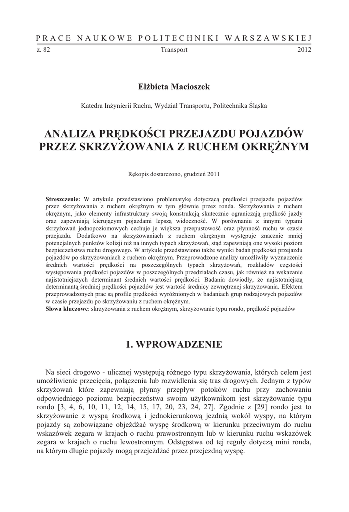 PRACE NAUKOWE POLITECHNIKI WARSZAWSKIEJ z. 82 Transport 2012 Elbieta Macioszek Katedra Inynierii Ruchu, Wydzia Transportu, Politechnika lska ANALIZA PRDKOCI PRZEJAZDU POJAZDÓW PRZEZ SKRZY OWANIA Z RUCHEM OKR NYM Rkopis dostarczono, grudzie 2011 Streszczenie: W artykule przedstawiono problematyk dotyczc prdkoci przejazdu pojazdów przez skrzyowania z ruchem okrnym w tym gównie przez ronda. Skrzyowania z ruchem okrnym, jako elementy infrastruktury swoj konstrukcj skutecznie ograniczaj prdko jazdy oraz zapewniaj kierujcym pojazdami lepsz widoczno. W porównaniu z innymi typami skrzyowa jednopoziomowych cechuje je wiksza przepustowo oraz pynno ruchu w czasie przejazdu. Dodatkowo na skrzyowaniach z ruchem okrnym wystpuje znacznie mniej potencjalnych punktów kolizji ni na innych typach skrzyowa, std zapewniaj one wysoki poziom bezpieczestwa ruchu drogowego. W artykule przedstawiono take wyniki bada prdkoci przejazdu pojazdów po skrzyowaniach z ruchem okrnym. Przeprowadzone analizy umoliwiy wyznaczenie rednich wartoci prdkoci na poszczególnych typach skrzyowa, rozkadów czstoci wystpowania prdkoci pojazdów w poszczególnych przedziaach czasu, jak równie na wskazanie najistotniejszych determinant rednich wartoci prdkoci. Badania dowiody, e najistotniejsz determinant redniej prdkoci pojazdów jest warto rednicy zewntrznej skrzyowania. Efektem przeprowadzonych prac s profile prdkoci wyrónionych w badaniach grup rodzajowych pojazdów w czasie przejazdu po skrzyowaniu z ruchem okrnym. Sowa kluczowe: skrzyowania z ruchem okrnym, skrzyowanie typu rondo, prdko pojazdów 1. WPROWADZENIE Na sieci drogowo - ulicznej wystpuj rónego typu skrzyowania, których celem jest umoliwienie przecicia, poczenia lub rozwidlenia si tras drogowych. Jednym z typów skrzyowa które zapewniaj pynny przepyw potoków ruchu przy zachowaniu odpowiedniego poziomu bezpieczestwa swoim uytkownikom jest skrzyowanie typu rondo [3, 4, 6, 10, 11, 12, 14, 15, 17, 20, 23, 24, 27]. Zgodnie z [29] rondo jest to skrzyowanie z wysp rodkow i jednokierunkow jezdni wokó wyspy, na którym pojazdy s zobowizane objeda wysp rodkow w kierunku przeciwnym do ruchu wskazówek zegara w krajach o ruchu prawostronnym lub w kierunku ruchu wskazówek zegara w krajach o ruchu lewostronnym. Odstpstwa od tej reguy dotycz mini ronda, na którym dugie pojazdy mog przejeda przez przejezdn wysp. 70 Elbieta Macioszek Poprawa bezpieczestwa ruchu drogowego na skrzyowaniach z ruchem okrnym, w tym na rondach, wynika gównie z ograniczenia prdkoci jazdy spowodowanego specyficznymi parametrami geometrycznymi skrzyowania (m.in. takimi jak krzywoliniowe tory jazdy pojazdów przy wjedzie i zjedzie ze skrzyowania). W artykule przedstawiono wyniki bada prdkoci przejazdu pojazdów po skrzyowaniach typu rondo. Prdko przejazdu po skrzyowaniach typu rondo zaley od wielu czynników, std kadorazowo naley j traktowa jako zmienn losow. Potencjalne czynniki mogce determinowa wartoci prdkoci pojazdów podczas przejazdu po rondach przedstawiono na rys. 1. Czynniki mogce wpywa na prdko przejazdu po skrzyowaniach typu rondo geometryczne - rednica zewntrzna ronda, - szeroko wlotu, - szeroko jezdni ronda, - pochylenie wlotu, - pochylenie jezdni ronda, - kt pomidzy wlotem a wylotem ronda, - liczba wlotów, - odlego widocznoci na wlocie, - odlego widocznoci na jezdni ronda. ruchowe - natenie ruchu na wlotach/wylotach i jezdni ronda, - obecno/brak przej dla pieszych, - natenie ruchu pieszych na przejciach dla pieszych, - obecno torów tramwajowych, - natenie ruchu tramwajów, - prdko dopuszczalna na wlotach ronda, - struktura rodzajowa ruchu, - struktura kierunkowa ruchu. inne - warunki atmosferyczne, - pora dnia, - miesic, - cechy psychofizyczne uczestników ruchu drogowego, - wiek kierowców, - pe kierowców, - wysoko rolinnoci wyspy rodkowej, - sposób zagospodarowania wyspy rodkowej ronda, - dowiadczenie kierowców. Rys. 1. Wybrane czynniki mogce wpywa na prdko przejazdu pojazdów po rondach Obserwacje ruchu pojazdów na rondach pozwalaj wnioskowa, e czynnikami geometrycznymi mogcymi wpywa na wzrost prdkoci przejazdu s rednica zewntrzna ronda, szerokoci wlotów i szeroko jezdni ronda. Im te parametry przyjmuj wiksze wartoci tym prdkoci pojazdów s wysze. Z kolei wzrost pochylenia poprzecznego jezdni ronda powoduje spadek prdkoci pojazdów. Najwysze wartoci prdkoci przejazdu mona zaobserwowa dla relacji na wprost w sytuacji, gdy kt Analiza prdkoci przejazdu pojazdów przez skrzyowania z ruchem okrnym 71 pomidzy wlotem a wylotem jezdni jest zbliony do 180°. Mniejsze prdkoci pojazdy osigaj na rondach o wikszej liczbie wlotów i niewielkiej rednicy zewntrznej. Bardzo due znaczenie ma take odlego widocznoci na wlocie. Ten czynnik warunkuje gównie prdko pojazdów dojedajcych do obwiedni ronda. Na widoczno na obwiedniach rond wpywa gównie wysoko rolinnoci na wyspie rodkowej oraz sposób jej zagospodarowania. Kolejn grup czynników determinujc prdko pojazdów na rondach s parametry ruchowe. Spadek prdkoci pojazdów (zarówno na wlocie, obwiedni i wylocie ronda) obserwuje si w okresach zwikszonych dopywów potoków ruchu do wlotów ronda. Wystpowanie przej dla pieszych i natenie ruchu pieszego to czynniki warunkujce prdko gównie na wlocie i wylocie ronda. Torowiska tramwajowe przebiegajce prostopadle do kierunku ruchu pojazdów take oddziauj na prdko pojazdów. Jeeli rondo zlokalizowane jest w obszarze o charakterze handlowo – usugowym (np. przy centrach handlowych) gdzie prdko dopuszczalna jest niska to naley spodziewa si ogólnie niskiej prdkoci pojazdów. Inne czynniki maj równie znaczenie dla osiganych prdkoci. Najwysze prdkoci obserwuje si dla pojazdów o dobrych waciwociach trakcyjnych (samochody osobowe, motocykle). Prdko jest równie uzaleniona od cech psychofizycznych uczestników ruchu drogowego, warunków atmosferycznych, a w szczególnoci od wystpowania opadów atmosferycznych, które midzy innymi zmniejszaj przyczepno kó pojazdów do nawierzchni. 2. BADANIA PRDKOCI N