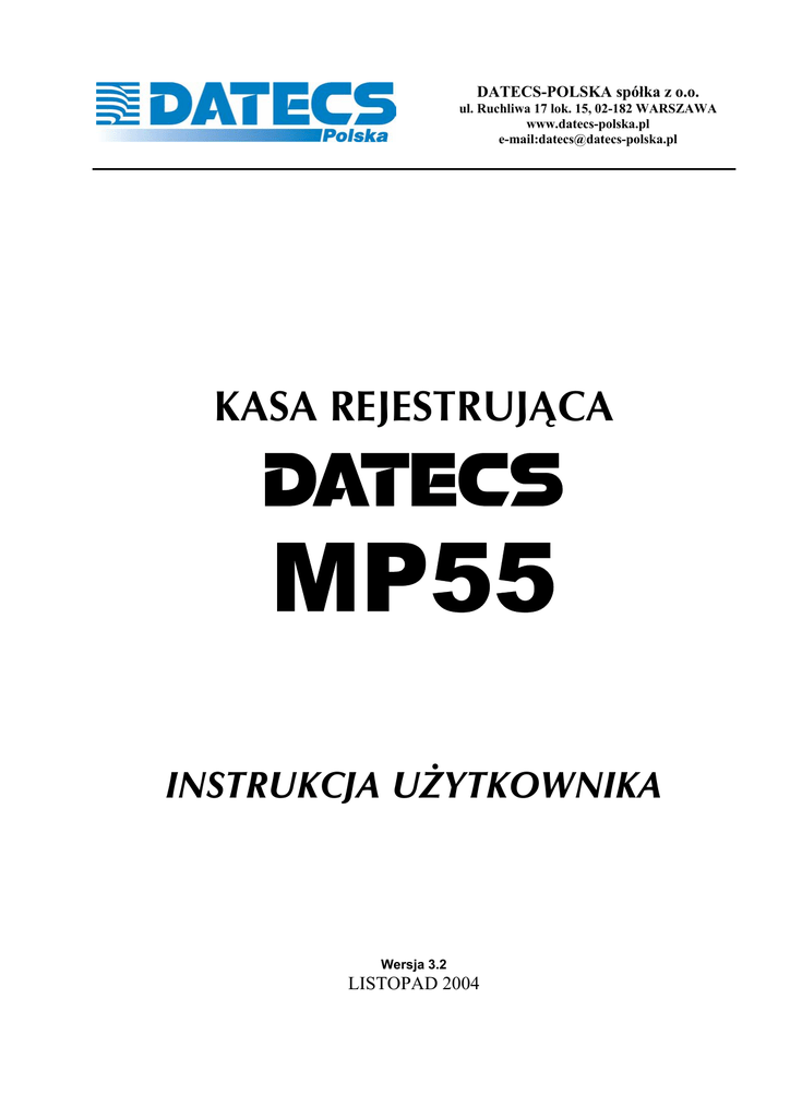 DATECS-POLSKA spółka z o.o. ul. Ruchliwa 17 lok. 15, 02-182 WARSZAWA www.datecs-polska.pl e-mail:[email protected] KASA REJESTRUJĄCA DATECS MP55 INSTRUKCJA UŻYTKOWNIKA Wersja 3.2 LISTOPAD 2004 DATECS MP55 Instrukcja użytkownika SPIS TREŚCI WPROWADZENIE ..........................................................................................................................................................3 KILKA BARDZO CENNYCH UWAG ..........................................................................................................................4 PRZYGOTOWANIE KASY DO PRACY......................................................................................................................5 ROZPAKOWANIE KASY ................................................................................................................................5 WYGLĄD ZEWNĘTRZNY ..............................................................................................................................5 WŁĄCZANIE I WYŁACZANIE KASY..............................................................................................................5 JAKOŚĆ I ZAKŁADANIE TAŚMY PAPIEROWEJ..........................................................................................6 WYŚWIETLACZE KASY.................................................................................................................................7 INFORMACJE O BŁĘDACH...........................................................................................................................8 KLAWIATURA KASY ......................................................................................................................................8 ZASILANIE KASY .........................................................................................................................................10 ZASILANIE SIECIOWE..............................................................................................................................................10 ZASILANIE AKUMULATOROWE ...........................................................................................................................10 PRZEŁĄCZANIE KASY W POSZCZEGÓLNE TRYBY .........................................................................................12 PROGRAMOWANIE KASY ........................................................................................................................................13 UWAGI OGÓLNE .........................................................................................................................................13 PROGRAMOWANIE WARTOŚCI STAWEK PODATKOWYCH ..................................................................13 PROGRAMOWANIE NAZW .........................................................................................................................14 PROGRAMOWANIE KASY PRZY UŻYCIU INTERFEJSU STANDARDOWEJ KLAWIATURY PC............14 PROGRAMOWANIE ARTYKUŁÓW PLU.....................................................................................................16 PROGRAMOWANIE NAZWY ARTYKUŁU PLU....................................................................................................16 PROGRAMOWANIE STAWKI VAT DLA ARTYKUŁU PLU.................................................................................17 PROGRAMOWANIE TYPU ARTYKUŁU PLU ........................................................................................................17 PROGRAMOWANIE CENY ARTYKUŁU PLU........................................................................................................17 USUWANIE ARTYKUŁÓW PLU Z BAZY TOWAROWEJ.....................................................................................17 PROGRAMOWANIE OGÓLNYCH FUNKCJI KASY ....................................................................................18 PROCEDURA PROGRAMOWANIA OGÓLNYCH FUNKCJI KASY.....................................................................18 PROGRAMOWANIE NAZW I HASEŁ KASJERÓW................................................................................................19 PROGRAMOWANIE KLAWISZY RABATU I MARŻY ..........................................................................................19 PROGRAMOWANIE CZASU.....................................................................................................................................19 PROGRAMOWANIE NAGŁÓWKA PARAGONU ...................................................................................................19 PROGRAMOWANIE KODÓW WAGOWYCH .........................................................................................................20 ODCZYT ZAPROGRAMOWANYCH W KASIE DANYCH............................................................................21 OPERACJE REJESTRACJI SPRZEDAŻY................................................................................................................22 OPERACJE OGÓLNE ..................................................................................................................................22 LOGOWANIE KASJERA............................................................................................................................................22 WYLOGOWANIE KASJERA .....................................................................................................................................22 SPOSÓB REJESTRACJI SPRZEDAŻY.......................................................................................................22 SPRZEDAŻ Z UŻYCIEM KLAWISZY BEZPOŚREDNICH PLU...................................................................23 SPRZEDAŻ POPRZEZ PLU.........................................................................................................................23 SPRZEDAŻ PLU Z CENĄ WPROWADZANĄ RĘCZNIE ........................................................................................23 SPRZEDAŻ PL
