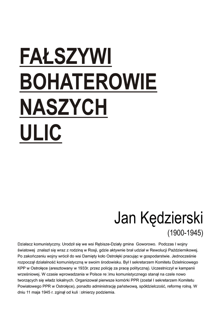 FAŁSZYWI BOHATEROWIE NASZYCH ULIC Jan Kędzierski (1900-1945) Działacz komunistyczny. Urodził się we wsi Rębisze-Działy gmina Goworowo. Podczas I wojny światowej znalazł się wraz z rodziną w Rosji, gdzie aktywnie brał udział w Rewolucji Październikowej. Po zakończeniu wojny wrócił do wsi Damięty koło Ostrołęki pracując w gospodarstwie. Jednocześnie rozpoczął działalność komunistyczną w swoim środowisku. Był I sekretarzem Komitetu Dzielnicowego KPP w Ostrołęce (aresztowany w 1933r. przez policję za pracę polityczną). Uczestniczył w kampanii wrześniowej. W czasie wprowadzania w Polsce reżimu komunistycznego stanął na czele nowo tworzących się władz lokalnych. Organizował pierwsze komórki PPR (został I sekretarzem Komitetu Powiatowego PPR w Ostrołęce), ponadto administrację państwową, spółdzielczość, reformę rolną. W dniu 11 maja 1945 r. zginął od kuli żołnierzy podziemia.