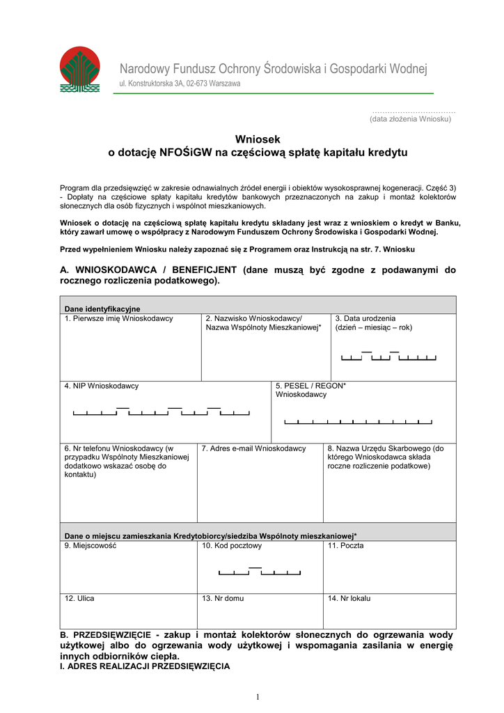 Narodowy Fundusz Ochrony Środowiska i Gospodarki Wodnej ul. Konstruktorska 3A, 02-673 Warszawa …………………………… (data złoŜenia Wniosku) Wniosek o dotację NFOŚiGW na częściową spłatę kapitału kredytu Program dla przedsięwzięć w zakresie odnawialnych źródeł energii i obiektów wysokosprawnej kogeneracji. Część 3) - Dopłaty na częściowe spłaty kapitału kredytów bankowych przeznaczonych na zakup i montaŜ kolektorów słonecznych dla osób fizycznych i wspólnot mieszkaniowych. Wniosek o dotację na częściową spłatę kapitału kredytu składany jest wraz z wnioskiem o kredyt w Banku, który zawarł umowę o współpracy z Narodowym Funduszem Ochrony Środowiska i Gospodarki Wodnej. Przed wypełnieniem Wniosku naleŜy zapoznać się z Programem oraz Instrukcją na str. 7. Wniosku A. WNIOSKODAWCA / BENEFICJENT (dane muszą być zgodne z podawanymi do rocznego rozliczenia podatkowego). Dane identyfikacyjne 1. Pierwsze imię Wnioskodawcy 2. Nazwisko Wnioskodawcy/ Nazwa Wspólnoty Mieszkaniowej* 5. PESEL / REGON* Wnioskodawcy 4. NIP Wnioskodawcy 6. Nr telefonu Wnioskodawcy (w przypadku Wspólnoty Mieszkaniowej dodatkowo wskazać osobę do kontaktu) 3. Data urodzenia (dzień – miesiąc – rok) 7. Adres e-mail Wnioskodawcy 8. Nazwa Urzędu Skarbowego (do którego Wnioskodawca składa roczne rozliczenie podatkowe) Dane o miejscu zamieszkania Kredytobiorcy/siedziba Wspólnoty mieszkaniowej* 9. Miejscowość 10. Kod pocztowy 11. Poczta 12. Ulica 13. Nr domu 14. Nr lokalu B. PRZEDSIĘWZIĘCIE - zakup i montaŜ kolektorów słonecznych do ogrzewania wody uŜytkowej albo do ogrzewania wody uŜytkowej i wspomagania zasilania w energię innych odbiorników ciepła. I. ADRES REALIZACJI PRZEDSIĘWZIĘCIA 1 A. Czy adres realizacji przedsięwzięcia jest toŜsamy z adresem zamieszkania wskazanym w pkt. 9 - 14 TAK* / NIE* B. JeŜeli skreślono TAK, to naleŜy wypełnić punkty 15 – 20 15. Miejscowość 16. Kod pocztowy 17. Ulica 18. Nr domu 19. Nr lokalu 20. Nr działki (wpisać w przypadku budynku mieszkalnego w budowie, gdzie brak ulicy, nr domu) II. POZOSTAŁE DANE 21. Powierzchnia całkowita budynku mieszkalnego, dla którego zostaną zainstalowane kolektory 2 słoneczne (w m ) 22. Czy w budynku mieszkalnym, którego dotyczy przedsięwzięcie jest / będzie (dotyczy budynku mieszkalnego w budowie) prowadzona działalność gospodarcza lub najem. 23. Powierzchnia budynku mieszkalnego wykorzystywana/ planowana do wykorzystania do działalności gospodarczej 2 lub pod wynajem (w m ) TAK* / NIE* 2 24. Udział powierzchni wykorzystywanej/ planowanej do wykorzystania do działalności gospodarczej lub pod wynajem w powierzchni całkowitej budynku mieszkalnego (23/21) w % 25. Powierzchnia apertury kolektorów słonecznych (w m ) 26. Rodzaj zastępowanego / uzupełniającego* nośnika energii - energia elektryczna / gaz ziemny / gaz płynny/węgiel kamienny / węgiel brunatny /olej opałowy / biomasa* 27. Tytuł prawny do budynku mieszkalnego / budynku mieszkalnego w budowie* III. KOSZTY PRZEDSIĘWZIĘCIA 28. Planowane koszty kwalifikowane przedsięwzięcia ogółem (zgodnie z kosztorysem zawartym w ofercie/ projekcie/projekcie budowlanowykonawczym*) w zł: 29. Planowane koszty kwalifikowane przedsięwzięcia w zł: (uwzględniające pomniejszenia wynikające z prowadzenia działalności gospodarczej oraz ograniczenia jednostkowym kosztem kwalifikowanym). 31. Wnioskowana kwota kredytu na finansowanie: a. kosztów kwalifikowanych w zł: b. kosztów kwalifikowanych objętych dotacją w zł: 30. Jednostkowy koszt kwalifikowany 2 1 m kolektora słonecznego w zł. (nie moŜe być wyŜszy niŜ 2.250 zł/m2) 32.Kwota wnioskowanej dotacji NFOŚiGW na częściową spłatę kapitału kredytu (45% x poz. 31b.) w zł. IV.HARMONOGRAM RZECZOWO-FINANSOWY PRZEDSIĘWZIĘCIA Ogółem Wyszczególnienie w zł: 2 Kwota kredytu w zł: Planowany termin wypłaty 1 33. Planowane koszty kwalifikowane przedsięwzięcia (zgodnie z kosztorysem zawartym w ofercie/projekcie/projekcie budowlano-wykonawczym*), w tym: 33.1. - Koszt projektu instalacji kolektorów słonecznych do ogrzewania wody uŜytkowej / do ogrzewania wody uŜytkowej i wspomagania zasilania w energię innych odbiorników ciepła* 2 Pkt 28 3 kredytu 4 Pkt 31a - Koszt projektu budowlano - wykonawczego rozwiązania technologicznego dotyczącego montaŜu instalacji do ogrzewania wody uŜytkowej / do ogrzewania wody uŜytkowej i wspomagania zasilania w energię innych odbiorników ciepła.* 33.2. Koszt nabycia nowych instalacji kolektorów słonecznych, w tym: 1/ 33.2.1 Kolektor słoneczny szt. ……………… łączna powierzchnia całkowita kolektorów ………… m łączna powierzchnia apertury ………… m 1/ 33.2.2. Zasobnik o pojemności ……………dm 2 2 3 33.2.3. Przewody instalacyjne. 1/ 33.2.4. Aparatura kontrolno-pomiarowa i automatyka . 33.2.5. Inne materiały i urządzenia (wskazać jakie). 33.3. Koszt zakupu ciepłomierza spełniającego normy PN EN 1434. 33.4. Koszt montaŜu instalacji kolektora słonecznego. 1/ urządzenie powinno posiadać gwarancję producenta na okres nie krótszy niŜ 5 lat; Planowany termin rozpoczęcia przedsięwzięcia ………….. - …………. - ………………. r. Planowany termin osiągnięcia efektu ekologicznego toŜsamego z efektem rzeczowym rozumiany jako planowany termin zrealizowania całego przedsięwzięcia i jego uruchomienia, a w przypadku budynków mieszkalnych w budowie zamieszkanie w budynku. ………….. - …………. - ………………. r. Oświadczam, Ŝe(**): nie mam prawnej moŜliwości odzyskania lub odliczenia poniesionego ostatecznie kosztu podatku VAT. Jednocześnie zobowiązuję się, Ŝe nie będę w przyszłości wnioskować o refundację jakiejkolwiek części poniesionego w ramach przedsięwzięcia podatku VAT; będę mógł odzyskać lub odliczyć koszt podatku VAT poniesionego w związku z realizacją przedsięwzięcia objętego niniejsz