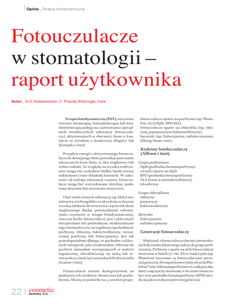 I Opinie _ Terapia fotodynamiczna Fotouczulacze w stomatologii – raport użytkownika Autor _ dr D. Koteeswaran, C. Pravda, Ekta Ingle, Indie _Terapia fotodynamiczna (PDT), nazywana również fototerapią, fotoradioterapią lub fotochemioterapią polega na zastosowaniu specjalnych światłoczułych substancji (fotouczulaczy), aktywowanych w obecności tlenu w kontakcie ze światłem o konkretnej długości fali (Konopka i inni). Przepływ energii z aktywowanego fotouczulacza do dostępnego tlenu powoduje powstanie toksycznych form tlenu, tj. tlen singletowy lub wolne rodniki. Ze względu na wysoką reaktywność mogą one uszkadzać białka, lipidy, kwasy nukleinowe i inne składniki komórek. W zależności od rodzaju substancji czynnej, fotouczulacze mogą być wstrzykiwane dożylnie, podawane doustnie lub stosowane miejscowo. Choć wiele różnych substancji, np. błękit metylenowy, róż bengalski czy akrydyna, wykazuje wysoką zdolność do tworzenia cząsteczek tlenu singletowego (będąc potencjalnymi substancjami czynnymi w terapii fotodynamicznej), znaczna liczba fotouczulaczy jest cyklicznymi tetrapirolami lub pochodnymi strukturalnymi tego chromoforu (w szczególności pochodnymi porfiryny, chloryny, bakteriochloryny, rozszerzonej porfiryny lub ftalocyjaniny). Jest tak prawdopodobnie dlatego, że pochodne cyklicznych tatrapiroli, jako strukturalnie zbliżone do porfiryn naturalnie występujących w materii organicznej, charakteryzują się niską lub zerową toksycznością w warunkach braku światła (Leanne i inni). Fotouczulacze można skategoryzować na podstawie ich struktury chemicznej lub pochodzenia. Można je podzielić na 3 szerokie grupy: 22 I cosmetic dentistry 3+4_ 2011 _fotouczulacze oparte na porfirynie (np. Photofrin, ALA/PplX, BPD-MA), _fotouczulacze oparte na chlorofilu (np. chloryny, puprpurynym bakteriochloryny), _barwniki (np. ftalocyjanina, naftalocyjanina), (Zheng Huan i inni), _Rodziny fotoluczulaczy (Allison i inni). Grupa porfirynowa _HpD (pochodna hematoporfiryny) _związki oparte na HpD _BPD (pochodna benzoporfiryny) _ALA (kwas 5-aminolewulinowy) _teksafiryny Grupa chlorofilowa _chloryny _purpuryny _bakteriochloryny Barwniki _ftalocyjanina _naftalocyjanynia _Generacje fotouczulaczy Większość z fotouczulaczy obecnie zatwierdzonych do użytku klinicznego należy do grupy porfirynowej. Porfiryny i oparte na nich fotouczulacze stworzone w latach 70. i 80. XX w. tradycyjnie (np. Photofrin) nazywane są fotouczulaczami pierwszej generacji. Dostępny komercyjnie od 30 lat Photofrin® (eter dihematoporfirynowy), najlepiej zbadany i najczęściej stosowany w leczeniu fotouczulacz oraz pochodne hematoporfiryny (HPD) określa się jako uczulacze pierwszej generacji. Opinie _ Terapia fotodynamiczna I zacja, choć wciąż stosowana nie jest uniwersalnie akceptowana i może prowadzić do nieporozumień. W wielu przypadkach twierdzenie, że nowe środki są lepsze od starych jest nieuzasadnione. Wyciąganie przedwczesnych wniosków dotyczących nowych lub eksperymentalnych fotouczulaczy może wysłać lekarzom i naukowcom błędny komunikat sugerujący, że starsze leki powinny być zastąpione nowszymi lub wywoływać u pacjentów przeświadczenie, że nowsze fotouczulacze są bardziej skuteczne. Obecnie w sprzedaży dostępne są 4 fotouczulacze: Photofrin, ALA, VisudyneTM (BPD, Verteporfin) i Foscan. Pierwsze 3 zostały zatwierdzone przez Amerykańską Agencję ds. Żywności i Leków (FDA), w Europie stosowane są wszystkie wymienione. _Wskazania dla stosowania fotouczulaczy Stosowanie fotouczulaczy zalecane jest w następujących przypadkach: Pochodne porifryny i związki tworzone od drugiej połowy lat 80. (np. ALA) nazywa się fotouczulaczami drugiej generacji. Obejmują one kwas 5-aminolewulinowy (ALA), pochodne benzofiryy (BPD), teksafirynę lutetu, temoporfinę (mTHPC), etiopurpuryny etylu cyny (SnET2) oraz talaporfinę sodu (LS11). Wyniki badań na zwierzętach wykazują, że Foscan® (mTHPC), najsilniejszy z fotouczulaczy drugiej generacji jest 100 razy bardziej czynny niż Photofrin®. Fotouczulacze z tej grupy mają większą zdolność tworzenia tlenu singletowego. Mogą jednak wywoływać znaczący ból podczas terapii, a ponadto ze względu na ich wysoką aktywność nawet słabe światło (np. 60-watowa żarówka) może wywołać istotną światłoczułość skóry (Dougherty i inni). Trzecia substancja czynna – ALA jest endogennym fotouczulaczem przekształcanym in situ w fotouczulacz protoporfiryna IX. Miejscowo stosowane ALA i jego estry wykorzystywane są w leczeniu stanów przedrakowych oraz raka podstawnokomórkowego i kolczystokomórkowego skóry. Do fotouczulaczy trzeciej generacji zalicza się modyfikacje, takie jak koniugaty biologiczne (np. koniugaty przeciwciał i liposomów) i ich naturalne właściwości zmniejszające poziom światła i wybielające. Fotouczulacze trzeciej generacji obejmują dostępne obecnie środki modyfikowane przy użyciu przeciwciał monoklonalnych. Należy zauważyć, że opisana kategory- _fotoradioterapia oparta na ALA – niezłośliwe wewnątrzustne zmiany chorobowe, _terapia pomocnicza w leczeniu chronicznej parodontozy i zapalenia tkanek okołoimplantowych, _dezynfekcja kanałów korzeniowych w leczeniu endodontycznym, _wczesne leczenie nowotworów głowy i szyi, _jako środek łagodzący w nowotworach głowy i szyi odpornych na leczenie, _międzyoperacyjna terapia pomocnicza w nawracających nowotworach głowy i szyi. Piśmiennictwo dostępne u wydawcy. Niniejszy artykuł pochodzi z międzynarodowego magazynu „Laser” Nr 4/2010. _kontakt cosmetic dentistry Dr D. Koteeswaran MDS, FICD (członek Mi´dzynarodowej Akademii Dentystów) Wydział Medycyny Jamy Ustnej i Radiologii Meenakshi Ammal Dental College Alapakkam Main Road Maduravoyal Channai 600095, Indie Tel.: +91 9840145918 Faks: +91 4423781631 [email protected] cosmetic dentistry 3+4 _ 2011 I 23