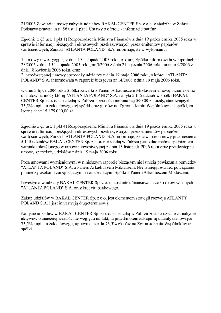 21/2006 Zawarcie umowy nabycia udziałów BAKAL CENTER Sp. z o.o. z siedzibą w Zabrzu Podstawa prawna: Art. 56 ust. 1 pkt 1 Ustawy o ofercie - informacje poufne Zgodnie z §5 ust. 1 pkt 1) Rozporządzenia Ministra Finansów z dnia 19 października 2005 roku w sprawie informacji bieżących i okresowych przekazywanych przez emitentów papierów wartościowych, Zarząd "ATLANTA POLAND" S.A. informuje, że w wykonaniu: 1. umowy inwestycyjnej z dnia 15 listopada 2005 roku, o której Spółka informowała w raportach nr 28/2005 z dnia 15 listopada 2005 roku, nr 5/2006 z dnia 21 stycznia 2006 roku, oraz nr 9/2006 z dnia 18 kwietnia 2006 roku, oraz 2. przedwstępnej umowy sprzedaży udziałów z dnia 19 maja 2006 roku, o której "ATLANTA POLAND" S.A. informowała w raporcie bieżącym nr 14/2006 z dnia 19 maja 2006 roku, w dniu 3 lipca 2006 roku Spółka zawarła z Panem Arkadiuszem Mikłaszem umowę przeniesienia udziałów na mocy której "ATLANTA POLAND" S.A. nabyła 5.145 udziałów spółki BAKAL CENTER Sp. z o. o. z siedzibą w Zabrzu o wartości nominalnej 500,00 zł każdy, stanowiących 73,5% kapitału zakładowego tej spółki oraz głosów na Zgromadzeniu Wspólników tej spółki, za łączną cenę 15.875.000,00 zł. Zgodnie z §5 ust. 1 pkt 4) Rozporządzenia Ministra Finansów z dnia 19 października 2005 roku w sprawie informacji bieżących i okresowych przekazywanych przez emitentów papierów wartościowych, Zarząd "ATLANTA POLAND" S.A. informuje, że zawarcie umowy przeniesienia 5.145 udziałów BAKAL CENTER Sp. z o. o. z siedzibą w Zabrzu jest jednocześnie spełnieniem warunku określonego w umowie inwestycyjnej z dnia 15 listopada 2006 roku oraz przedwstępnej umowy sprzedaży udziałów z dnia 19 maja 2006 roku. Poza umowami wymienionymi w niniejszym raporcie bieżącym nie istnieją powiązania pomiędzy "ATLANTA POLAND" S.A. a Panem Arkadiuszem Mikłaszem. Nie istnieją również powiązania pomiędzy osobami zarządzającymi i nadzorującymi Spółki a Panem Arkadiuszem Mikłaszem. Inwestycja w udziały BAKAL CENTER Sp. z o. o. zostanie sfinansowana ze środków własnych "ATLANTA POLAND" S.A. oraz kredytu bankowego. Zakup udziałów w BAKAL CENTER Sp. z o.o. jest elementem strategii rozwoju ATLANTY POLAND S.A. i jest inwestycją długoterminową. Nabycie udziałów w BAKAL CENTER Sp. z o. o. z siedzibą w Zabrzu zostało uznane za nabycie aktywów o znacznej wartości ze względu na fakt, iż przedmiotem zakupu są udziały stanowiące 73,5% kapitału zakładowego, uprawniające do 73,5% głosów na Zgromadzeniu Wspólników tej spółki.