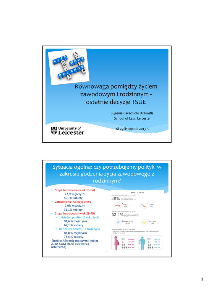 14/11/2013 Równowaga pomiędzy życiem zawodowym i rodzinnym ostatnie decyzje TSUE Eugenia Caracciolo di Torella School of Law, Leicester 28-29 listopada 2013 r. 1 Sytuacja ogólna: czy potrzebujemy polityk w zakresie godzenia życia zawodowego z rodzinnym? Stopa bezrobocia (wiek 15-64) 72,% mężczyźni 59,1% kobiety Zatrudnienie na część etatu 7,9% mężczyźni 31,1% kobiety Stopa bezrobocia (wiek 29-49) z dziećmi poniżej 12 roku życia 91,6 % mężczyźni 67,1 % kobiety bez dzieci poniżej 12 roku życia 84,8 % mężczyźni 78,5 % kobiety (źródło: Równość mężczyzn i kobiet 2010, COM 2009) 694 wersja ostateczna) 2 1 14/11/2013 Argument praw człowieka Artykuł 8 EKPC Artykuł 33 Karty Praw Podstawowych (OJ [2000] c364/1) (1) Rodzina korzysta z ochrony prawnej, ekonomicznej i społecznej; (2): „W celu pogodzenia życia rodzinnego z zawodowym, każdy ma prawo do ochrony przed zwolnieniem z pracy z powodów związanych z macierzyństwem i prawo do płatnego urlopu macierzyńskiego oraz do urlopu wychowawczego po urodzeniu lub przysposobieniu dziecka” Artykuł 24 Karty praw podstawowych: prawa dziecka 3 kwestie demograficzne problemy gospodarcze równość płci rzeczywista możliwość wyboru walka z ubóstwem 4 2 14/11/2013 „To nudne. Wolałabym, byśmy o tym nie musieli rozmawiać, ale musimy o tym rozmawiać, bo obecna sytuacja jest straszna” (baronowa Hale z Richmond, 2013) 5 Ramy prawne Dyrektywa w sprawie równego traktowania 76/207/EWG Dyrektywa w sprawie pracownic w ciąży 92/85 Dyrektywa w sprawie urlopu rodzicielskiego 96/34 oraz 2010/18 Dyrektywa w sprawie równego traktowania 2002/207/EWG Zmieniona dyrektywa 2006/54 (uchyla Dyrektywy 75/117; 76/207 & 2002/73; 86/378 & 96/97 & 97/80) Dyrektywa w sprawie pracowników zatrudnionych w niepełnym wymiarze godzin 97/81 Dyrektywa w sprawie pracowników zatrudnionych na czas określony 99/70 Pakiet z roku 2008 w sprawie równowagi pomiędzy życiem zawodowym i prywatnym (Komisja UE, COM(2008) 635 6 3 14/11/2013 Orzecznictwo: od czego wszystko się zaczęło Sprawa C-177/88 Dekker [1990] ECR I3941 Dyskryminacja ze względu na ciążę jest dyskryminacją bezpośrednią Sprawa C-21 Hertz v Aldi [1990] ECR I-3979 „jedynie kobietom można odmówić zatrudnienia ze względu na ciążę i taka odmowa stanowi dyskryminację ze względu na płeć. Odmowa zatrudnienia z powodu konsekwencji finansowych nieobecności spowodowanej ciążą musi być uznana za opierająca się zasadniczo na fakcie ciąży. Taka dyskryminacja nie może być uzasadniona względami dotyczącymi straty finansowej , którą pracodawca zatrudniający kobietę w ciąży poniósłby w okresie jej urlopu macierzyńskiego.” Sąd ustalił, że ochrona przed zwolnieniem z powodu ciąży i/lub kwestii związanych z ciążą jest rozszerzona (ograniczona?) do okresu ustawowego urlopu macierzyńskiego. 7 Choć zapewnia się dużo praw/ochronę, w dalszym ciągu występują braki. Ostatnie przypadki uwypuklają problemy dotyczące dwóch szczególnych obszarów: zaangażowania ojców regulacji macierzyństwa w kontekście wspomaganego rozrodu, w szczególności matek-surogatek 8 4 14/11/2013 Dlaczego prawo powinno uwzględniać ojców? równość płci/ strategia zatrudnienia wsparcie dla matek, które mogą odegrać istotniejszą rolę na rynku pracy obalanie stereotypów prawa dzieci/ korzyści prawa człowieka większa liczba ojców chce odgrywać znaczącą rolę prawo do odpłatnej pracy dla kobiet/ prawo do opieki dla mężczyzn Nowi odważni ojcowie? Przepisy: Urlop ojcowski Nowy artykuł 16 dyrektywy Państwa Członkowskie: bardzo minimalistyczne podejście, choć widoczne są powolne postępy Orzecznictwo: Sprawa 184/83, Hofmann C-218/98, Abdoulaye C-104/09, Roca Álvarez C-5/12, Betriu Montull Urlop rodzicielski Dyrektywa w sprawie urlopu rodzicielskiego 2010/18 Różnice we wdrożeniu Uwaga: urlop jest bezpłatny i często nieelastyczny Kto z niego korzysta? 10 5 14/11/2013 Rola ojców: gdzie dziś jesteśmy? „sytuacja pracownika i pracownicy, ojca i matki małego dziecka, jest porównywalna w odniesieniu do ich możliwych „Dyrektywa w sprawie potrzeb (...) w zakresie opieki nad równego traktowania nie dzieckiem” (Sprawa C-104/09, została pomyślana w celu Roca Alvarez [2010] ECR I-08661) rozstrzygania kwestii dotyczących organizacji życia rodzinnego lub zmiany podziału obowiązków pomiędzy rodzicami” (sprawa 84/83 Hofmann [1984] ECR 3047) 11 Sprawa C-104/09, Roca Alvarez [2010] ECR I08661 Estatuto de Trabajadores, 1900 „urlop na karmienie piersią” urlop jest na dziecko, ALE wykorzystane przepisy Artykuł 2(3) Równe Traktowanie 76/207 „mogą z niego skorzystać zarówno matka, jak i ojciec, zakładając, że oboje są zatrudnieni” 12 6 14/11/2013 Hiszpański plan zabezpieczenia społecznego: 6 tygodni obowiązkowego urlopu następującego bezpośrednio po porodzie 10 opcjonalnych tygodni do podziału między rodzicami C-5/12, Betriu Montull, 13 września 2013 Uwaga: Pan Betriu Montull: był objęty planem państwowym, ale jego żona nie! Pan Betriu Montull nie mógł wykorzystać dodatkowych tygodni, ponieważ ojcowie posiadają jedynie zależne, a nie niezależne prawo do urlopu (jednakże ojcowie adopcyjni posiadają takie niezależne prawo!) 13 AG Wathelet „Stwierdzając, że matka może na początku okresu urlopu macierzyńskiego zdecydować, że po upływie pierwszych 6 tygodni ojciec może korzystać z wyznaczonego i ciągłego 10-tygodniowego urlopu, hiszpański legislator odłączył te 10 tygodni od biologicznego stanu matki a, tym samym, od celu artykułu 2(3) Dyrektywy 76/207.” (par. 71) 14 7 14/11/2013 Orzeczenie Sądu „[...] Dyrektywa 92/85 nie stoi na przeszkodzie temu, aby posiadająca status pracownika najemnego matka mogła zadecydować, że posiadający również status pracownika najemnego ojciec może skorzystać z całości lub z części urlopu macierzyńskiego w okresie następującym po s