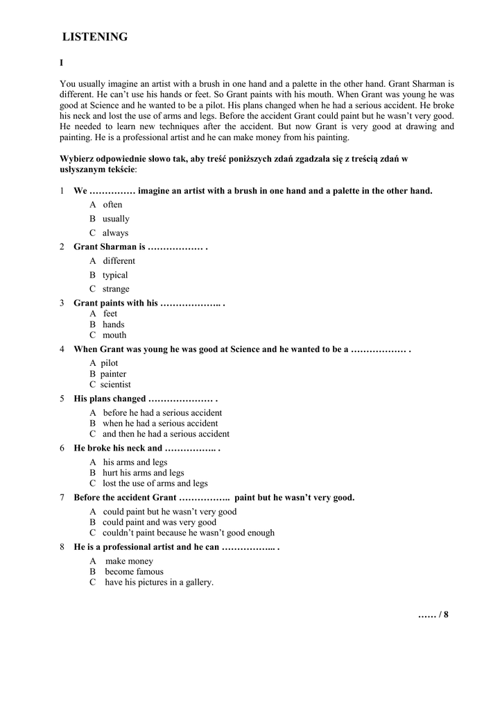 LISTENING I You usually imagine an artist with a brush in one hand and a palette in the other hand. Grant Sharman is different. He can’t use his hands or feet. So Grant paints with his mouth. When Grant was young he was good at Science and he wanted to be a pilot. His plans changed when he had a serious accident. He broke his neck and lost the use of arms and legs. Before the accident Grant could paint but he wasn’t very good. He needed to learn new techniques after the accident. But now Grant is very good at drawing and painting. He is a professional artist and he can make money from his painting. Wybierz odpowiednie słowo tak, aby treść poniższych zdań zgadzała się z treścią zdań w usłyszanym tekście: 1 We …………… imagine an artist with a brush in one hand and a palette in the other hand. A often B usually C always 2 Grant Sharman is ……………… . A different B typical C strange 3 Grant paints with his ……………….. . A feet B hands C mouth 4 When Grant was young he was good at Science and he wanted to be a ……………… . A pilot B painter C scientist 5 His plans changed ………………… . A before he had a serious accident B when he had a serious accident C and then he had a serious accident 6 He broke his neck and …………….. . A his arms and legs B hurt his arms and legs C lost the use of arms and legs 7 Before the accident Grant …………….. paint but he wasn’t very good. A could paint but he wasn’t very good B could paint and was very good C couldn’t paint because he wasn’t good enough 8 He is a professional artist and he can ……………... . A make money B become famous C have his pictures in a gallery. …… / 8 II Peter: We’re having a party on Tuesday. It’s Jenny’s birthday. Would you like to come? Joe: Sure. How do I get to your house? Peter: Well, go along Badwell Road, cross over Maypole Avenue, turn right after the hospital, go past the supermarket, at the first traffic lights turn left into Crownhill Street and the house we live in is on your left, opposite St Mary’s school, next to the Lloyd's bank. You can’t miss it. Joe: OK. See you on Tuesday. Zdecyduj czy podane zdania są prawdziwe (T) czy fałszywe (F): 1 2 Peter is inviting Joe to a birthday party. They are having the party on Thursday. T / F T / F 3 4 Peter and Jenny’s house is on Joe’s right. Their house is opposite St John’s school. T / F T / F 5 Their house is next to the bank. T / F 6 It is difficult to find the house. 7 Joe is going to the party. T / F T / F ….. / 7 READING I Jules Rimet was born in France in 1874. At school and university he was an excellent student. He liked sport but he never played football. He preferred athletics. After university he worked in business and for charities. Then, in 1914, he went to fight in the First World War. After his experiences in war, he became a pacifist and had the idea for an international football tournament. In 1921 he became president of the Federation of International Football Associations (FIFA), and three years later he invited different nations to participate in the first World Cup. Thirteen teams played in the first tournament in 1930. In 1946 FIFA named the trophy The Jules Rimet World Cup to commemorate his 25 years as president. Jules Rimet died at the age of 84 in 1956. Zdecyduj czy podane zdania są prawdziwe (T) czy fałszywe (F): 1 Jules Rimet was French T / F 2 He did very well at school. T / F 3 He preferred football to athletics. T / F 4 5 When he graduated, he started working in business. After university he helped poor people. T / F T / F 6 He became a pacifist but he went to fight in the First World War. T / F 7 He had the idea for an international football competition. T / F 8 9 In 1921 he invited different nations to participate in the first World Cup. In 1946 Jules Rimet was not president of the Federation T / F of International Football Associations (FIFA). T / F FIFA named the trophy The Jules Rimet World Cup after his death. T / F 10 ……. / 10 II Dopasuj nagłówki do akapitów: A Famous Associations B Facilities C History D Location 1 …… Worcester, England, is located in beautiful countryside in the valley of the River Seven. To the west are the Malven Hills, famous for the mineral waters and as the landscape in Tolkien’s Lord of the Rings. At the same time, Worcester is only an hour’s drive away from Birmingham, Britain second largest city. 2 …... Worcester is full of history. The present city was founded in 680 AD and before that was a Roman town in the same place. There are many beautiful old buildings in the city. 3 .….. The city is small with a population of 95,000, but it is famous for several things. Royal Worcester Porcelain and China began in the 18th century and continues today. Worcestershire sauce is a spicy sauce which English people put on food and especially in tomato juice. Worcester was also the home of one England’s greatest composers, Sir Edward Elgar. 4 …… Many people from the surrounding area go to Worcester. The Crowngate shopping centre and the High Street are for shoppers. The city also has impressive sporting facilities. River sports, such as rowing, are popular. There is a racecourse, a top cricket club and ground, and a famous rugby club.. Worcester also has a university with over 4000 students. ……. / 4 Wybierz odpowiednie słowo / wyrażenie tak, aby ich treść zgadzała się z treścią zdań w przeczytanym tekście: 5 Worcester is ….. from Birmingham. A a long way from B not far C very far 6 The present city was founded in …… . A the seventh century AD B the sixth century AD C between the 6th and the 7th century 7 There ………….. 95,000 people in Worcester. A lives B live C is 8 Worcestershire sauce is a …………. sauce A mild B cold C hot 9 10 Sir Edward Elgar was a …………….. . A poet B novelist C musician There are ………….. places to do sports in Worcester. A n