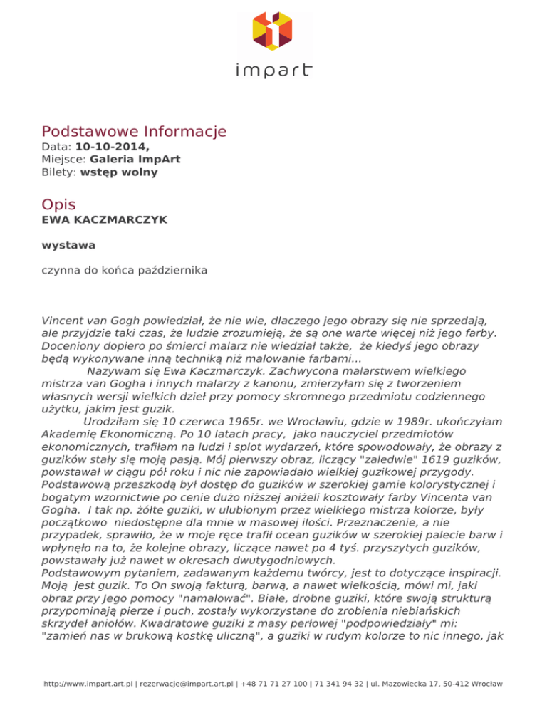 Podstawowe Informacje Data: 10-10-2014, Miejsce: Galeria ImpArt Bilety: wstęp wolny Opis EWA KACZMARCZYK wystawa czynna do końca października Vincent van Gogh powiedział, że nie wie, dlaczego jego obrazy się nie sprzedają, ale przyjdzie taki czas, że ludzie zrozumieją, że są one warte więcej niż jego farby. Doceniony dopiero po śmierci malarz nie wiedział także, że kiedyś jego obrazy będą wykonywane inną techniką niż malowanie farbami... Nazywam się Ewa Kaczmarczyk. Zachwycona malarstwem wielkiego mistrza van Gogha i innych malarzy z kanonu, zmierzyłam się z tworzeniem własnych wersji wielkich dzieł przy pomocy skromnego przedmiotu codziennego użytku, jakim jest guzik. Urodziłam się 10 czerwca 1965r. we Wrocławiu, gdzie w 1989r. ukończyłam Akademię Ekonomiczną. Po 10 latach pracy, jako nauczyciel przedmiotów ekonomicznych, trafiłam na ludzi i splot wydarzeń, które spowodowały, że obrazy z guzików stały się moją pasją. Mój pierwszy obraz, liczący "zaledwie" 1619 guzików, powstawał w ciągu pół roku i nic nie zapowiadało wielkiej guzikowej przygody. Podstawową przeszkodą był dostęp do guzików w szerokiej gamie kolorystycznej i bogatym wzornictwie po cenie dużo niższej aniżeli kosztowały farby Vincenta van Gogha. I tak np. żółte guziki, w ulubionym przez wielkiego mistrza kolorze, były początkowo niedostępne dla mnie w masowej ilości. Przeznaczenie, a nie przypadek, sprawiło, że w moje ręce trafił ocean guzików w szerokiej palecie barw i wpłynęło na to, że kolejne obrazy, liczące nawet po 4 tyś. przyszytych guzików, powstawały już nawet w okresach dwutygodniowych. Podstawowym pytaniem, zadawanym każdemu twórcy, jest to dotyczące inspiracji. Moją jest guzik. To On swoją fakturą, barwą, a nawet wielkością, mówi mi, jaki obraz przy Jego pomocy "namalować". Białe, drobne guziki, które swoją strukturą przypominają pierze i puch, zostały wykorzystane do zrobienia niebiańskich skrzydeł aniołów. Kwadratowe guziki z masy perłowej "podpowiedziały" mi: "zamień nas w brukową kostkę uliczną", a guziki w rudym kolorze to nic innego, jak http://www.impart.art.pl | [email protected] | +48 71 71 27 100 | 71 341 94 32 | ul. Mazowiecka 17, 50-412 Wrocław cegła wrocławskiego ratusza. W moich obrazach można napotkać "zamalowane" powierzchnie guzików matowych sąsiadujących z połyskującymi. Guziki przyszyte równo w kolumnach, znajdują miejsce obok miksu guzikowego, na który składają się guziki o różnym wzornictwie i wielkości, ale w podobnej tonacji. Moim pomysłem jest również warstwowe przyszywanie guzików jeden na drugim, w ten sposób powstają kwiaty najbardziej ulubiony motyw malarski. W moich pracach wykorzystuję guziki drewniane, plastikowe, rogowe, z masy perłowej, metalowe, szklane, guziki nowe, a także guziki z duszą, które noszą w sobie jakąś przeszłość i fascynującą historię. Oglądając obrazy z guzików oceniajmy nie tylko gotowe dzieło, ale wyszukujmy guziki, które same w sobie są godne indywidualnego podziwiania. 100 tyś. guzików przyszytych już łącznie na obrazach to dobry powód, aby podzielić się własną twórczością w formie niniejszej prezentacji. Zapraszam do oglądania i zadawania pytań w czasie spotkań podczas wernisaży i wystaw. Mam jeszcze dużo do opowiedzenia o guzikowej sztuce, a może tylko o nietypowym rzemiośle… Z ciepłymi pozdrowieniami Autorka [email protected] www.ewakaczmarczyk.deviantart.com http://www.impart.art.pl | [email protected] | +48 71 71 27 100 | 71 341 94 32 | ul. Mazowiecka 17, 50-412 Wrocław Powered by TCPDF (www.tcpdf.org)