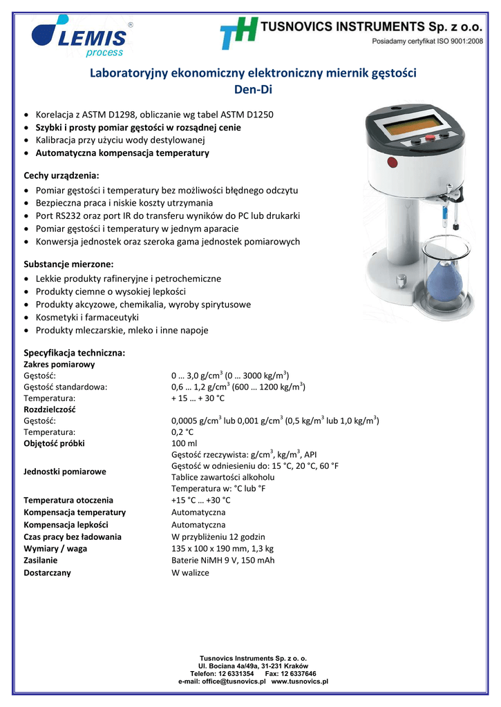 Laboratoryjny ekonomiczny elektroniczny miernik gęstości Den-Di Korelacja z ASTM D1298, obliczanie wg tabel ASTM D1250 Szybki i prosty pomiar gęstości w rozsądnej cenie Kalibracja przy użyciu wody destylowanej Automatyczna kompensacja temperatury Cechy urządzenia: Pomiar gęstości i temperatury bez możliwości błędnego odczytu Bezpieczna praca i niskie koszty utrzymania Port RS232 oraz port IR do transferu wyników do PC lub drukarki Pomiar gęstości i temperatury w jednym aparacie Konwersja jednostek oraz szeroka gama jednostek pomiarowych Substancje mierzone: Lekkie produkty rafineryjne i petrochemiczne Produkty ciemne o wysokiej lepkości Produkty akcyzowe, chemikalia, wyroby spirytusowe Kosmetyki i farmaceutyki Produkty mleczarskie, mleko i inne napoje Specyfikacja techniczna: Zakres pomiarowy Gęstość: Gęstość standardowa: Temperatura: Rozdzielczość Gęstość: Temperatura: Objętość próbki Jednostki pomiarowe Temperatura otoczenia Kompensacja temperatury Kompensacja lepkości Czas pracy bez ładowania Wymiary / waga Zasilanie Dostarczany 0 … 3,0 g/cm3 (0 … 3000 kg/m3) 0,6 … 1,2 g/cm3 (600 … 1200 kg/m3) + 15 … + 30 °C 0,0005 g/cm3 lub 0,001 g/cm3 (0,5 kg/m3 lub 1,0 kg/m3) 0,2 °C 100 ml Gęstość rzeczywista: g/cm3, kg/m3, API Gęstość w odniesieniu do: 15 °C, 20 °C, 60 °F Tablice zawartości alkoholu Temperatura w: °C lub °F +15 °C … +30 °C Automatyczna Automatyczna W przybliżeniu 12 godzin 135 x 100 x 190 mm, 1,3 kg Baterie NiMH 9 V, 150 mAh W walizce Tusnovics Instruments Sp. z o. o. Ul. Bociana 4a/49a, 31-231 Kraków Telefon: 12 6331354 Fax: 12 6337646 e-mail: [email protected] www.tusnovics.pl Zasada pomiaru: ρ = (mf ·g - P) / V·g ρ - gęstość cieczy mf – masa czystego i suchego pływaka g – przyspieszenie grawitacyjne P - siła przekazywana poprzez belkę do wagi V – objętość pływaka ρ1 , P1 - gęstość i waga powietrza ρ2 , P2 - gęstość i waga wody ρ3 , P3 - maksymalny zakres pomiarowy gęstości i wagi (2 000 kg/m³) Przygotowanie próbek Ciecze do pomiarów muszą być odgazowane, a ich temperatura nie może różnić się od temperatury otoczenia o ±5°C. Jeśli ta sama zlewka jest używana do różnych cieczy – dokładnie ją wyczyść i wysusz przed napełnieniem kolejną próbką! Dla dokładnego przygotowania próbki umieść pływak w zlewce, a następnie napełnij ją cieczą. Umieść zlewkę w wyznaczonej pozycji w urządzeniu i ustaw pływak na ramieniu pomiarowym. Upewnij się, że poziom cieczy znajduje się 2-4 mm powyżej pływaka. Teraz można wyciągnąć pływak ze zlewki i zaznaczyć poziom cieczy na zlewce w celu ułatwienia kolejnych przygotowań próbek. Przygotowanie urządzenia Przeprowadź przegląd pływaka oraz innych zanurzających się części. Muszą one być czyste i suche, bez oznak uszkodzeń. Jakiekolwiek uszkodzenie pływaka może powodować błędy pomiarów gęstości! W przypadku zabrudzenia – przemyj pływak w odpowiednim rozpuszczalniku i wysusz go. Ustaw i zdejmij pływak z ramienia pomiarowego. Zawsze zwracaj uwagę na czystość ramienia pomiarowego! Umieść urządzenie w miejscu pracy i ustaw go w pozycji pionowej (zgodnie z poziomicą) przy pomocy śrub. Włącz urządzenie i odczekaj 10 minut przed przystąpieniem do pomiarów. Dwa kroki dla wykonania pomiaru Zważenie pływaka na powietrzu... Zważenie pływaka zanurzonego w cieczy... Tusnovics Instruments Sp. z o. o. Ul. Bociana 4a/49a, 31-231 Kraków Telefon: 12 6331354 Fax: 12 6337646 e-mail: [email protected] www.tusnovics.pl