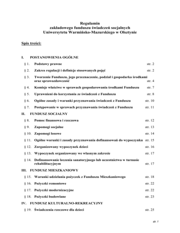 Regulamin zakładowego funduszu świadczeń socjalnych Uniwersytetu Warmińsko-Mazurskiego w Olsztynie Spis treści: I. POSTA(OWIE(IA OGÓL(E § 1. Podstawy prawne str. 2 § 2. Zakres regulacji i definicje stosowanych pojęć str. 2 § 3. Tworzenie Funduszu, jego przeznaczenie, podział i gospodarka środkami oraz sprawozdawczość str. 4 § 4. Komisje właściwe w sprawach gospodarowania środkami Funduszu str. 7 § 5. Uprawnieni do korzystania ze świadczeń z Funduszu str. 8 § 6. Ogólne zasady i warunki przyznawania świadczeń z Funduszu str. 10 § 7. Postępowanie w sprawach przyznawania świadczeń z Funduszu str. 11 II. FU(DUSZ SOCJAL(Y § 8. Pomoc finansowa i rzeczowa str. 12 § 9. Zapomogi socjalne str. 13 § 10. Zapomogi losowe str. 14 § 11. Ogólne warunki i zasady przyznawania dofinansowań do wypoczynku str. 15 § 12. Zorganizowany wypoczynek dzieci str. 16 § 13. Wypoczynek organizowany we własnym zakresie str. 17 § 14. Dofinansowanie leczenia sanatoryjnego lub uczestnictwa w turnusie rehabilitacyjnym str. 17 III. FU(DUSZ MIESZKA(IOWY § 15. Warunki udzielania pożyczek z Funduszu Mieszkaniowego str. 18 § 16. Pożyczki remontowe str. 22 § 17. Pożyczki modernizacyjne str. 22 § 18. Pożyczki budowlane str. 23 IV. FU(DUSZ KULTURAL(O-REKREACYJ(Y § 19. Świadczenia rzeczowe dla dzieci str. 25 str. 1 § 20. Dofinansowanie działalności kulturalnej i sportowo-rekreacyjnorehabilitacyjnej V. str. 25 FU(DUSZ OBIEKTÓW SOCJAL(YCH § 21. Zakładowe obiekty socjalne str. 26 § 22. Zasady przyznawania turnusów str. 27 § 23. Zasady wypożyczania łodzi żaglowych na dni str. 28 VI. FU(DUSZ PROGRAMU EMERYTAL(EGO § 24. Pracowniczy Program Emerytalny str. 28 VII. POSTA(OWIE(IA KOŃCOWE § 25. Tryb wprowadzenia Regulaminu. Przepisy przejściowe str. 29 VIII. ZAŁĄCZ(IKI I. POSTA(OWIE(IA OGÓL(E §1 Podstawy prawne 1. Podstawę prawną Regulaminu zakładowego funduszu świadczeń socjalnych, zwanego dalej Regulaminem, stanowią: 1) art. 8 ust. 2 ustawy z dnia 4 marca 1994 r. o zakładowym funduszu świadczeń socjalnych (j.t. Dz. U. z 2012 r. poz. 592 z późn. zm.), 2) art. 27 ust. 1 ustawy z dnia 23 maja 1991 r. o związkach zawodowych (j.t. Dz. U. z 2001 r. Nr 79, poz. 854 z późn. zm.). 2. Regulamin został opracowany z uwzględnieniem także innych przepisów prawa powszechnie obowiązującego, takich jak: 1) ustawa z dnia 27 lipca 2005 r. – Prawo o szkolnictwie wyższym (j.t. Dz. U. z 2012 r. poz. 572 z późn. zm.), 2) ustawa z dnia 26 czerwca 1974 r. – Kodeks pracy (j.t. Dz. U. z 1998 r. Nr 21, poz. 94 z późn. zm.), 3) ustawa z dnia 20 kwietnia 2004 r. o pracowniczych programach emerytalnych (Dz. U. Nr 116, poz. 1207 z późn. zm.), 4) ustawa z dnia 26 lipca 1991 r. o podatku dochodowym od osób fizycznych (j.t. Dz. U. z 2012 r. poz. 361 z późn. zm.). §2 Zakres regulacji i definicje stosowanych pojęć 1. Regulamin określa: 1) osoby uprawnione do korzystania z pomocy i świadczeń z Funduszu, 2) cele i rodzaje działalności socjalnej, na które przeznacza się środki Funduszu, 3) zasady i warunki korzystania z pomocy i świadczeń finansowanych z Funduszu. str. 2 2. Użyte w Regulaminie określenia oznaczają: 1) były pracownik Uczelni – były pracownik jednego z zakładów pracy: a) Uniwersytetu Warmińsko-Mazurskiego w Olsztynie lub b) Akademii Rolniczo-Technicznej im. Michała Oczapowskiego w Olsztynie lub c) Wyższej Szkoły Pedagogicznej w Olsztynie lub d) Warmińskiego Instytutu Teologicznego w Olsztynie lub e) Rolniczego Zakładu Doświadczalnego w Łężanach, który podczas zatrudnienia w tym zakładzie pracy nabył uprawnienia do: (1) emerytury lub renty albo (2) świadczenia przedemerytalnego albo (3) świadczenia pielęgnacyjnego z tytułu rezygnacji z zatrudnienia w celu sprawowania opieki nad osobą legitymującą się orzeczeniem o niepełnosprawności, i dla którego wymieniony zakład był ostatnim miejscem pracy przed skorzystaniem z tych uprawnień; 2) Fundusz – zakładowy fundusz świadczeń socjalnych Uniwersytetu WarmińskoMazurskiego w Olsztynie; 3) kryterium dochodowe – główne z przyjmowanych w Regulaminie kryteriów, uzależniające wysokości przyznawanych świadczeń z Funduszu od sytuacji materialnej osoby ubiegającej się o przyznanie świadczeń i osób pozostających z nią we wspólnym gospodarstwie domowym w ten sposób, że osoby znajdujące się w gorszej sytuacji materialnej otrzymują świadczenia w wyższej wysokości. Odzwierciedleniem kryterium dochodowego jest odpowiednia konstrukcja tabel dofinansowania i wysokości świadczeń, przysługujących osobom uprawnionym, zamieszczonych w załącznikach do niniejszego Regulaminu; 4) kryterium socjalne – wartość kwotowa, określona w art. 8 ust. 1 pkt. 1 ustawy z dnia 12 czerwca 2004 r. o pomocy społecznej (j.t. Dz. U. z 2013 r. poz. 182 z późn. zm.) jako kryterium dochodowe osoby samotnie gospodarującej, której wysokość wynika z aktów wydanych na podstawie art. 9 ust. 7 i 8 wymienionej ustawy. Wyróżnia się miesięczne kryterium socjalne – zdefiniowane powyżej oraz roczne kryterium socjalne, będące 12-krotnością kryterium miesięcznego. Przyjmuje się, że wysokość kryterium na dzień 1 stycznia danego roku obowiązuje przez cały rok; 5) najbliższy członek rodziny – współmałżonek, dzieci własne, dzieci przysposobione oraz przyjęte na wychowanie w ramach rodziny zastępczej (na podstawie orzeczenia sądowego), rodzice i teściowie; 6) ogłoszenie w sposób zwyczajowo przyjęty – podanie do wiadomości informacji lub ogłoszenie dokumentu na tablicy ogłoszeń Biura ds. Socjalnych, stronie internetowej BIP Uczelni bądź pocztą mailową rozesłaną do wszystkich jednostek organizacyjnych i wszystkich osób uprawnionych, które udostępniły adresy poczty elektronicznej; 7) osoby dodatkowo objęte opieką Funduszu – osoby, a) dla których Fundacja im. Michała Oczapowskiego w Olsztynie była ostatnim miejscem pracy przed skorzy