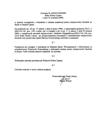 -= Uchwa³aNr XXXIV /240/2009 RadyGminy Lipusz z dnia 10wrzeœnia 2009r. w sprawiewyst¹pienia z wnioskiem o zmianê urzêdowejnazwy miejscowoœciSmolnik na Rzymw Gminie Lipusz Na podstawieart. 18 ust. 15 ustawyz dnia 8 marca 199Or.o samorz¹dziegminnym!Dz.U. z 2001r.Nr 142 poz. 1591z póŸn.zm/ w zwi¹zku z art. 8 ust. 1 i 2 ustawyz dnia 29 sierpnia 2003r.o urzêdowychnazwachmiejscowoœci i obiektów fizjograficznych/Dz.U.Nr 166,poz. 1612/ RadaGminy Lipusz po przeprowadzeniukonsultacji z mieszkañcamimiejscowoœci Smolnikorazpozytywnejopinii StarostyKoœcierskiego uchwalaco nastêpuje: §1 Postanawiasiê wyst¹piæz wnioskiem do Ministra Spraw Wewnêtrznychi Administracji za poœrednictwem Wojewody Pomorskiegoo dokonaniezmiany nazwy miejscowoœciSmo1nik na Rzym.Treœæ wniosku stanowiza³¹cznik do uchwa³y. §2 Wykonanieuchwa³ypowierzasiê W6jtowi Gminy Lipusz. §3 Uchwa³awchodziw ¿yciez dniempodjêcia. Przewodni~ Gminy r Wawer I' Uzasadnienie MieszkañcymiejscowoœciSmolnik wyst¹pili z wnioskiem o zmianê nazwy na Rzym. Uchwa³¹ Nr XXX/220/2009 z dnia 22.05.2009rRada Gminy postanowi³aprzeprowadziæ konsultacje spo³ecznedotycz¹ce zmiany nazwy osady Smolnik na Rzym. Konsultacje przeprowadzonaw dniach 01.06. do 05.06.2009rprzy pomocy kart konsultacyjnych,na których wszyscy mieszkañcy posiadaj¹cy prawo wyborcze wypowiedzieli siê za zmian¹ nazwy.Pozytywn¹ opiniê w sprawiezmianywyrazi³ równie¿StarostaKoœcierski.W zwi¹zku z po~zym postanowionoprzychyliæsiê do woli mieszkañcówi zaproponowaæ Radzie Gminy wyst¹pieniez wnioskiemw sprawiedo Ministra SprawWewnêtrznychi Administracji za poœrednictwem Wojewody Pomorskiegoo zmianê nazwy osady Smolnik na Rzym w obrêbiegeodezyjnymŒluzaGmina Lipusz . PRl Z¥CY y , er Za³¹cznik do Uchwa³yNr XXXN/240/2009 RadyGminy Lipusz z dnia 10 wrzeœnia 2009r Lipusz, dnia Projekt AO.RG. Pan GrzegorzSchetyna Minister SprawWewnêtrznych i Administracji za poœrednictwem WojewodyPomorskiego Wniosek RadaGminy Lipusz na podstawieart.8 ust 2 ustawyz dnia 29 sierpnia2003ro urzêdowychnazwachmiejscowoœci i obiektówfizjograficznych/Dz.U.Nr 166poz. 1612oraz z 2005rNr 17 poz. 141/zwracasiê o dokonanieZInianynazwymiejscowoœci Smolnik osada. na Rzym. Uzasadnienie MieszkañcymiejscowoœciSmo1nikos. wyst¹pili w dniu 12.01.2009rz wnioskiemdo RadyGminy Lipusz o przedstawieniewnioskuw sprawiezmianyurzêdowejnazwy miejscowoœci losadyl Smolnik le¿¹cejw obrêbieso³ectwaŒluzana nazwêRzym. W zwi¹zku z po~zym na podstawieuchwa³yNr XXVl/185/2009 Rady Gminy Lipuszz dnia 04.02.2009r.w sprawieustalenia zasadi trybu przeprowadzania konsultacjispo³ecznych w GminieLipusz /Dz.Urz. Woj. PomorskiegoNr 53 poz. 1003z dnia 09.04.2009rRada Gminy Lipusz w dniu 22.05.2009rpodjê³auchwa³êNr XXX/220/2009w sprawie przeprowadzenia konsultacjispo³ecznejdotycz¹cejzmianynazwyosadySmo1nikw Gminie Lipusz. Obecniemiejscowoœæ Smolnik zamieszkuje7 mieszkañcówz tego 5 posiadaprawo wyborcze.Konsultacjespo³ecznezosta³yprzeprowadzone w dniach01.06do 05.06.2009r.przy pomocykart konsultacyjnych,na których wszyscymieszkañcy wypowiedzieliza zmian¹ nazwy Smolnik na Rzym,udzielaj¹c odpowiedziTAK i potwierdzaj¹cten fakt w³asnorêcznympodpisem.Nie udzielonoodpowiedziprzeciwnych oraznie mamzdania. Zmiananazwymiejscowoœci Smo1nikna Rzym uzyska³arównie¿pozytywn¹ opiniê Starosty Koœcierskiego Ipismo GGN-OD.7430/2/09z dnia 27 lipca 2009r.1 Nazwamiejscowoœci Smo1niknie figuruje na ¿adnychznanychtut. Urzêdowi Gminy mapach, natomiastwystêpujenazwaRzym, którajest stosowanaprzezwiêkszoœæ mieszkañcóww codziennychkomunikacjach,zmiananazwyusankcjonowa³aby zatemstannieformalny. Jakpodkreœlaj¹ we wniosku mieszkañcycyt. "zmiananazwy urzêdowejSmolnik na Rzym ocali³abyczêœæ lokalnej tradycji nazewniczej,bêd¹cejelementemlokalnej kultury". w zwi¹zku z pO' simy o pozytywne rozpatrzeniewniosku i zmianênazwy wyzszympro miejscowoœci. Infonnaciao kosztachfinansowychworowadzeniazmian. Przewidujesiê, ¿ena skutekwprowadzeniazmianyw wykazieurzêdowychnazw miejscowoœci, polegaj¹cejna zmianienazwy ze Smolnikna Rzym zajdziekoniecmoœæ wymiany 5 dowodówosobistych,ok. 7 dowodówrejestracyjnychi 5 prawjazdy Kosztwymiany dowodówrejestracyjnychto 504,00z³ /7 x 72 z³!, prawjazdy 350,00/ 5 x.70,00/ op³aty za wydanienowych dowodówosobistychnie bêd¹ pobierane,zgodniez ustaw¹ z dnia 9 stycznia2009r.o zmianieustawyo ewidencjiludnoœcii dowodachosobistych/Dz.U.Nr 39 poz. 306/. Za³¹czniki: 1. Uchwa³aRadyGminy Lipusz w sprawiewyst¹pieniaz wnioskiemo zmianênazwy miejscowoœci osadaSmolnik na Rzym. 2. Protokó³z przeprowadzonejkonsultacjispo³ecznejw sprawiezmiany nazwymiejscowoœci osadaSmolnikna Rzym. 3. Pozytywnaopinia StarostyKoœcierskiego w sprawiezmianynazwy miejscowoœci. 4. Mapatopograficznaz zaznaczon¹miejscowoœci¹. PRZEWODNICZ¥CY ::;;~;E~~~~;?~ '7" w.",., ')