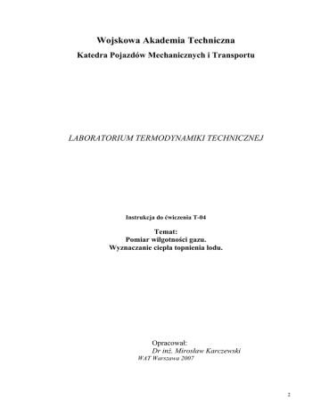 Wojskowa Akademia Techniczna Katedra Pojazdów Mechanicznych i Transportu LABORATORIUM TERMODYNAMIKI TECHNICZNEJ Instrukcja do ćwiczenia T-04 Temat: Pomiar wilgotności gazu. Wyznaczanie ciepła topnienia lodu. Opracował: Dr inż. Mirosław Karczewski WAT Warszawa 2007 2 1. Pomiar wilgotności gazu. 1.1. Powietrze wilgotne - wprowadzenie. Powietrze jest przykładem roztworu gazowego, w którym jednym ze składników jest para wodna. Mianem wilgotności powietrza określa się zawartość pary wodnej w powietrzu. Para wodna w powietrzu pochodzi z parowania zachodzącego ze swobodnych powierzchni wodnych i powierzchni lądowych (gruntu, roślinności...). Ze względu na skomplikowany charakter zależności wilgotności powietrza od temperatury powietrza, stosuje się szereg różnych miar, charakteryzujących wilgotność Ilość pary wodnej w powietrzu wilgotnym przy ustalonym ciśnieniu i temperaturze jest zmienna, stąd, aby określić stan powietrza wilgotnego należy podać zawartość wilgoci. Do tego celu służą następujące wielkości: Prężnością pary wodnej: określa ciśnienie parcjalne (cząstkowe), wywierane przez parę wodną w powietrzu. Jednostką pomiaru jest hPa. Można to wyobrazić sobie jako różnicę ciśnienia w zamkniętej objętości powietrza i bez zmiany jego temperatury przed i po całkowitym usunięciu z tej objętości znajdującej się pary wodnej. Nie można zmieszać dowolnej ilości pary wodnej z dowolną ilością powietrza (tak, jak to można zrobić na przykład z azotem i tlenem). Ilość pary wodnej, która znaleźć się może w powietrzu (rozpuścić w powietrzu) zależy od jego temperatury. Im wyższa temperatura, tym więcej pary wodnej może "rozpuścić się" w powietrzu. Maksymalną ilość pary wodnej, jaką jest w stanie zawierać powietrze w danej temperaturze określa się mianem prężności maksymalnej lub prężnością pary nasyconej i oznacza zazwyczaj symbolem E. Wartości E w funkcji temperatury powietrza przedstawia tabela poniżej (tab. 1). Tab.1. Wartości prężności maksymalnej pary wodnej (hPa) w funkcji temperatury powietrza (°C) t (°C) E (hPa) t (°C) E (hPa) 50 123,3 0 6,11 45 95,77 -5 4,21 40 73,72 -10 2,68 35 56,20 -15 1,90 30 42,41 -20 1,25 25 31,66 -25 0,80 20 23,27 -30 0,50 15 17,05 -35 0,309 10 12,28 -40 0,185 5 8,72 -45 0,108 Na podstawie tabeli 1 można stwierdzić, że zależność E = f(t) jest silnie nieliniowa. W niskich temperaturach już minimalna ilość pary wodnej nasyca powietrze natomiast w wysokich temperaturach do nasycenia powietrza potrzeba bardzo dużo pary wodnej. Prężność pary wodnej, jaka występuje w danej chwili w powietrzu nazywa się prężnością aktualną i oznacza zazwyczaj symbolem e. Prężność aktualna w atmosferze zmienia się stosunkowo powoli, aby wzrosła, musi wzrosnąć również zawartość pary w powietrzu. Proces parowania, który dostarcza pary wodnej do powietrza jest procesem energochłonnym, przez to powolnym. Zmniejszenie zawartości pary wodnej w powietrzu jest związane z wystąpieniem procesów kondensacji. Różnicę, między prężnością maksymalną (E) w temperaturze powietrza, w której została zmierzona prężność aktualna a wartością prężności aktualnej (e), wyrażona w hPa: 3 d = E - e [hPa] (1) określa się mianem niedosytu wilgotności, który informuje o tym, ile jednostek prężności potrzeba do całkowitego nasycenia danego powietrza. Od wartości niedosytu wilgotności zależy między innymi prędkość zachodzących procesów parowania, im jest on większy, tym parowanie jest szybsze. Wartość prężności aktualnej nie jest miarą wystarczająco poglądową, informacja, że np. prężność aktualna równa jest 5 hPa, bez znajomości temperatury powietrza i precyzyjnej znajomości E = f(t), niewiele jeszcze mówi. Z tego względu powszechnie używa się kolejnej miary wilgotności powietrza, jaką jest wilgotność względna (oznaczana najczęściej jako ϕ), która jest definiowana jako: ϕ= (e/E) * 100 [%] (2) określa w jakim procencie, w stosunku do maksymalnie możliwego w danej temperaturze (tj. temperaturze, w której zmierzono e) powietrze jest nasycone parą wodną. Zauważmy, że w różnych temperaturach powietrza taka sama wartość wilgotności względnej (np. 50%) będzie oznaczała zupełnie rożne ilości pary wodnej znajdującej się w powietrzu. Przykładowo wilgotność względna 50% w temperaturze 0°C wystąpi przy e = 3.05 hPa, w temperaturze +20°C przy e = 11.7 hPa. Zmiany wilgotności powietrza wraz ze zmianami temperatury można przedstawić na przykładzie. W powietrzu, które ma temperaturę 20°C zmierzono wartość e = 12.3 hPa. Obniżamy temperaturę tego powietrza do 0°C. W takim razie e = 12.3, zaś wartość prężności maksymalnej jest taka, jaka wynika z temperatury tego powietrza (20°C; E = 23.4 (tabela 1), co oznacza, że wilgotność względna wynosi ~52.6% (12.3 / 23.4). Przy obniżeniu temperatury do 15°C wilgotność względna tego powietrza wzrośnie do 72.3% (12.3 / 17.0), przy dalszym obniżeniu temperatury, do 10°C wartość prężności maksymalnej E zrównała się z wartością prężności aktualnej e (e = E) i wilgotność względna osiągnęła wartość 100% (12.3 / 12.3), czyli powietrze jest już całkowicie nasycone parą wodną (osiągnęło stan "roztworu nasyconego"). Dalszy spadek temperatury powietrza powoduje przejście powietrza w stan przesycenia, który spowoduje, że cały nadmiar ilości pary wodnej ponad wartość E wynikający z nowej, obniżonej temperatury powietrza ulegnie kondensacji. W powietrzu pojawią się mikrokrople wody, występujące w całej jego objętości, które tworzyć będą roztwór koloidalny wody w powietrzu. Temperatura, do której należy schłodzić powietrze, aby przy danej prężności aktualnej wilgotność względna osiągnęła 100% i rozpoczęły się w nim procesy kondensacji nosi nazwę temperatury punktu rosy. Temperat