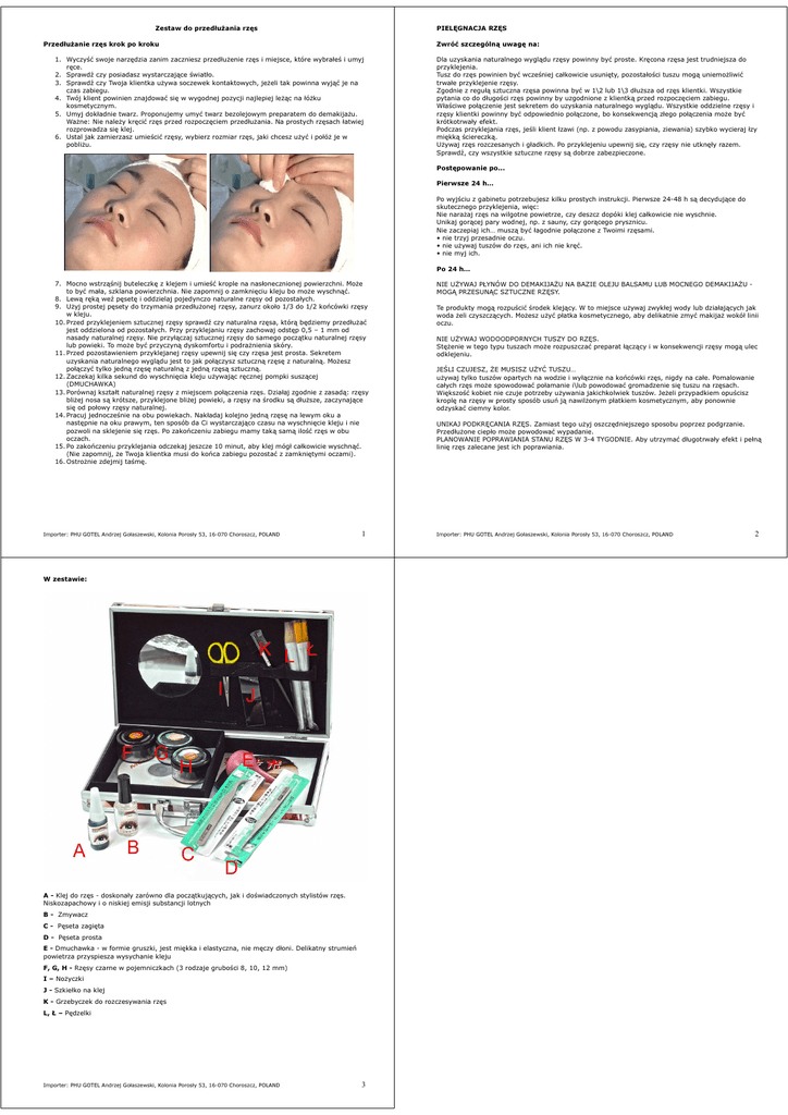 PIELĘGNACJA RZĘS Zestaw do przedłużania rzęs Zwróć szczególną uwagę na: Przedłużanie rzęs krok po kroku 1. Wyczyść swoje narzędzia zanim zaczniesz przedłużenie rzęs i miejsce, które wybrałeś i umyj ręce. 2. Sprawdź czy posiadasz wystarczające światło. 3. Sprawdź czy Twoja klientka używa soczewek kontaktowych, jeżeli tak powinna wyjąć je na czas zabiegu. 4. Twój klient powinien znajdować się w wygodnej pozycji najlepiej leżąc na łóżku kosmetycznym. 5. Umyj dokładnie twarz. Proponujemy umyć twarz bezolejowym preparatem do demakijażu. Ważne: Nie należy kręcić rzęs przed rozpoczęciem przedłużania. Na prostych rzęsach łatwiej rozprowadza się klej. 6. Ustal jak zamierzasz umieścić rzęsy, wybierz rozmiar rzęs, jaki chcesz użyć i połóż je w pobliżu. Dla uzyskania naturalnego wyglądu rzęsy powinny być proste. Kręcona rzęsa jest trudniejsza do przyklejenia. Tusz do rzęs powinien być wcześniej całkowicie usunięty, pozostałości tuszu mogą uniemożliwić trwałe przyklejenie rzęsy. Zgodnie z regułą sztuczna rzęsa powinna być w 1\2 lub 1\3 dłuższa od rzęs klientki. Wszystkie pytania co do długości rzęs powinny by uzgodnione z klientką przed rozpoczęciem zabiegu. Właściwe połączenie jest sekretem do uzyskania naturalnego wyglądu. Wszystkie oddzielne rzęsy i rzęsy klientki powinny być odpowiednio połączone, bo konsekwencją złego połączenia może być krótkotrwały efekt. Podczas przyklejania rzęs, jeśli klient łzawi (np. z powodu zasypiania, ziewania) szybko wycieraj łzy miękką ściereczką. Używaj rzęs rozczesanych i gładkich. Po przyklejeniu upewnij się, czy rzęsy nie utknęły razem. Sprawdź, czy wszystkie sztuczne rzęsy są dobrze zabezpieczone. Postępowanie po... Pierwsze 24 h… Po wyjściu z gabinetu potrzebujesz kilku prostych instrukcji. Pierwsze 24-48 h są decydujące do skutecznego przyklejenia, więc: Nie narażaj rzęs na wilgotne powietrze, czy deszcz dopóki klej całkowicie nie wyschnie. Unikaj gorącej pary wodnej, np. z sauny, czy gorącego prysznicu. Nie zaczepiaj ich… muszą być łagodnie połączone z Twoimi rzęsami. • nie trzyj przesadnie oczu. • nie używaj tuszów do rzęs, ani ich nie kręć. • nie myj ich. Po 24 h… 7. Mocno wstrząśnij buteleczkę z klejem i umieść krople na nasłonecznionej powierzchni. Może to być mała, szklana powierzchnia. Nie zapomnij o zamknięciu kleju bo może wyschnąć. 8. Lewą ręką weź pęsetę i oddzielaj pojedynczo naturalne rzęsy od pozostałych. 9. Użyj prostej pęsety do trzymania przedłużonej rzęsy, zanurz około 1/3 do 1/2 końcówki rzęsy w kleju. 10. Przed przyklejeniem sztucznej rzęsy sprawdź czy naturalna rzęsa, którą będziemy przedłużać jest oddzielona od pozostałych. Przy przyklejaniu rzęsy zachowaj odstęp 0,5 – 1 mm od nasady naturalnej rzęsy. Nie przyłączaj sztucznej rzęsy do samego początku naturalnej rzęsy lub powieki. To może być przyczyną dyskomfortu i podrażnienia skóry. 11. Przed pozostawieniem przyklejanej rzęsy upewnij się czy rzęsa jest prosta. Sekretem uzyskania naturalnego wyglądu jest to jak połączysz sztuczną rzęsę z naturalną. Możesz połączyć tylko jedną rzęsę naturalną z jedną rzęsą sztuczną. 12. Zaczekaj kilka sekund do wyschnięcia kleju używając ręcznej pompki suszącej (DMUCHAWKA) 13. Porównaj kształt naturalnej rzęsy z miejscem połączenia rzęs. Działaj zgodnie z zasadą: rzęsy bliżej nosa są krótsze, przyklejone bliżej powieki, a rzęsy na środku są dłuższe, zaczynające się od połowy rzęsy naturalnej. 14. Pracuj jednocześnie na obu powiekach. Nakładaj kolejno jedną rzęsę na lewym oku a następnie na oku prawym, ten sposób da Ci wystarczająco czasu na wyschnięcie kleju i nie pozwoli na sklejenie się rzęs. Po zakończeniu zabiegu mamy taką samą ilość rzęs w obu oczach. 15. Po zakończeniu przyklejania odczekaj jeszcze 10 minut, aby klej mógł całkowicie wyschnąć. (Nie zapomnij, że Twoja klientka musi do końca zabiegu pozostać z zamkniętymi oczami). 16. Ostrożnie zdejmij taśmę. Importer: PHU GOTEL Andrzej Gołaszewski, Kolonia Porosły 53, 16-070 Choroszcz, POLAND 1 W zestawie: A - Klej do rzęs - doskonały zarówno dla początkujących, jak i doświadczonych stylistów rzęs. Niskozapachowy i o niskiej emisji substancji lotnych B - Zmywacz C - Pęseta zagięta D - Pęseta prosta E - Dmuchawka - w formie gruszki, jest miękka i elastyczna, nie męczy dłoni. Delikatny strumień powietrza przyspiesza wysychanie kleju F, G, H - Rzęsy czarne w pojemniczkach (3 rodzaje grubości 8, 10, 12 mm) I – Nożyczki J - Szkiełko na klej K - Grzebyczek do rozczesywania rzęs L, Ł – Pędzelki Importer: PHU GOTEL Andrzej Gołaszewski, Kolonia Porosły 53, 16-070 Choroszcz, POLAND 3 NIE UŻYWAJ PŁYNÓW DO DEMAKIJAŻU NA BAZIE OLEJU BALSAMU LUB MOCNEGO DEMAKIJAŻU MOGĄ PRZESUNĄC SZTUCZNE RZĘSY. Te produkty mogą rozpuścić środek klejący. W to miejsce używaj zwykłej wody lub działających jak woda żeli czyszczących. Możesz użyć płatka kosmetycznego, aby delikatnie zmyć makijaż wokół linii oczu. NIE UŻYWAJ WODOODPORNYCH TUSZY DO RZĘS. Stężenie w tego typu tuszach może rozpuszczać preparat łączący i w konsekwencji rzęsy mogą ulec odklejeniu. JEŚLI CZUJESZ, ŻE MUSISZ UŻYĆ TUSZU… używaj tylko tuszów opartych na wodzie i wyłącznie na końcówki rzęs, nigdy na całe. Pomalowanie całych rzęs może spowodować połamanie i\lub powodować gromadzenie się tuszu na rzęsach. Większość kobiet nie czuje potrzeby używania jakichkolwiek tuszów. Jeżeli przypadkiem opuścisz kroplę na rzęsy w prosty sposób usuń ją nawilżonym płatkiem kosmetycznym, aby ponownie odzyskać ciemny kolor. UNIKAJ PODKRĘCANIA RZĘS. Zamiast tego użyj oszczędniejszego sposobu poprzez podgrzanie. Przedłużone ciepło może powodować wypadanie. PLANOWANIE POPRAWIANIA STAN